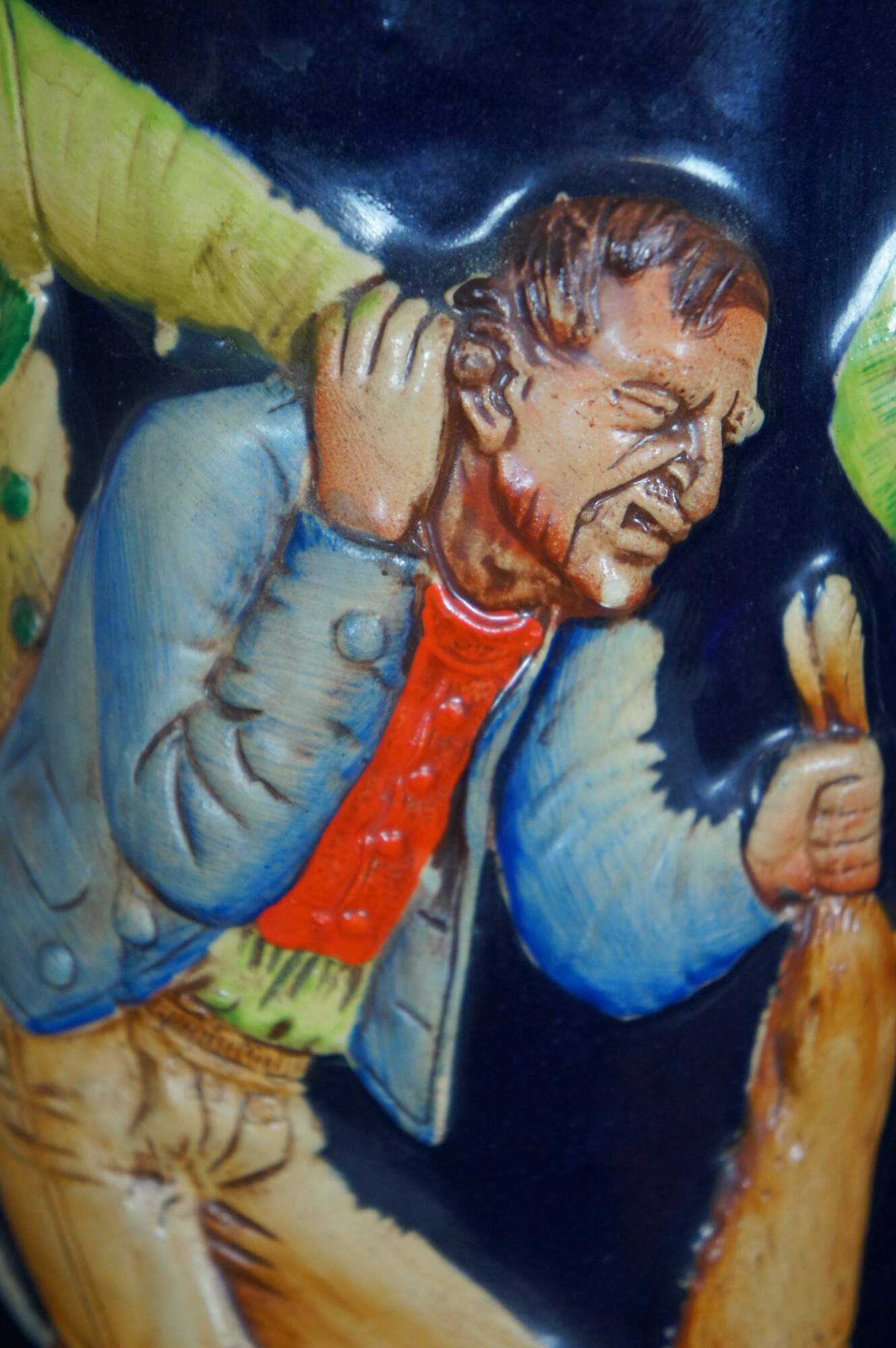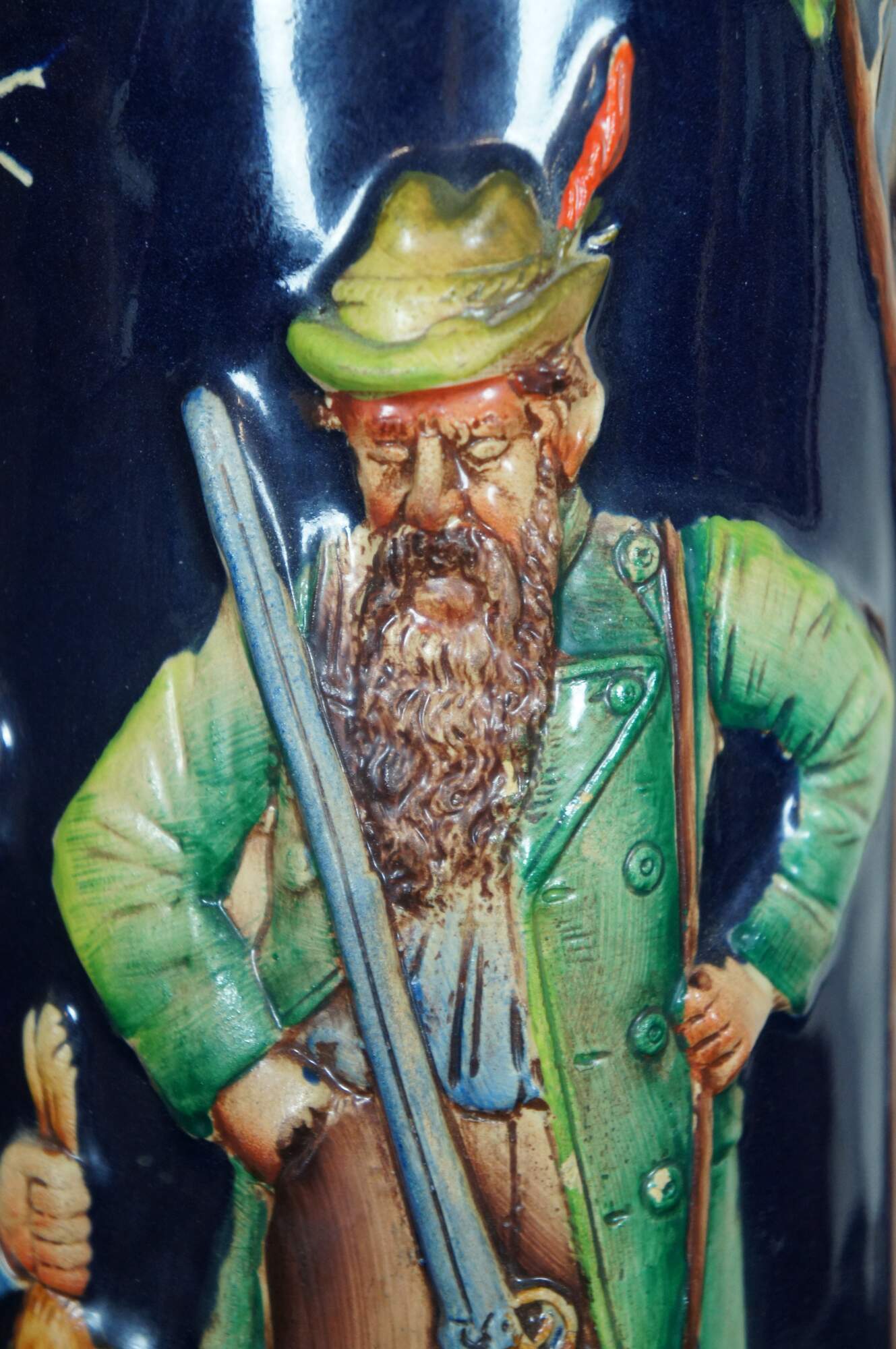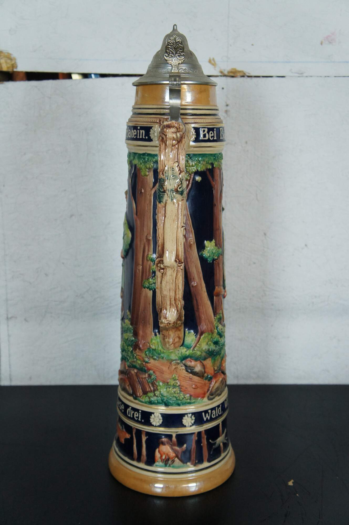 Oversized German five liter stein, lidded mug or tankard featuring a hunt theme with two men holding shotguns while another carries a rabbit. Adorned with foxes, dogs / hounds and forest designs.