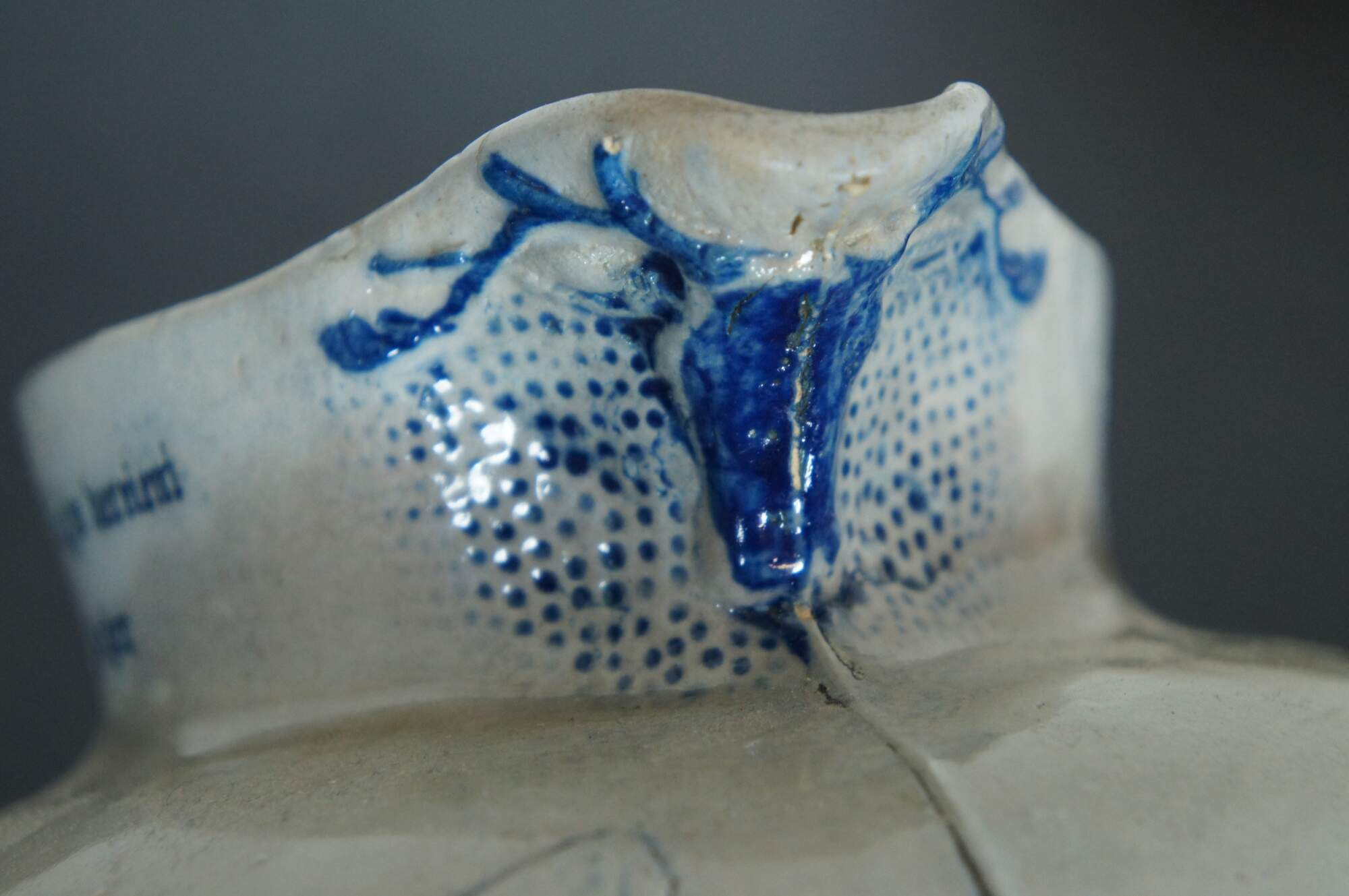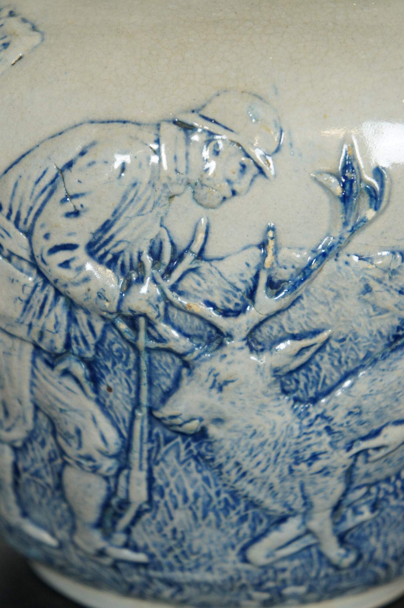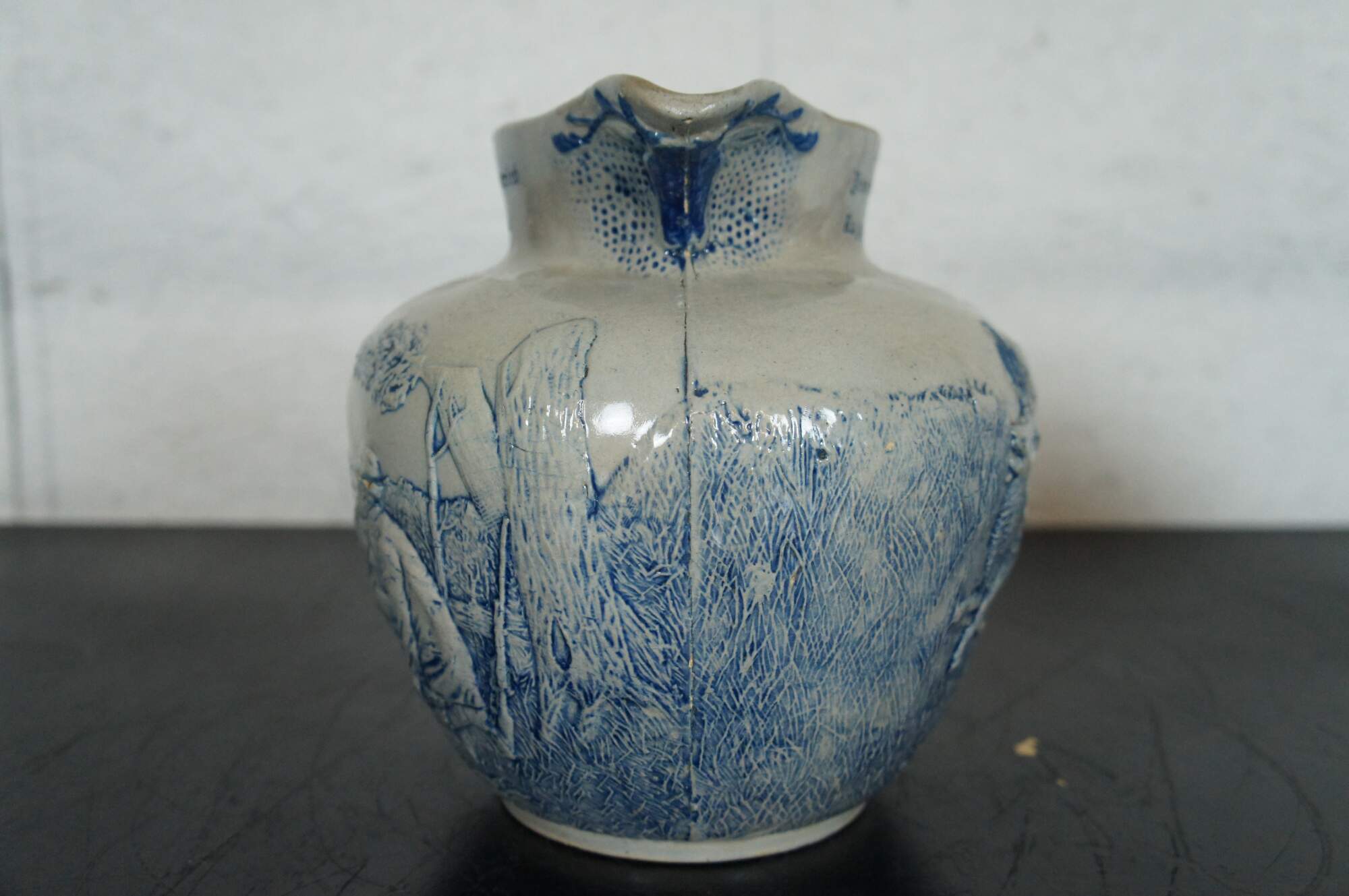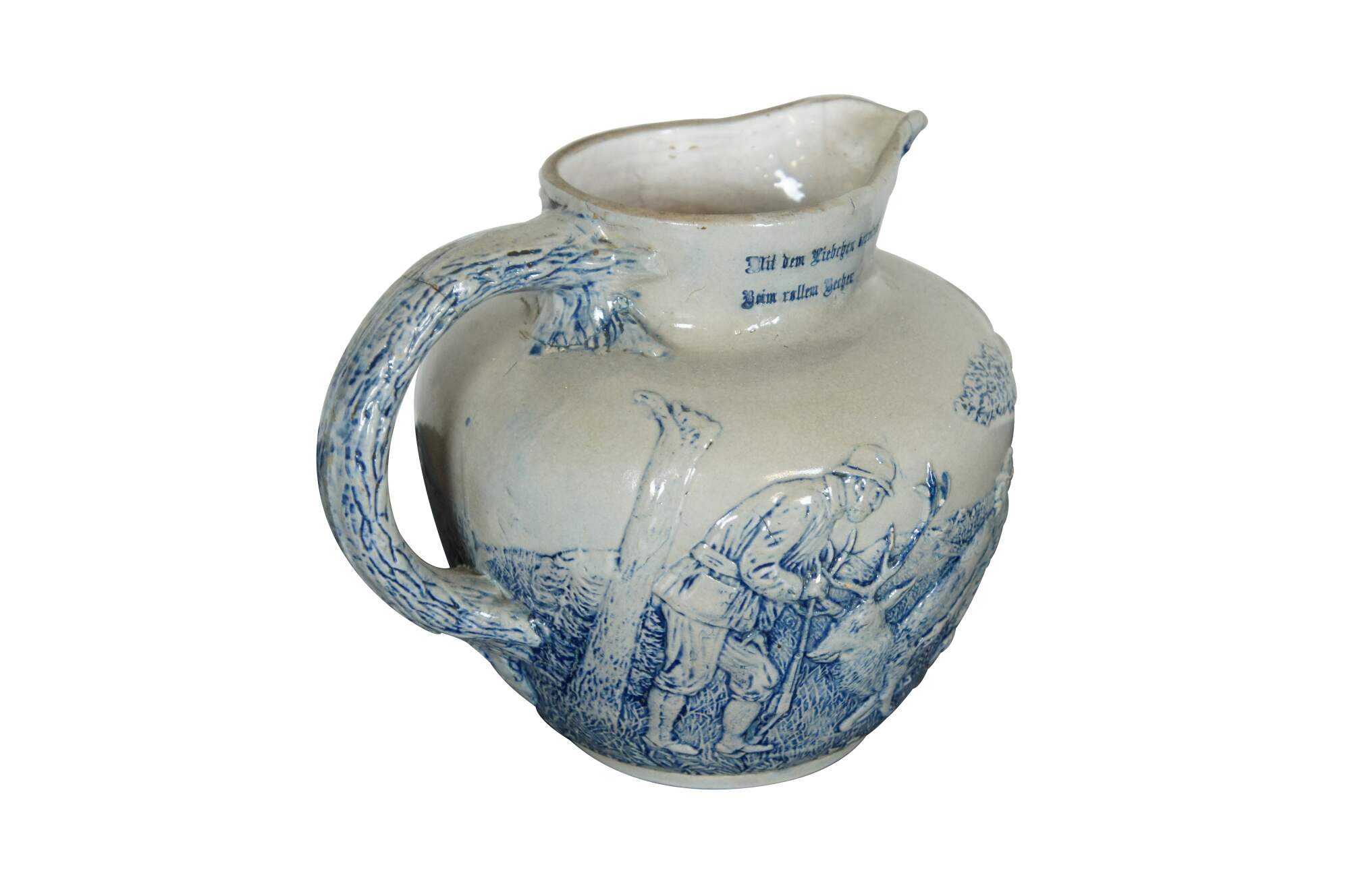 An antique White Utica Salt Glaze pitcher with German Hunt Scene. Text reads: Dieses sind Stunden Am zn gesuuden. / Mit dem Liebchen vereient Brim rollem Becher. Translation "Prepare this for your loved one at the rolling search and These are hours to heal"