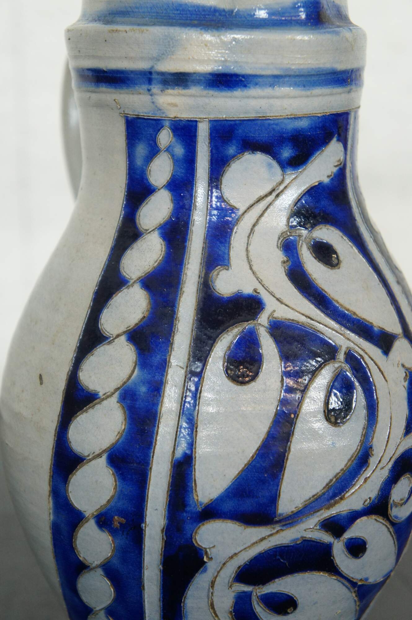 Two antique 19th century German Westerwald cobalt blue salt glaze creamer pitchers / beer steins / jugs featuring pewter lids and floral / leaf motif. 1.5L. Birnkrug.