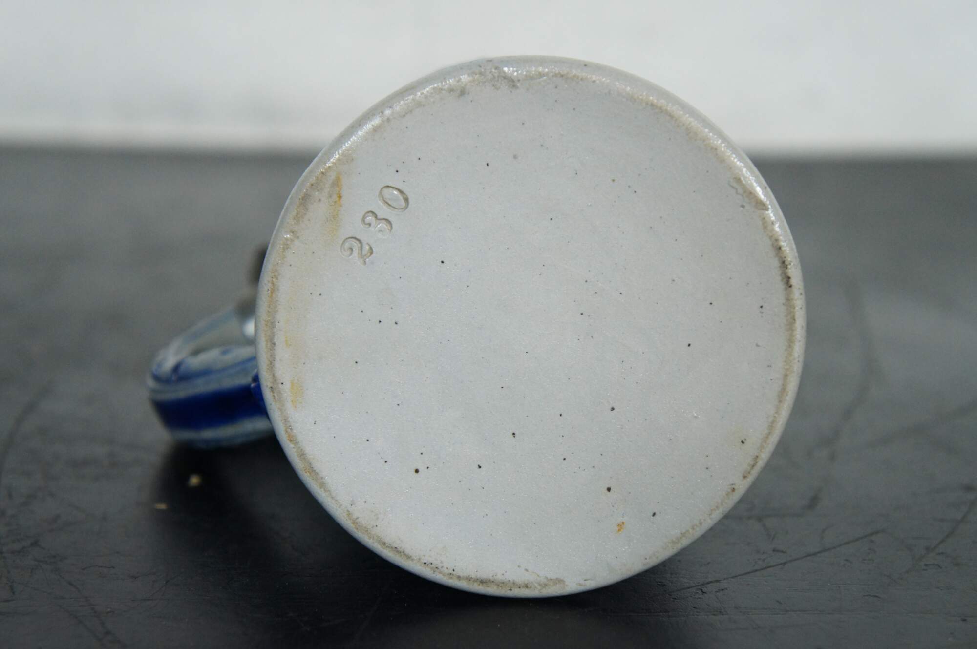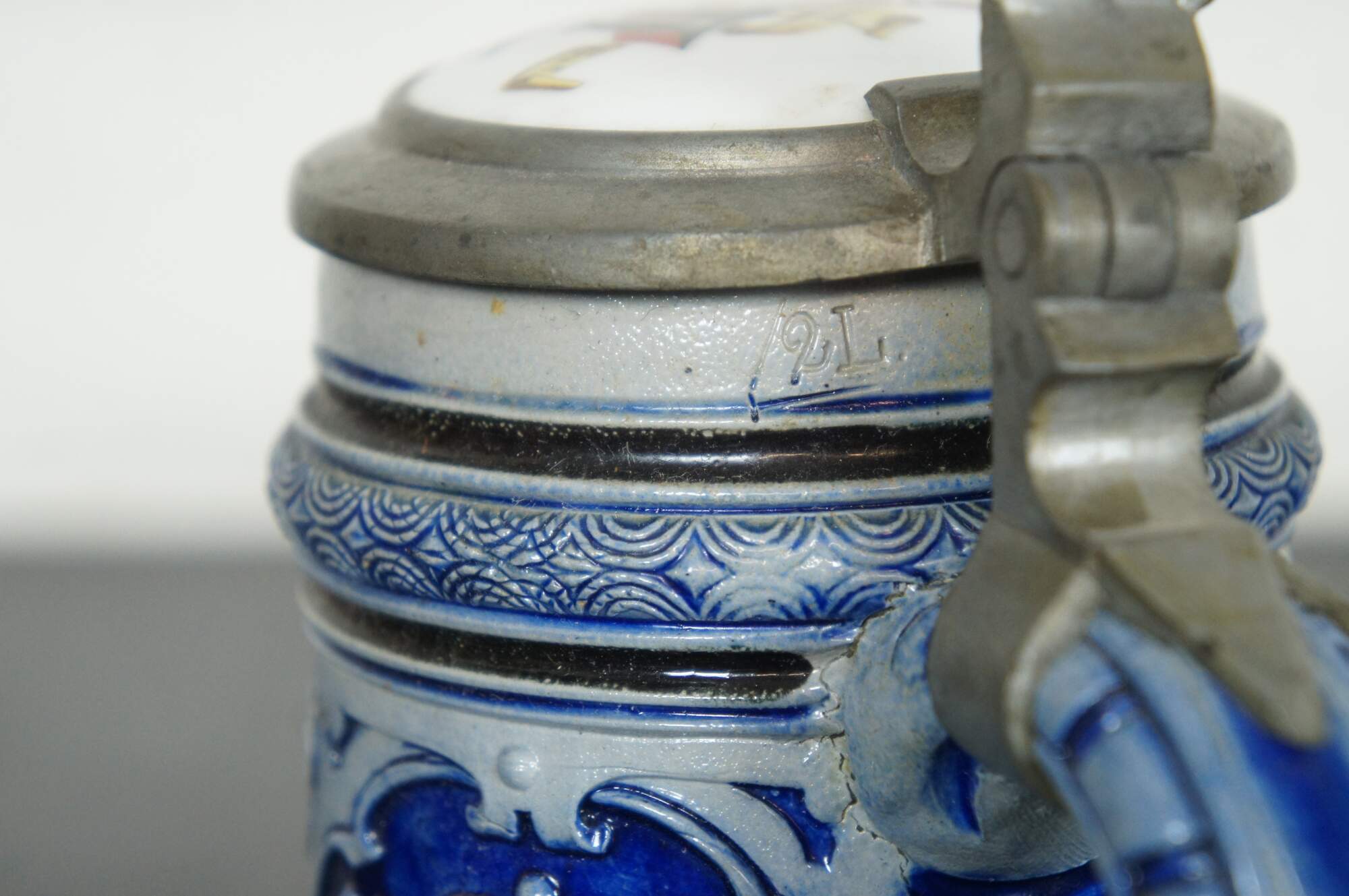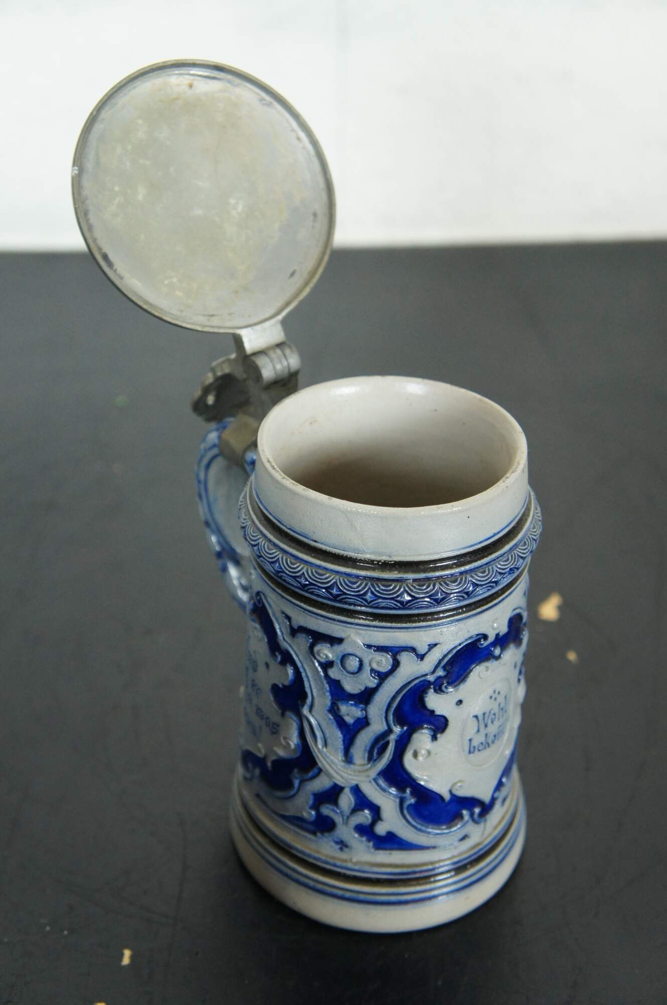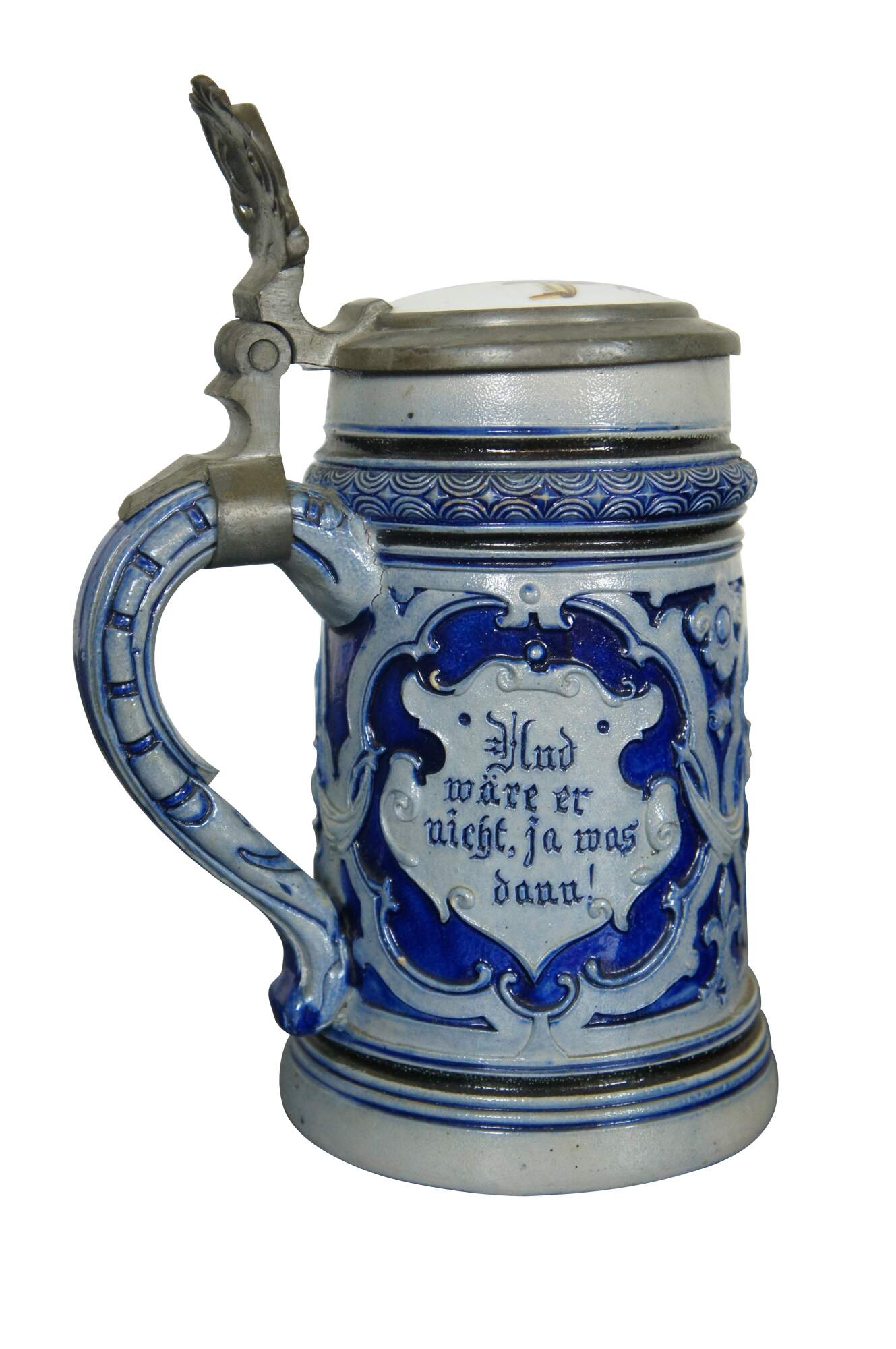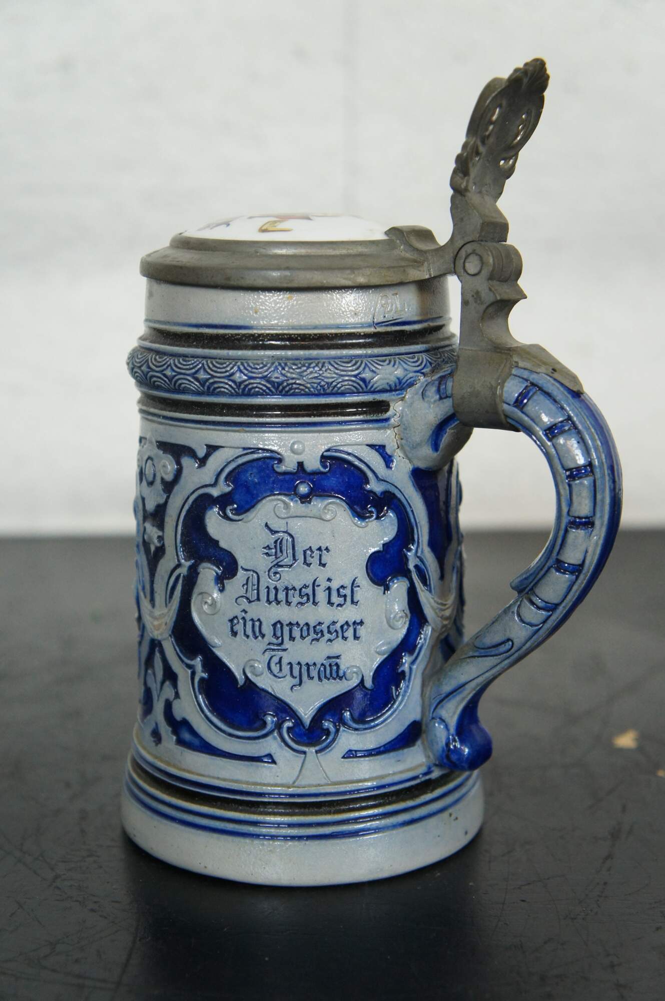 Vintage German beer stein and plaque. The beer stein features cobalt blue salt glaze with porcelain and pewter lid, heraldic shield / crest with the text: Hud ware er nicht, ja was dann! / Der Durst ist ein grosser Tyran. Loosely translated to he wasn't, well then what! / Thirst is a great tyrant.