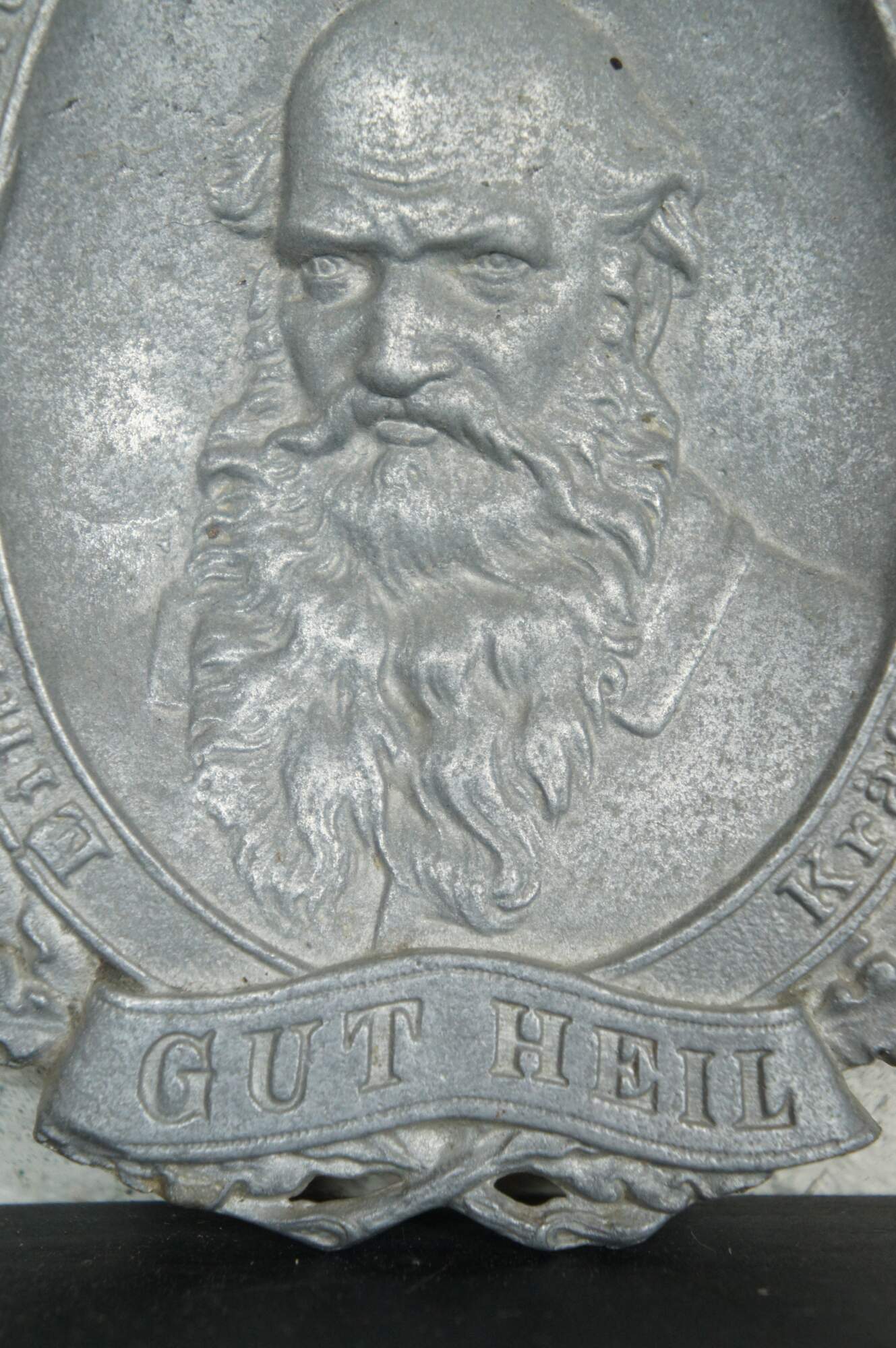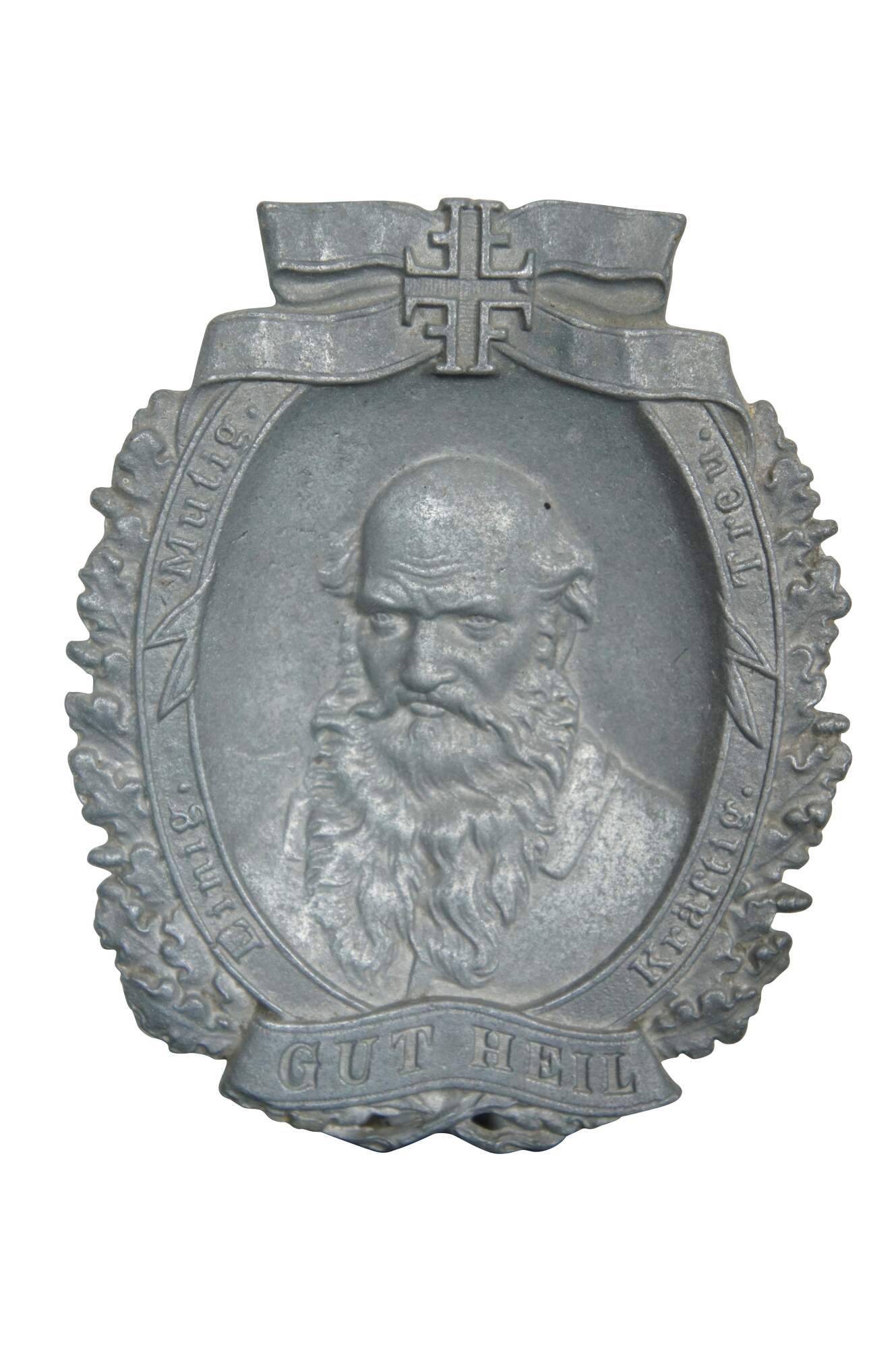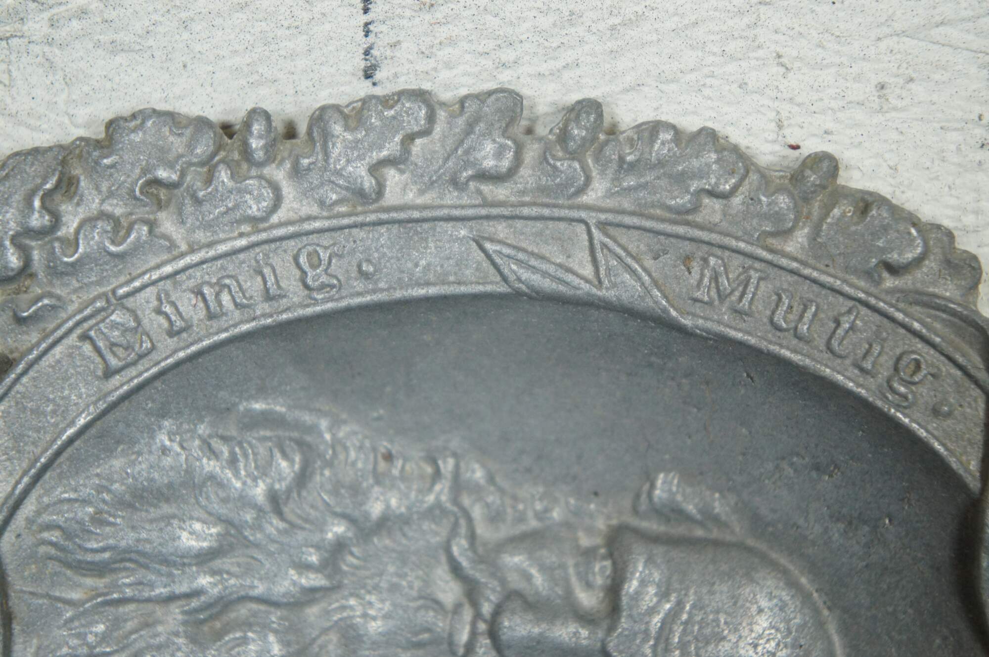 The dish / medallion / plaque is made of pewter and features the four F logo with ribbon and wreath accent and portrait of Dr. Friedrich Ludwig Jahn (1778-1852). Text reads: Gut Heil / Einig / Mutig / Kraftig / Treu. Good Hail / United / Courageous / Strong / Faithful.