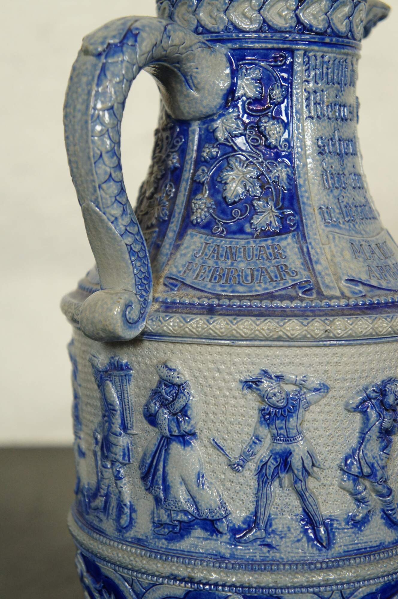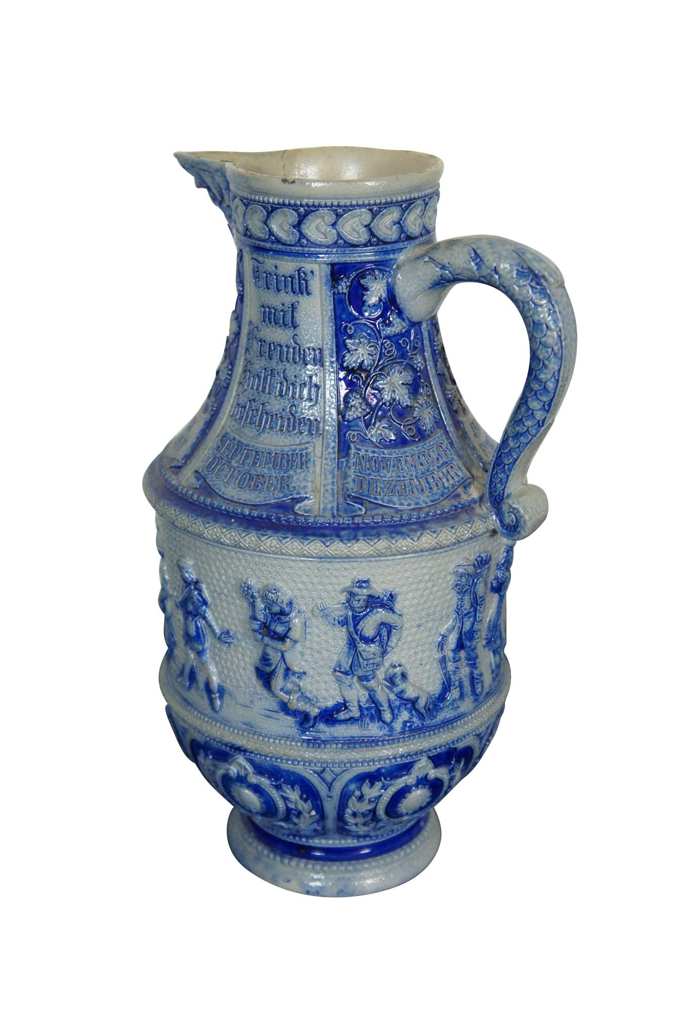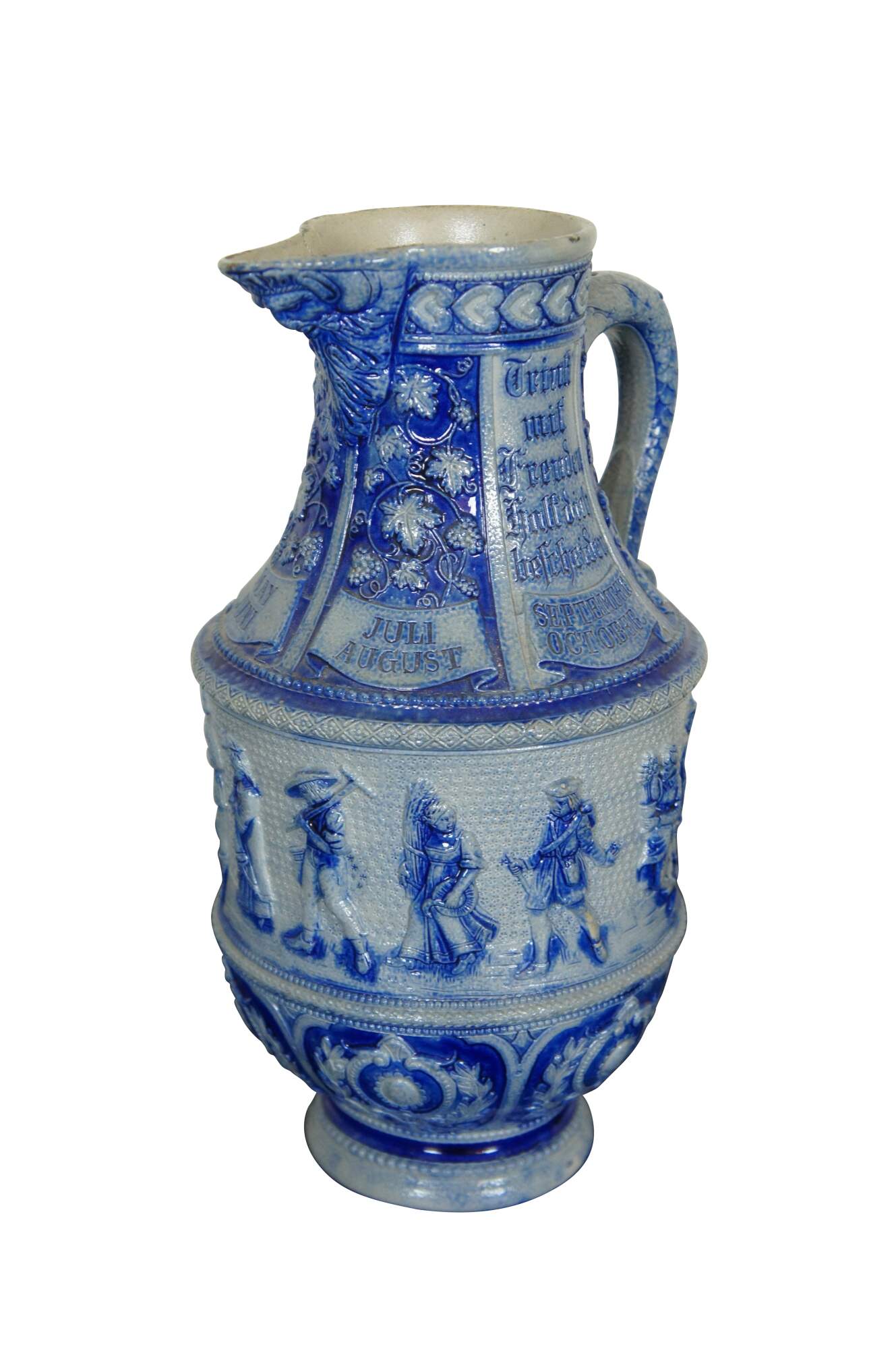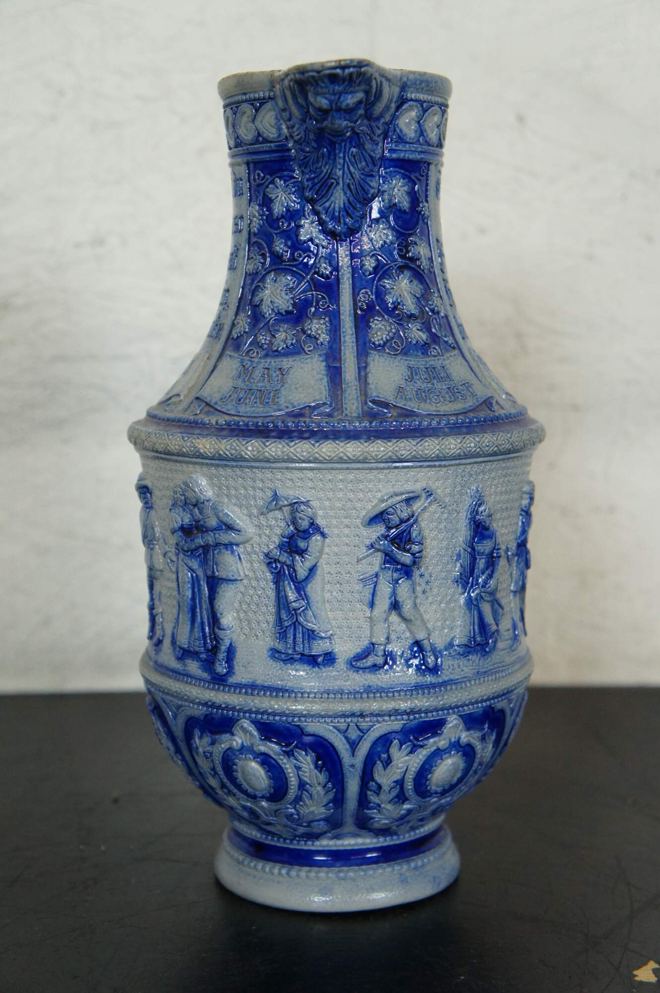 Antique German cobalt blue salt glaze stoneware pitcher / jug / ewer featuring the face of Dionysus or Bacchus - God of wine - on the spout surrounded by grapevines / grapes / leaves and the months of the year. The handle has serpent scales and the body has figures in various attire - a jesture, a couple, a women with sheith of wheat, man with back hoe, man with dog, some drunk looking people, a sailor, a smoker, ect.