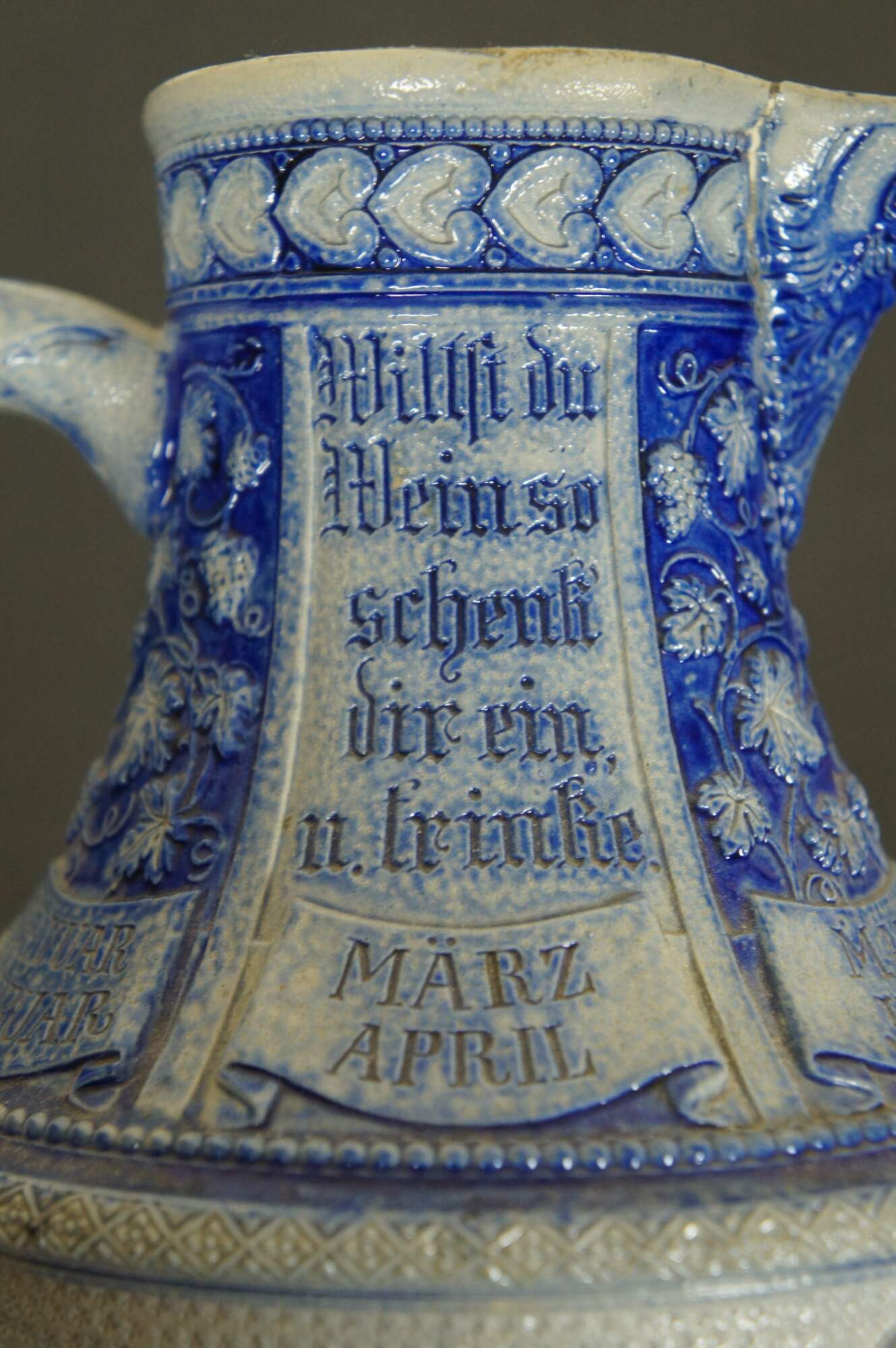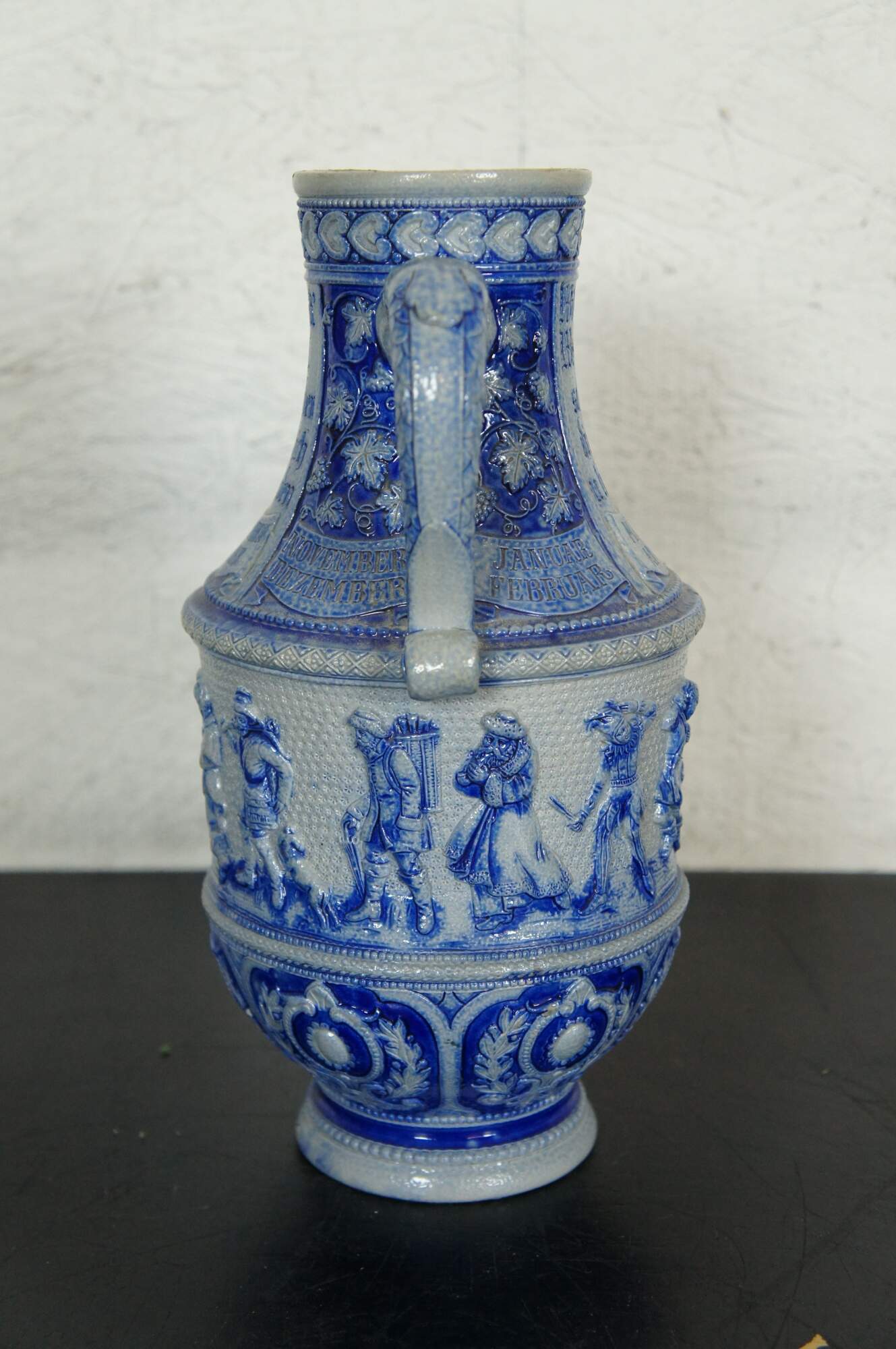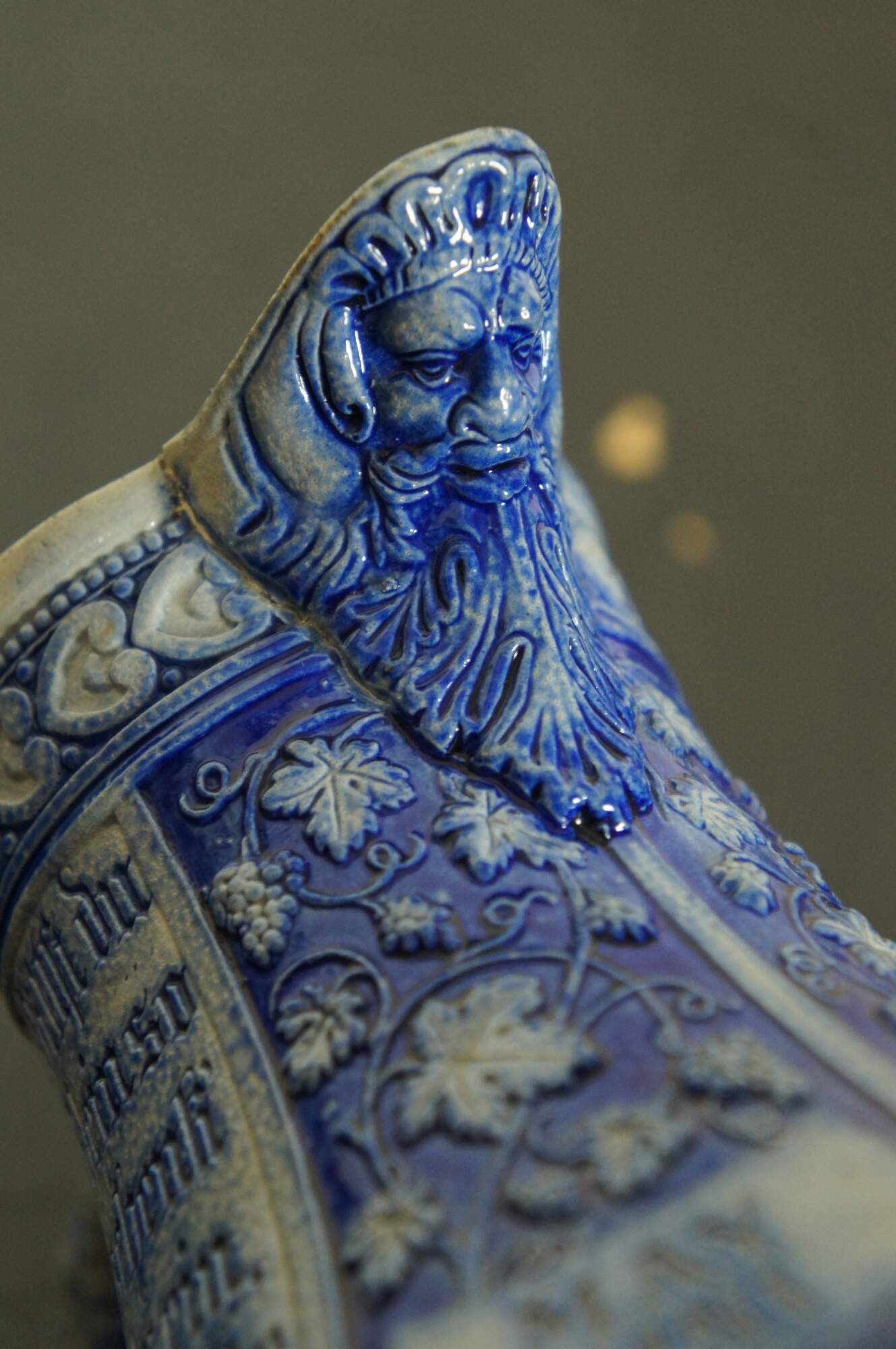 Antique German cobalt blue salt glaze stoneware pitcher / jug / ewer featuring the face of Dionysus or Bacchus - God of wine - on the spout surrounded by grapevines / grapes / leaves and the months of the year. The handle has serpent scales and the body has figures in various attire - a jesture, a couple, a women with sheith of wheat, man with back hoe, man with dog, some drunk looking people, a sailor, a smoker, ect.