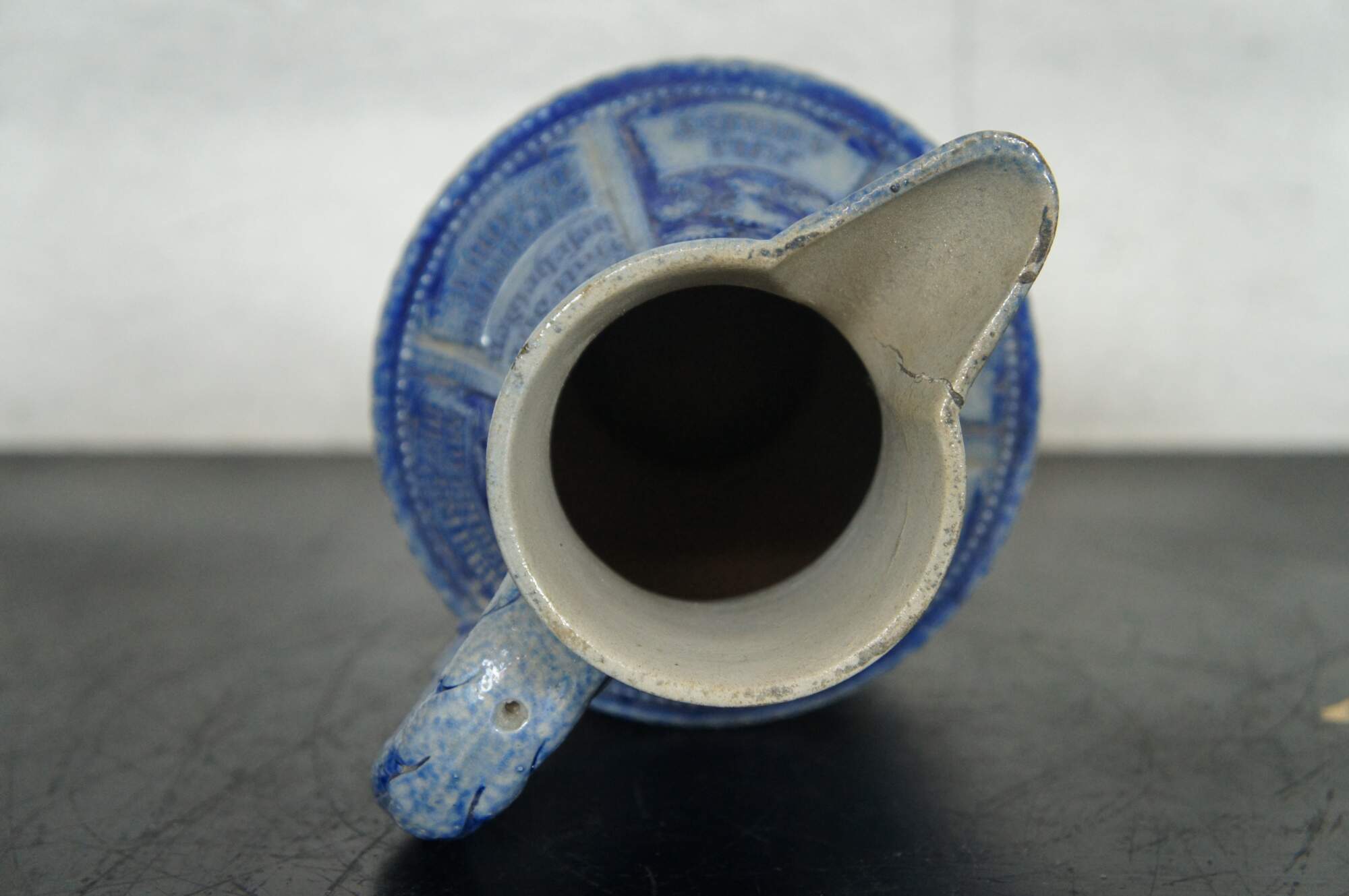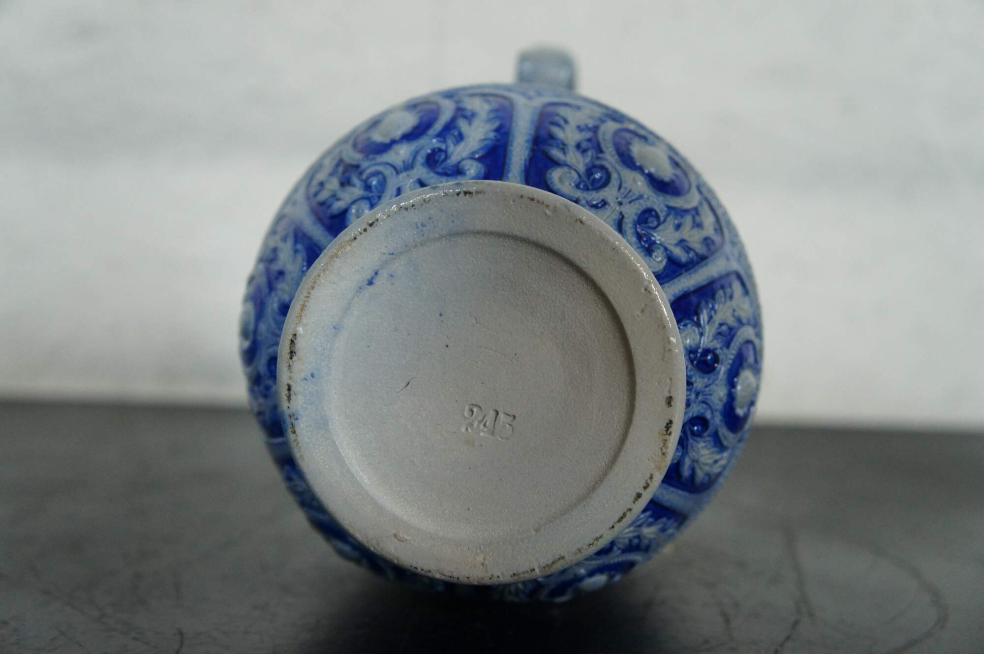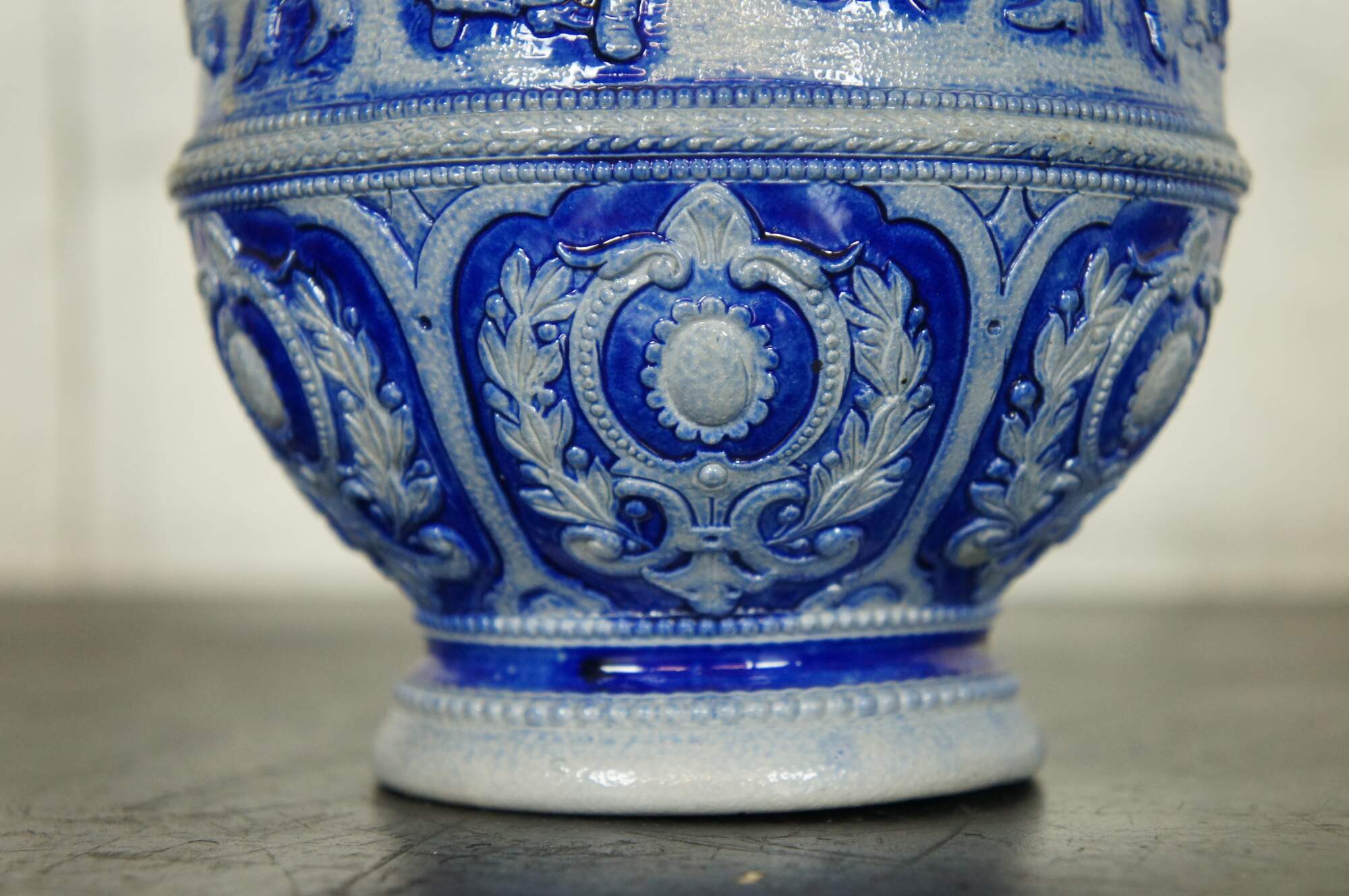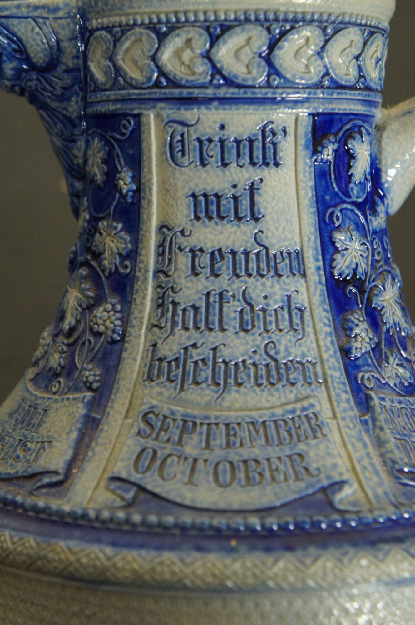 Antique German cobalt blue salt glaze stoneware pitcher / jug / ewer featuring the face of Dionysus or Bacchus - God of wine - on the spout surrounded by grapevines / grapes / leaves and the months of the year. The handle has serpent scales and the body has figures in various attire - a jesture, a couple, a women with sheith of wheat, man with back hoe, man with dog, some drunk looking people, a sailor, a smoker, ect.