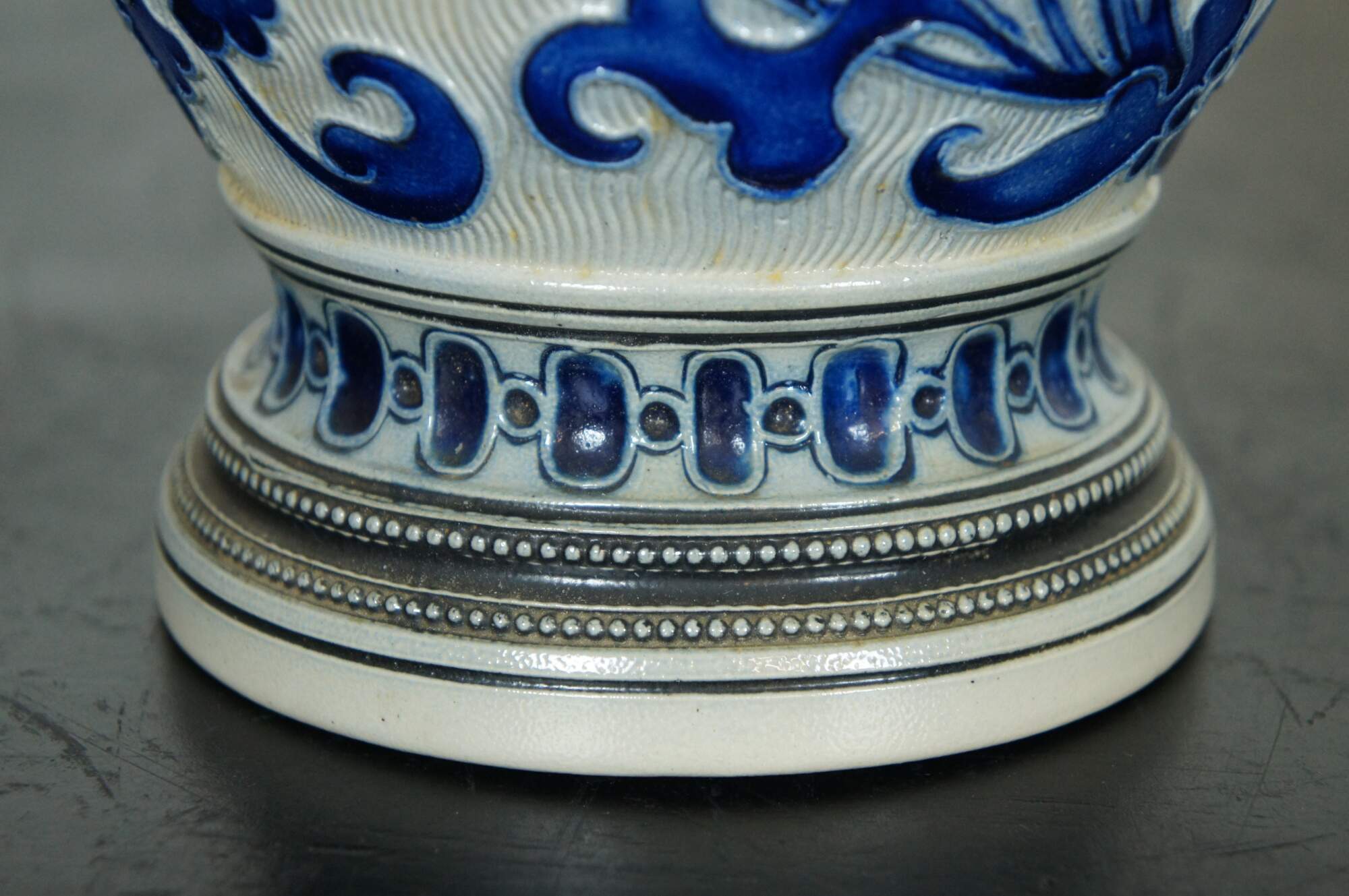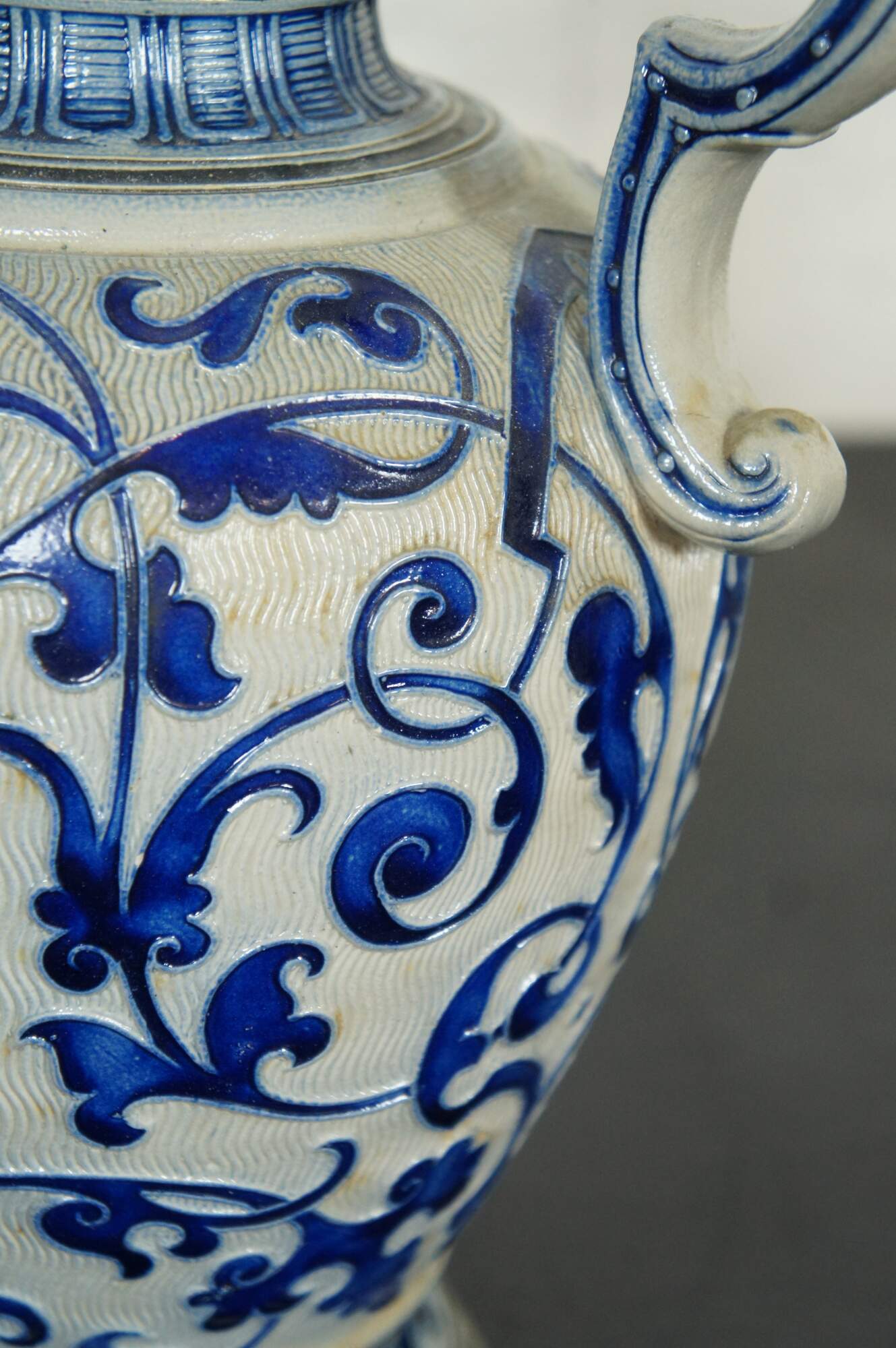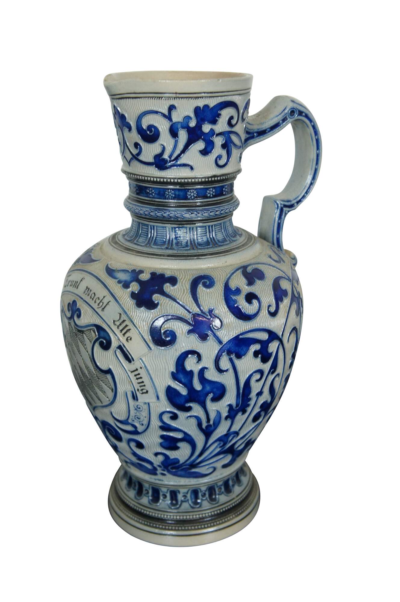 Antique German Reinhold Merkelbach (1882-1933 star mark) cobalt blue salt glaze pitcher or jug featuring a heraldic theme with crest or shield and floral acanthus designs.