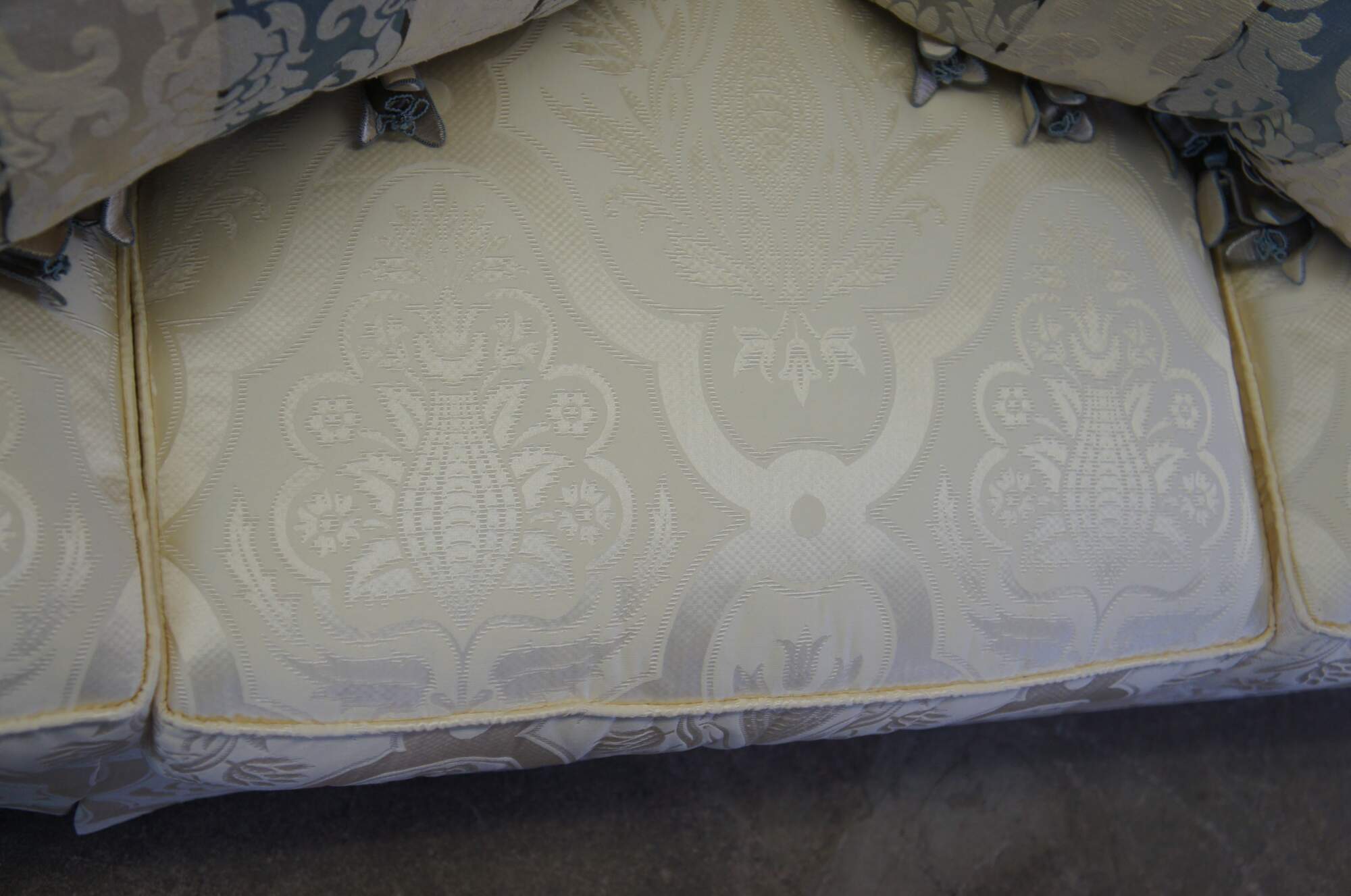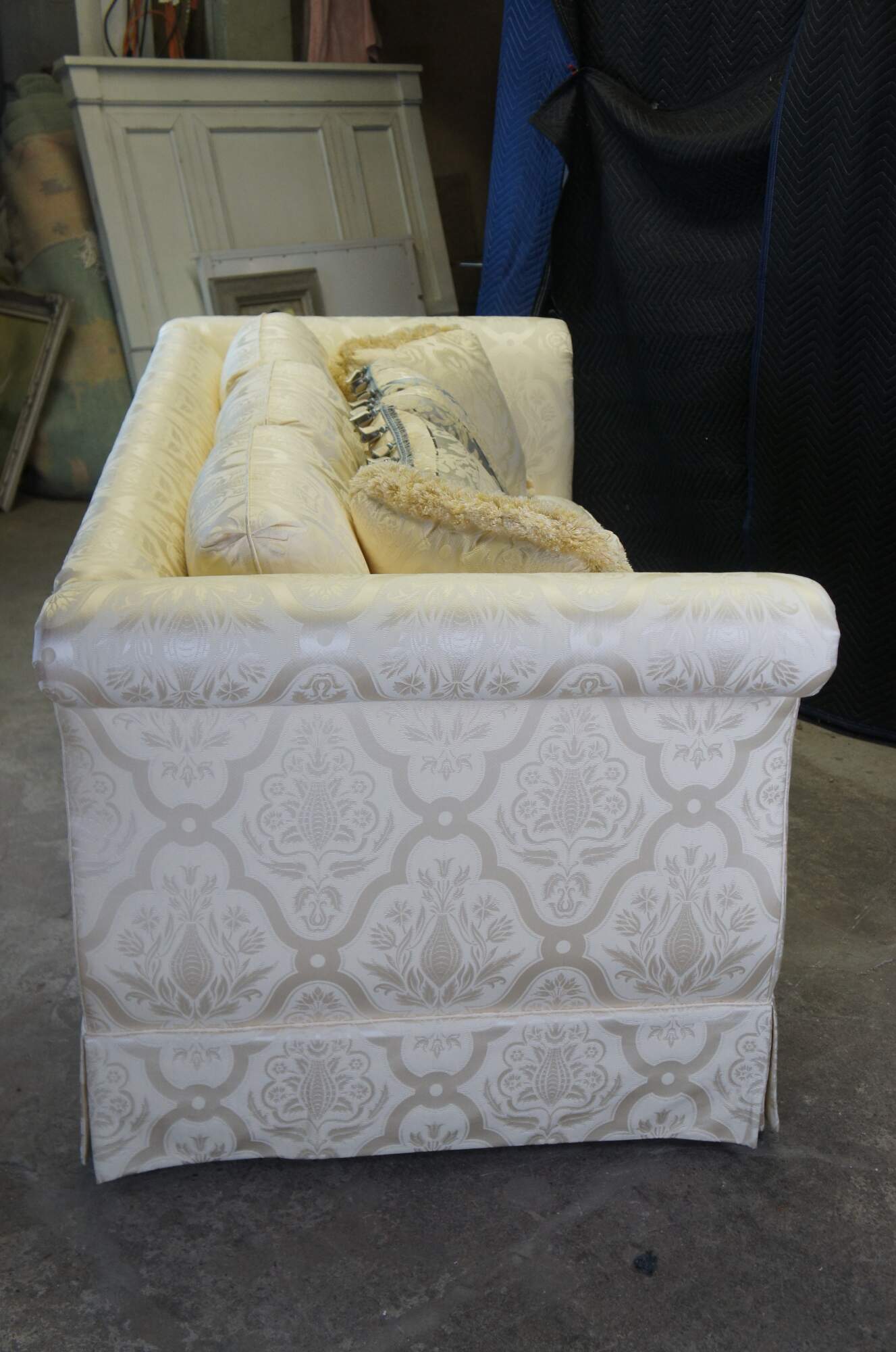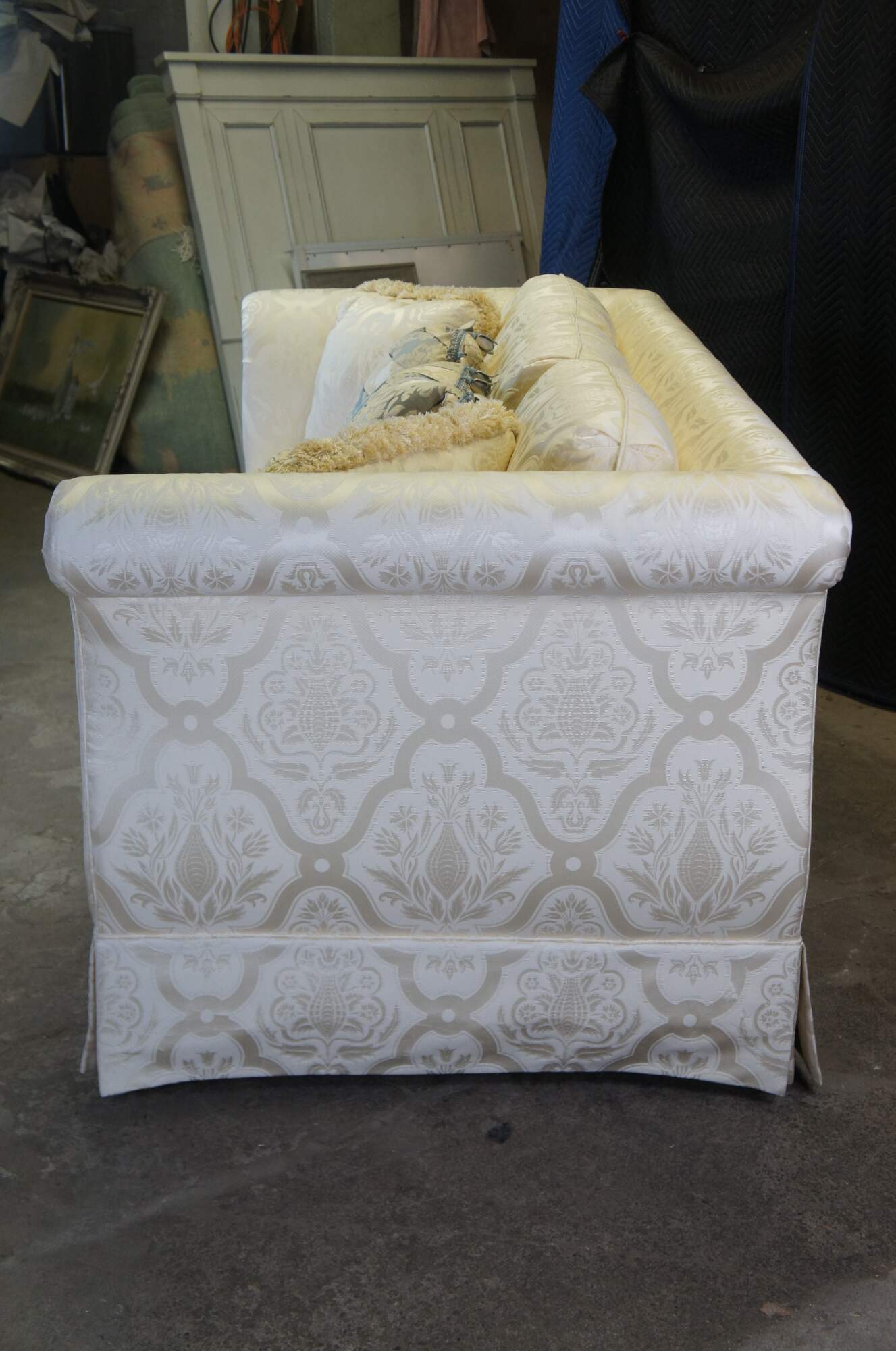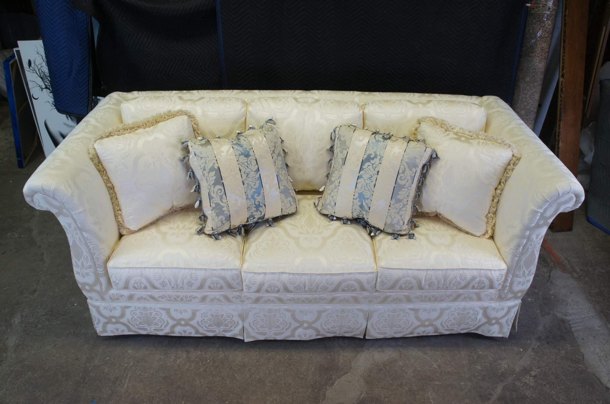 Vintage Taylor King three seat sofa or couch featuring a down filled silk Damask fabric with skirted base and high rolled arms and back. Includes lumbar pillows with tulip tassels. White / off-white / silver / blue.