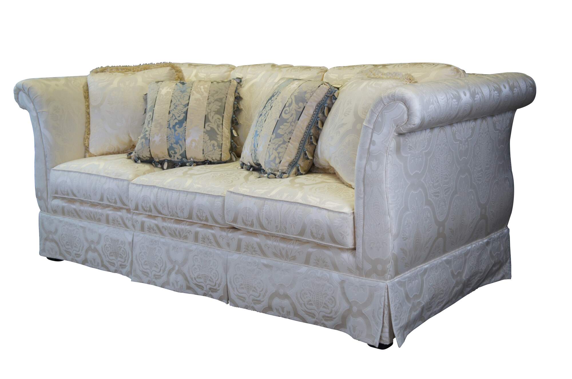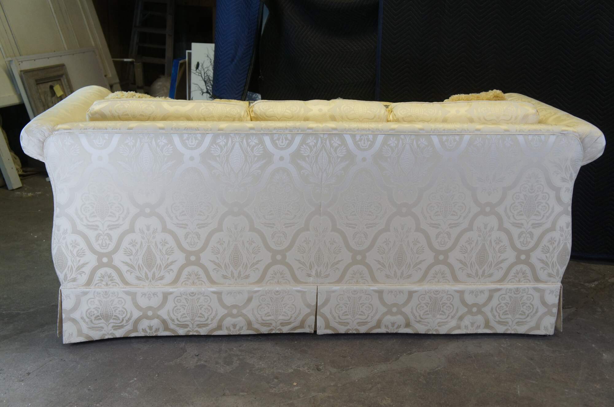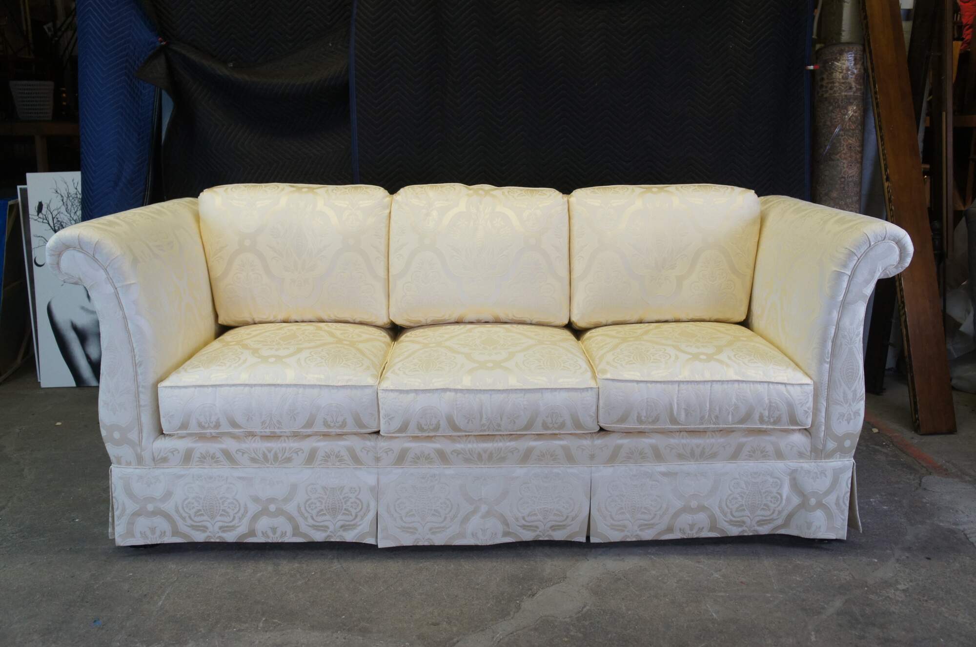 Vintage Taylor King three seat sofa or couch featuring a down filled silk Damask fabric with skirted base and high rolled arms and back. Includes lumbar pillows with tulip tassels. White / off-white / silver / blue.