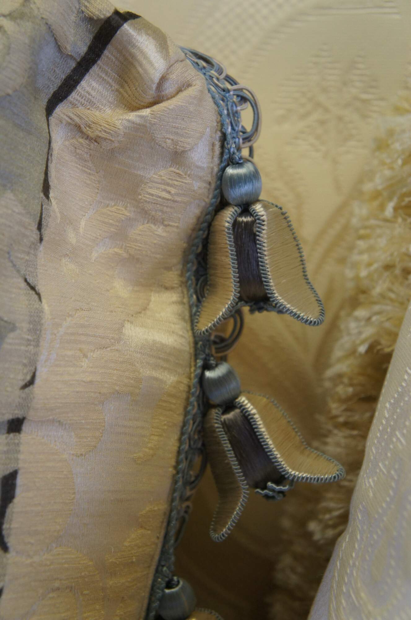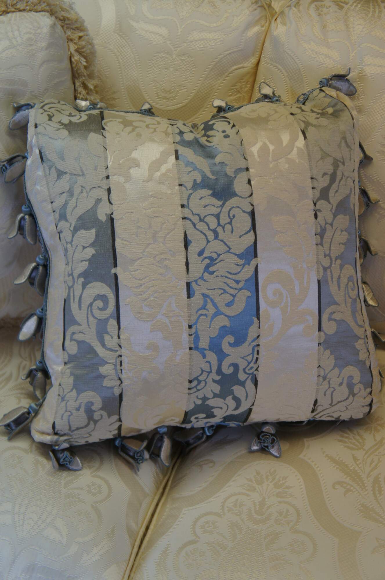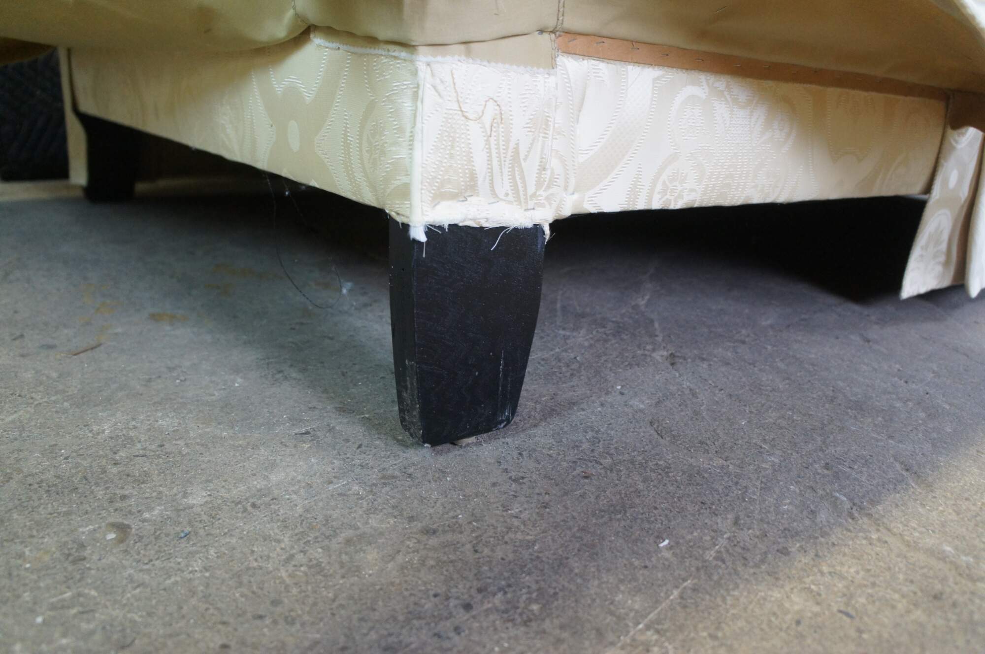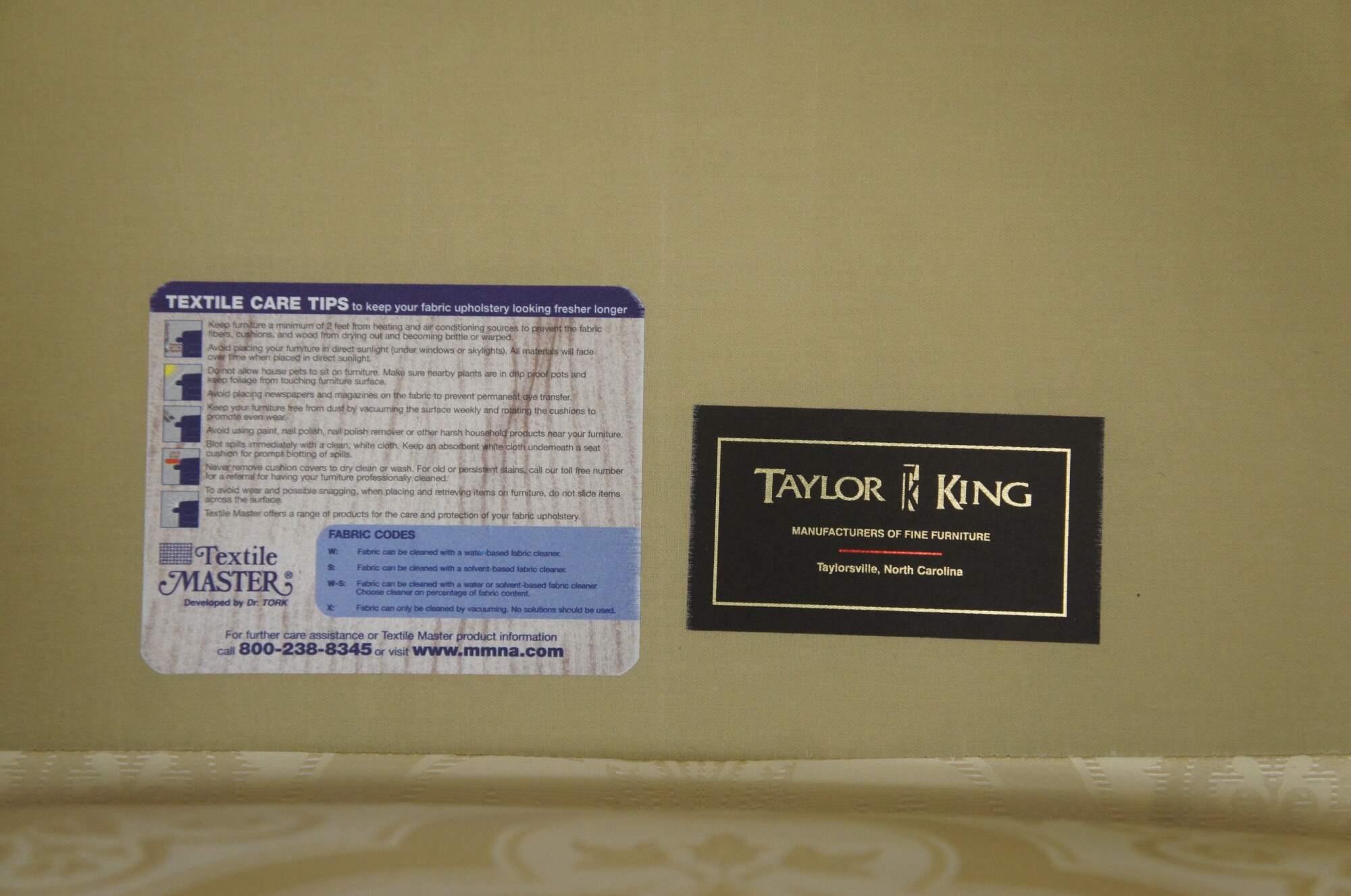 Vintage Taylor King three seat sofa or couch featuring a down filled silk Damask fabric with skirted base and high rolled arms and back. Includes lumbar pillows with tulip tassels. White / off-white / silver / blue.