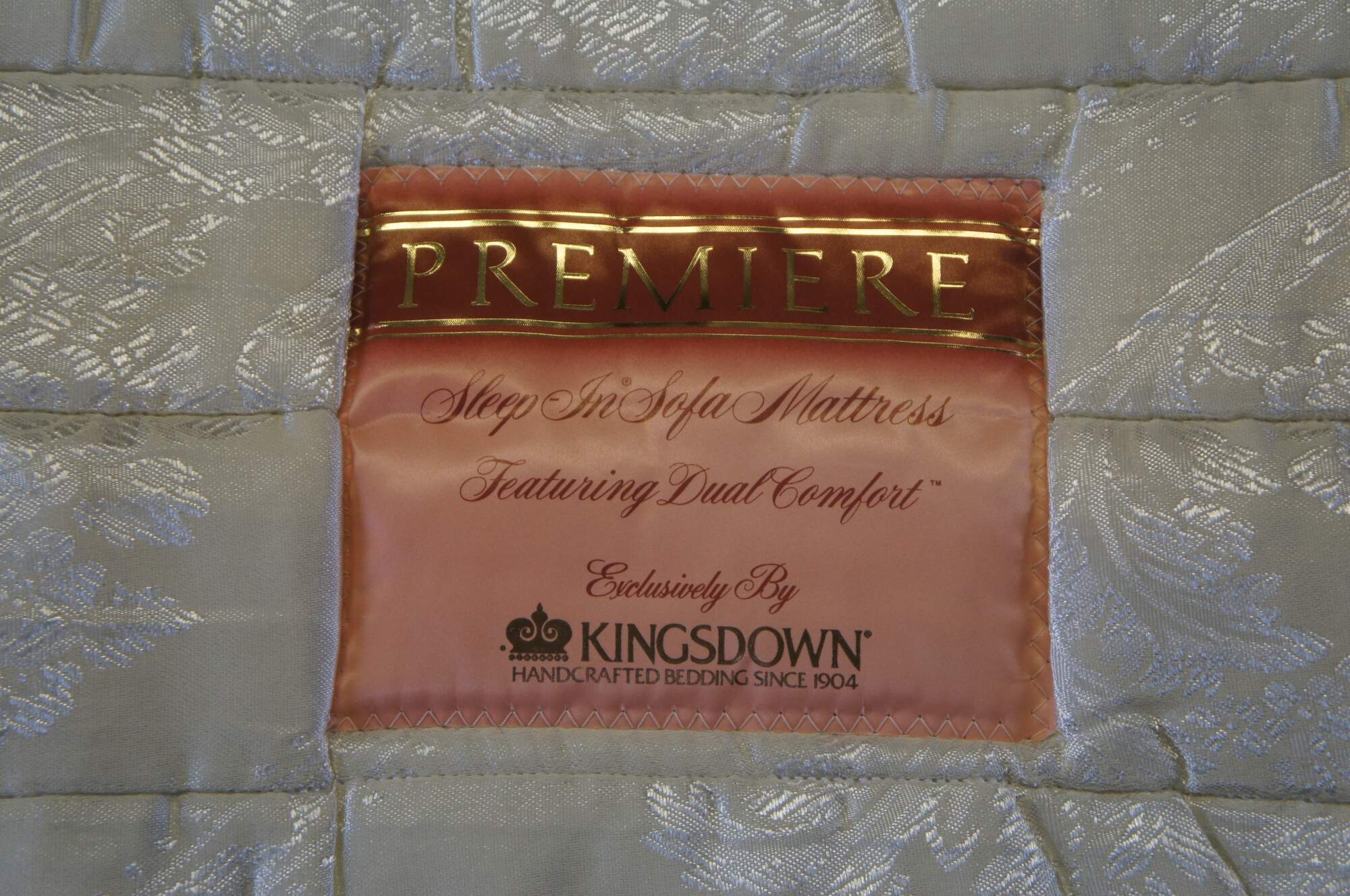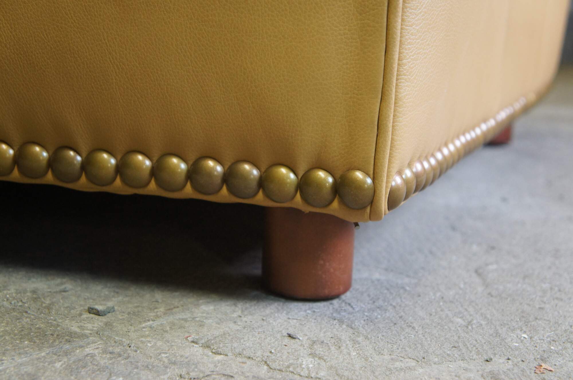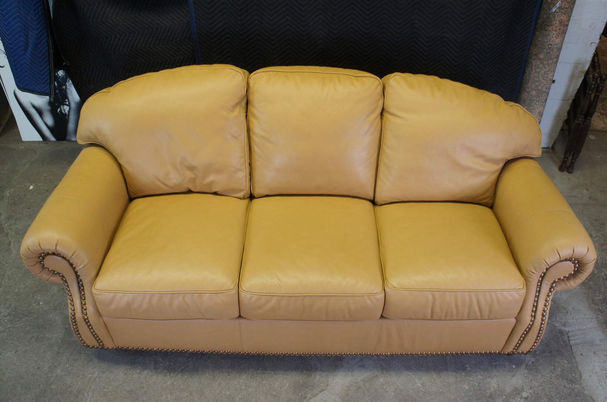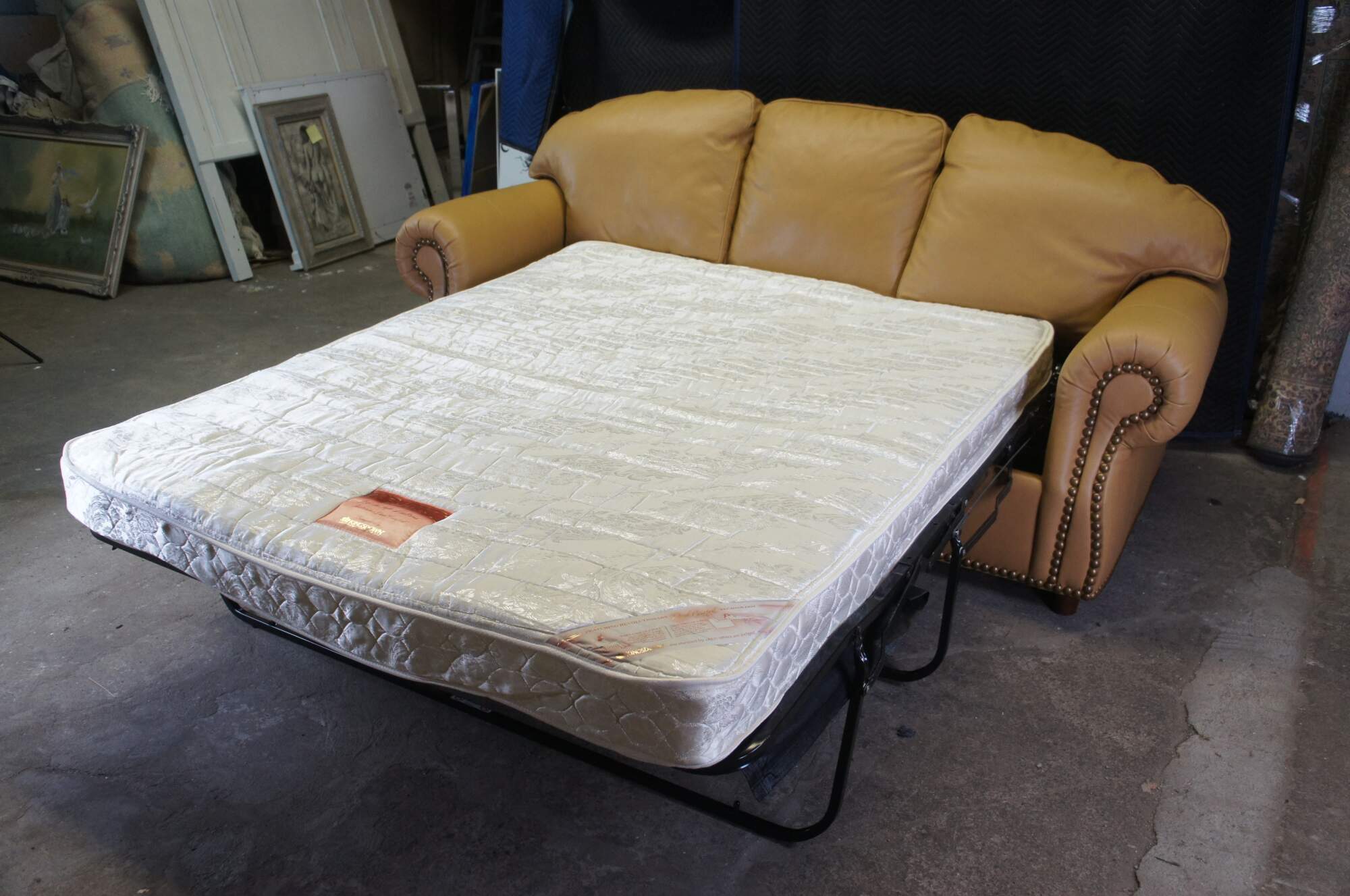 Vintage Taylor King three seat sofa or couch with pull out queen size sleeper bed. Features camel tan colored leather with rolled arms and oversized nailhead trim. Three seats remove to pull out sofa bed, which easily unfolds. Includes Spremiere Sleep in Sofa Mattress Featuring Dual Comfort by Kingsdown. Very heavy.