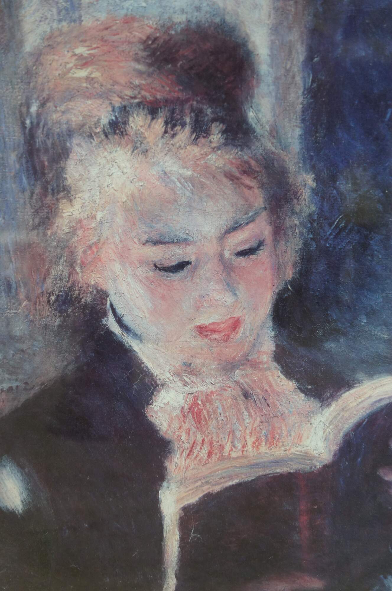 With visible brush strokes, Renoir painted the background in a series of colors, dark blue, light blue, white, and yellow. The painter also used dark blue to depict the woman’s jacket and the book cover. She wears a scarf decorated with orange strokes of paint, and her white shirt collar can also be seen. He hair and face are illuminated, accentuating her blond hair and rosy cheeks. The pages of the book are depicted with long yellow strokes, and her hands are in the shadow cast by it. Renoir was a master of portraying the human figure, and his attention to natural positions can be seen even in portraits like Young Woman Reading A Book – as he gracefully positions the model’s tilted head and hands holding the book.