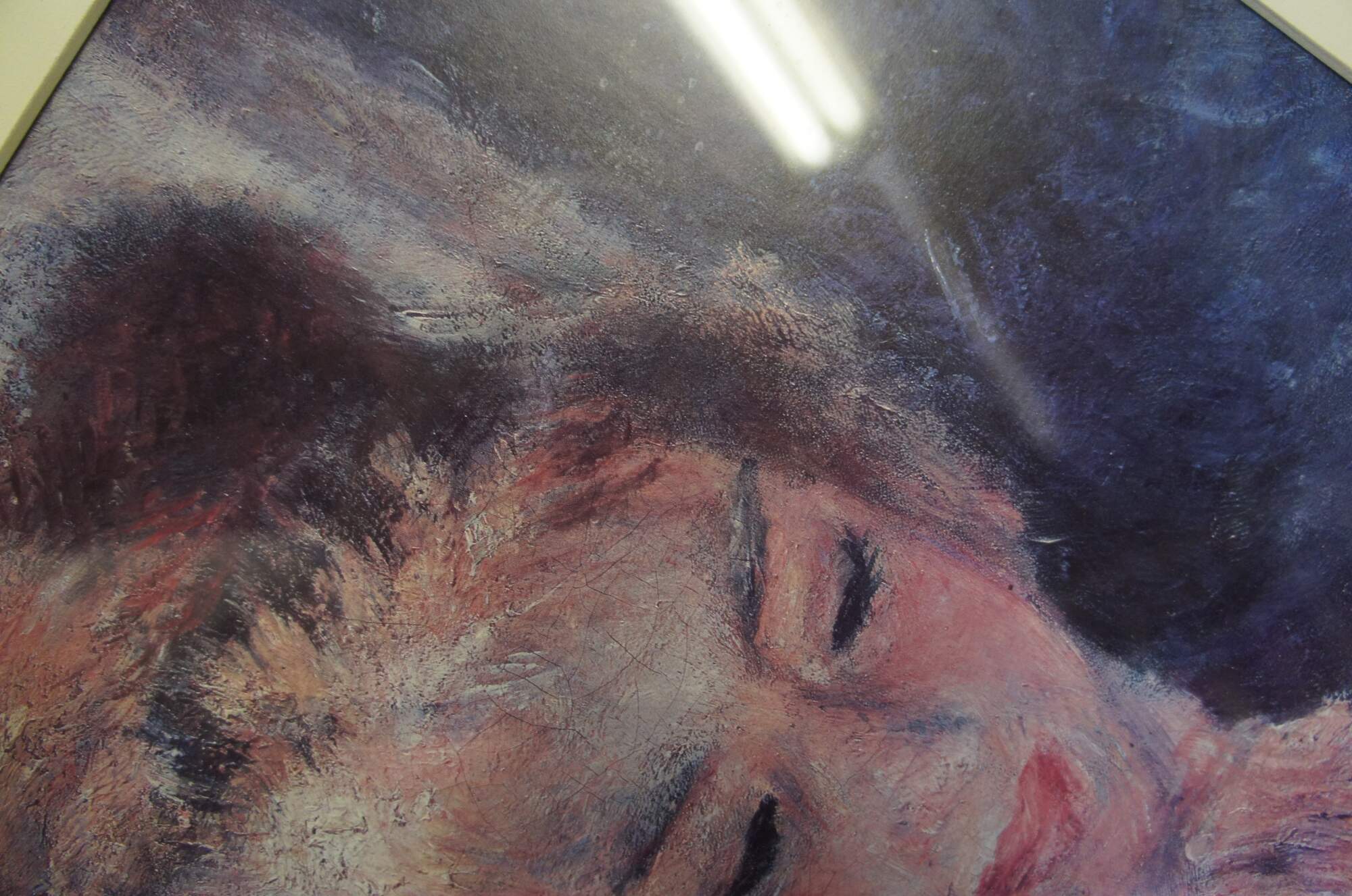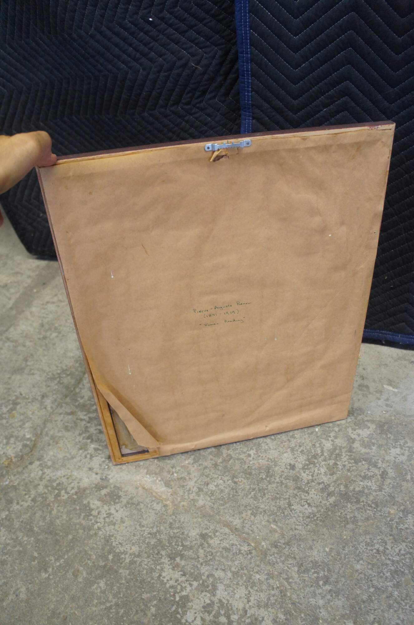 Good overall, some marks to frame, torn backing.