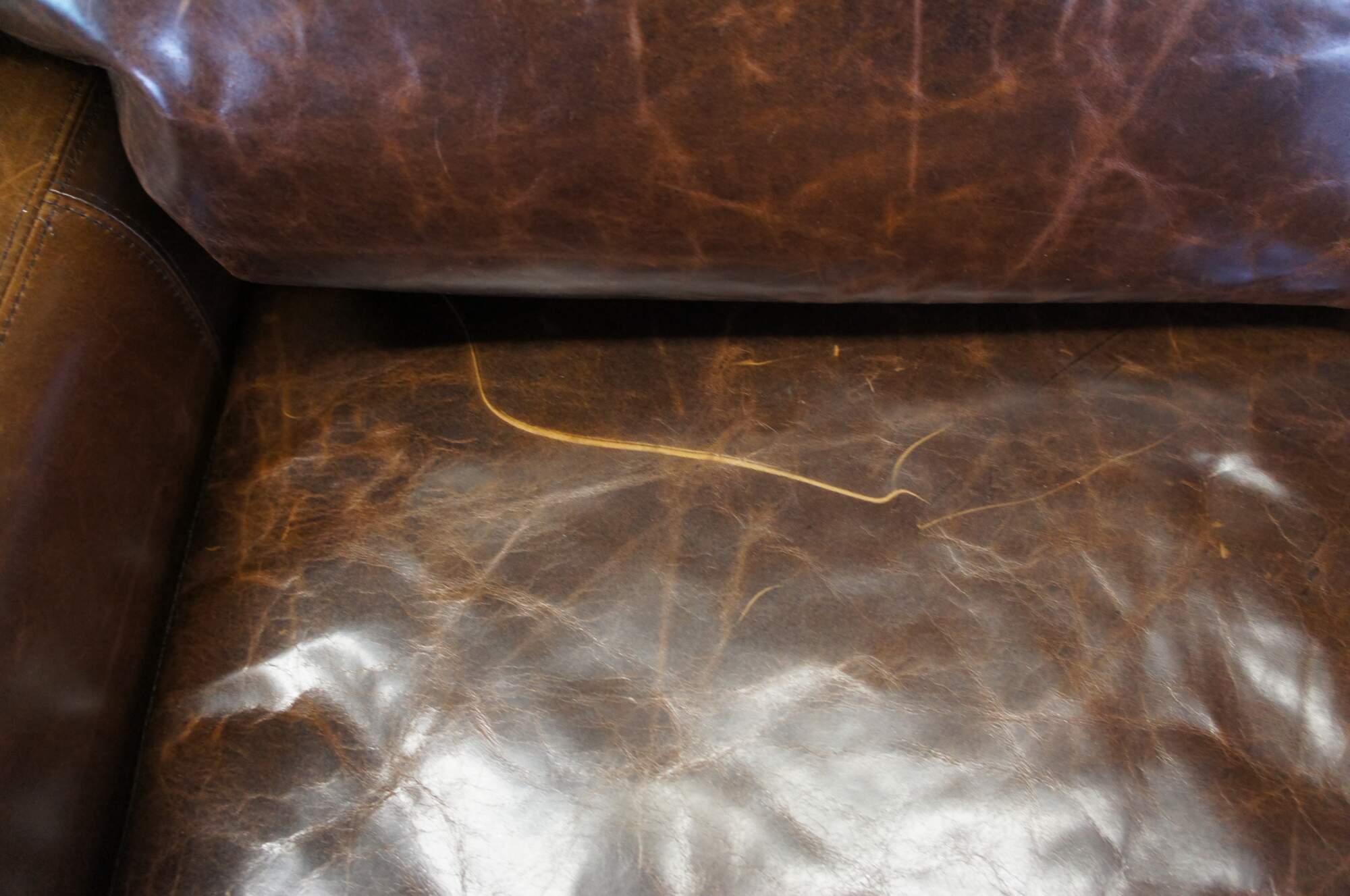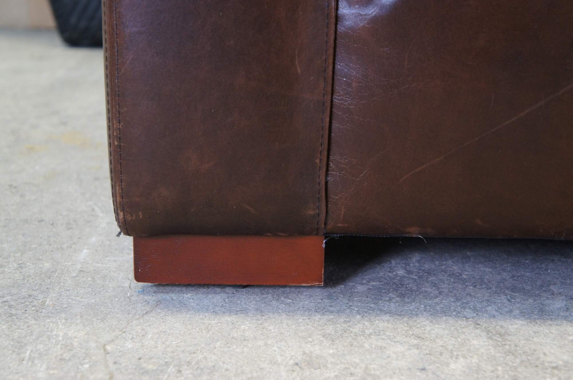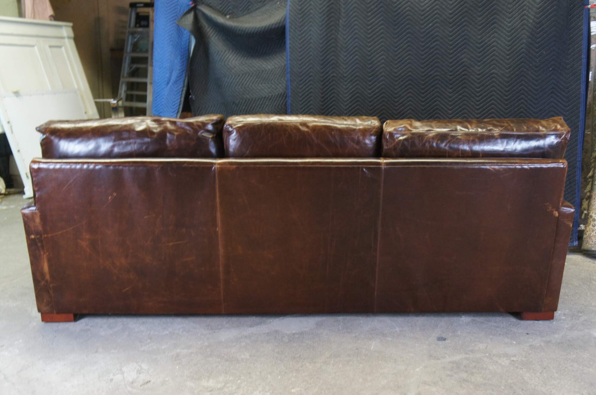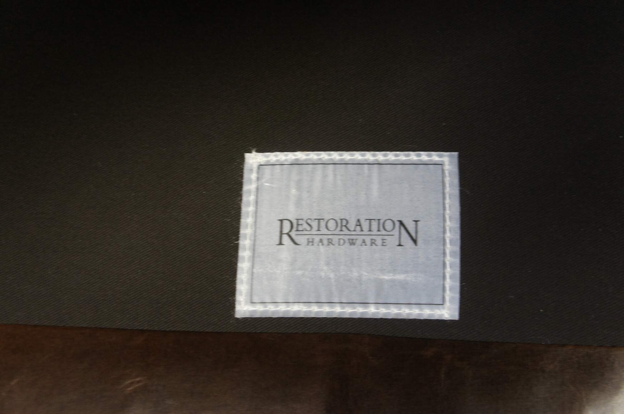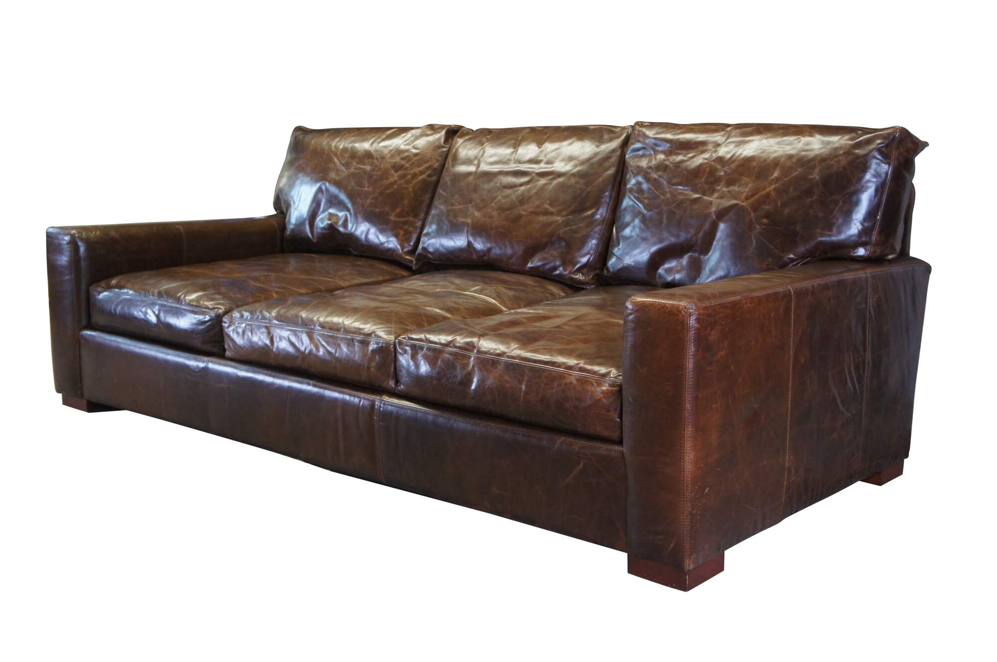 A luxurious 3 Seater sofa by Restoration Hardware. The Maxwell is upholstered in a supple cocoa brown leather for maximum comfort. Cutting a clean lined silhouette with ultra-deep proportions, this sofa features squared, track arms and a modernist, low-slung profile. Soft-to-the-touch leather and overstuffed down filled back and seat cushions complete this supreme piece of living room or den furniture.