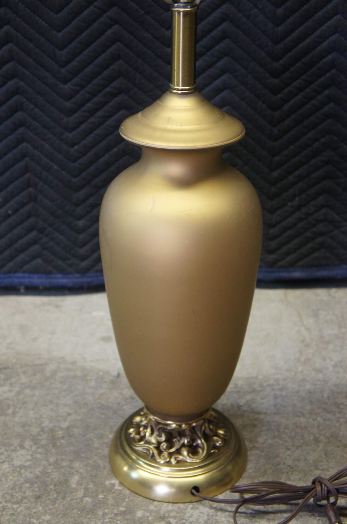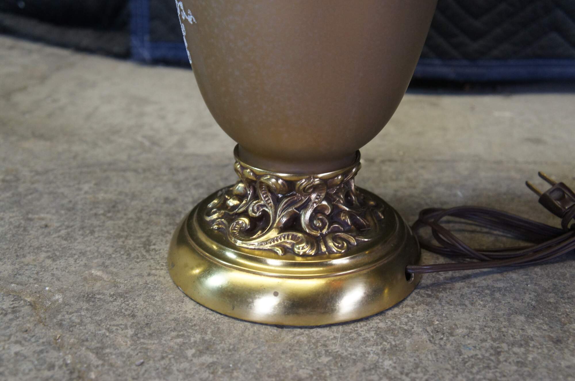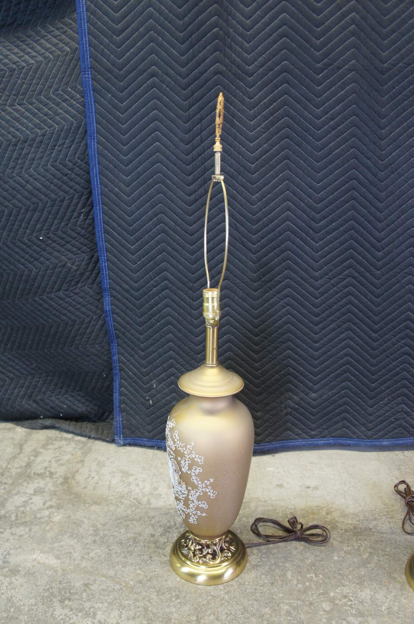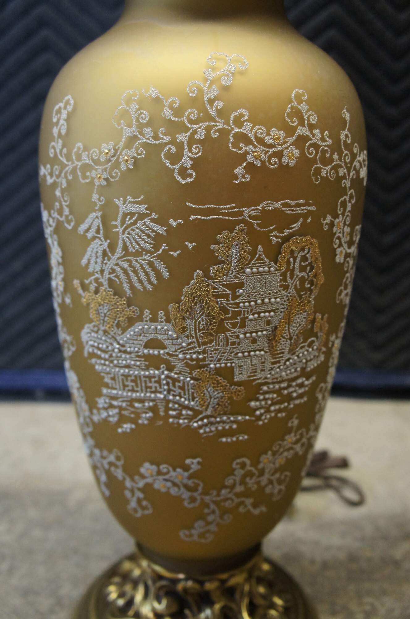 Two vintage Japanese Satsuma moriage painted table lamps. Made of porcelain featuring a chinoiserie theme landscape scene of pagodas, bridges, flowers and trees. Includes brass filigree finials.