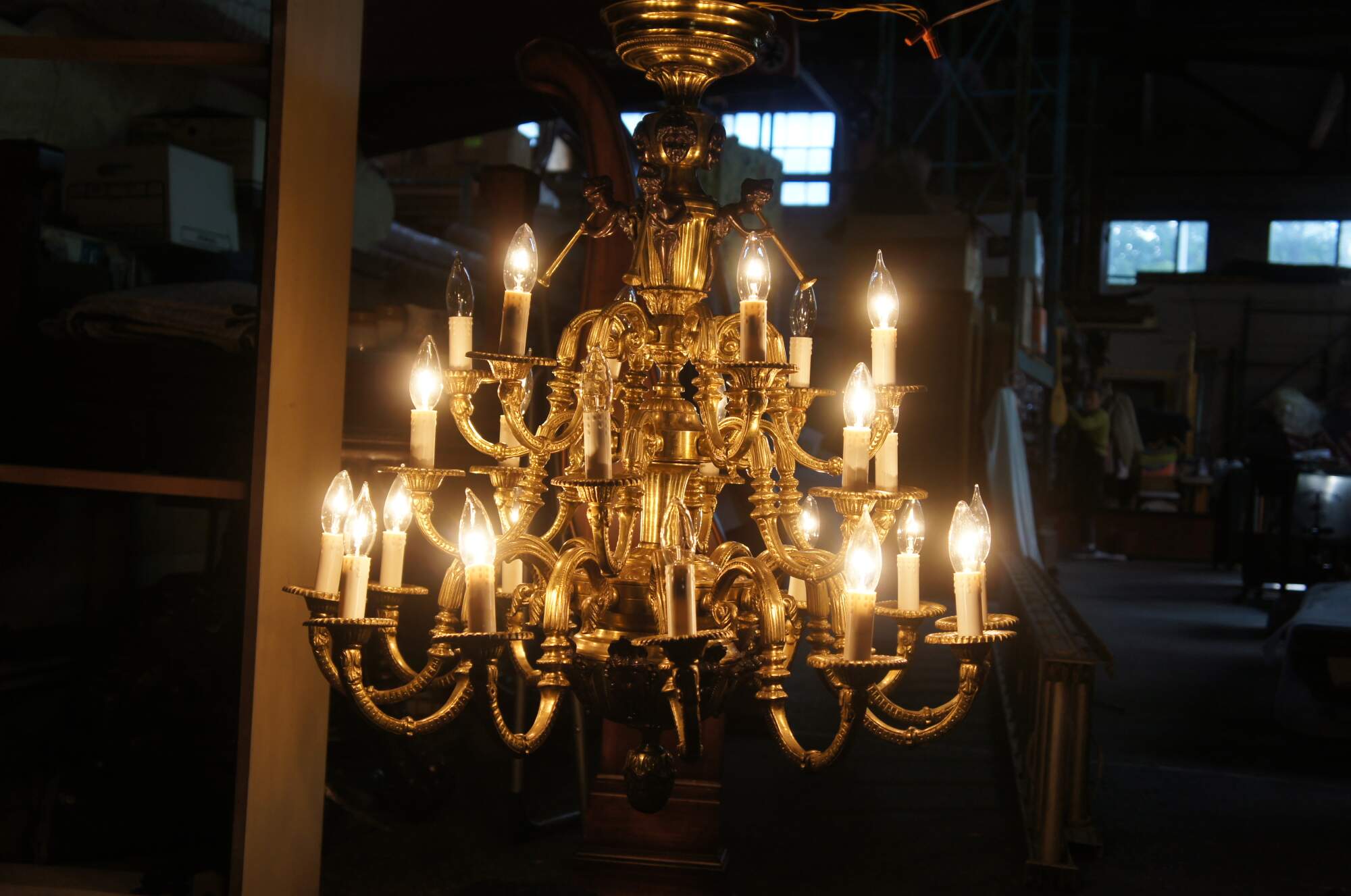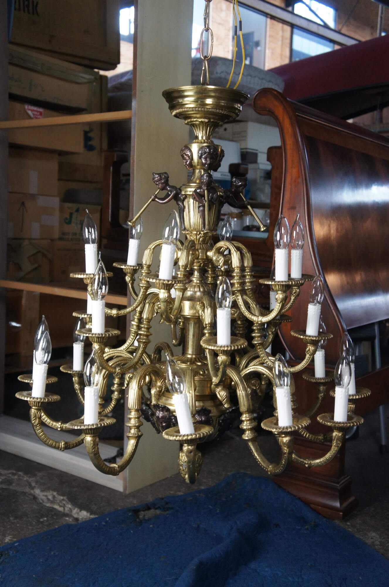 Impressive Louis XV / French Empire / Pierre Gouthière style gilt bronze twenty four light, three tier Cherub / angel / trumpet candlestick chandelier. Made of gilt bronze featuring Cherubs / Puttis / Angels playing trumpets, surrounded by three tier layer of serpentine candlestick lights, and large acorn drop finial.