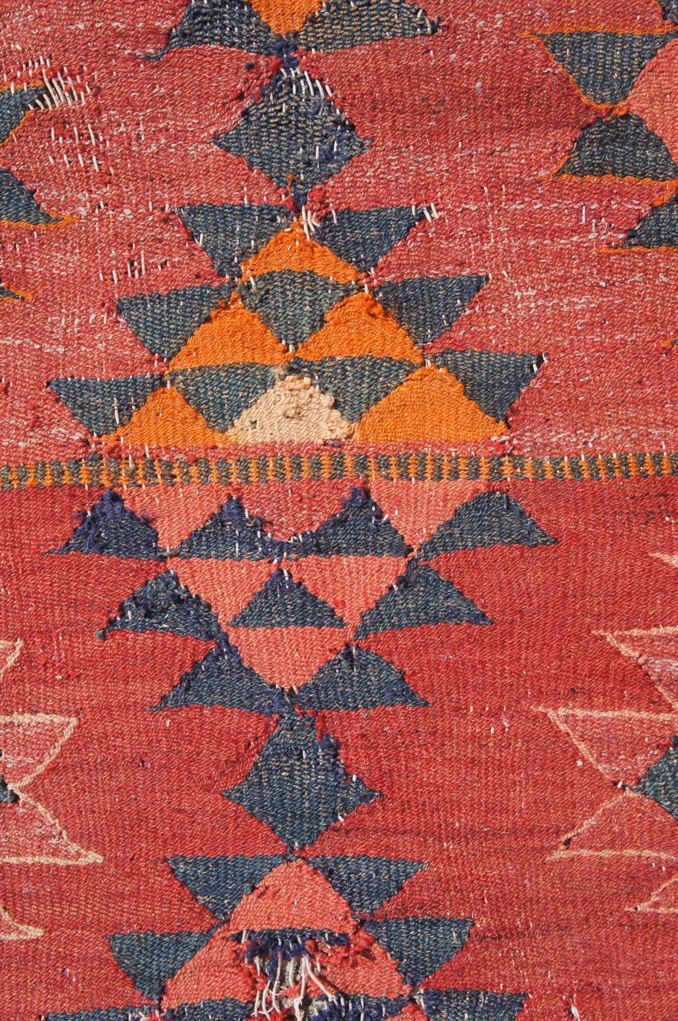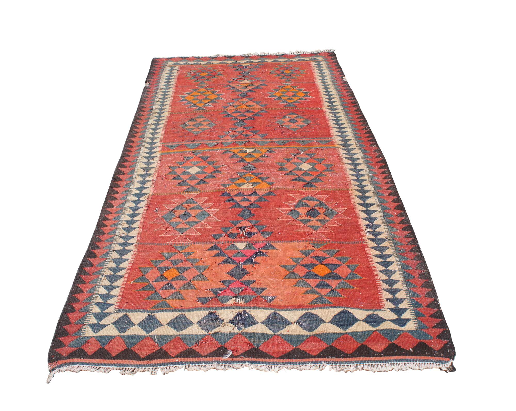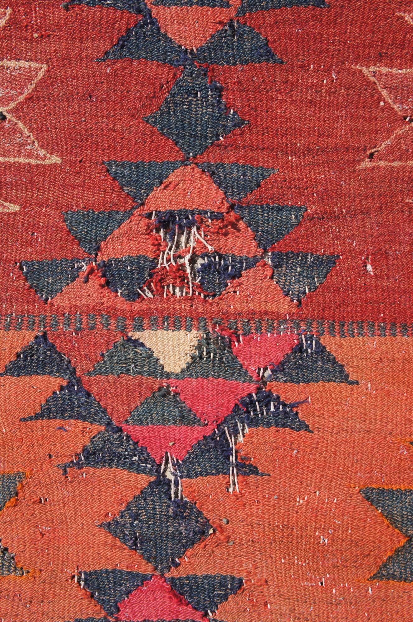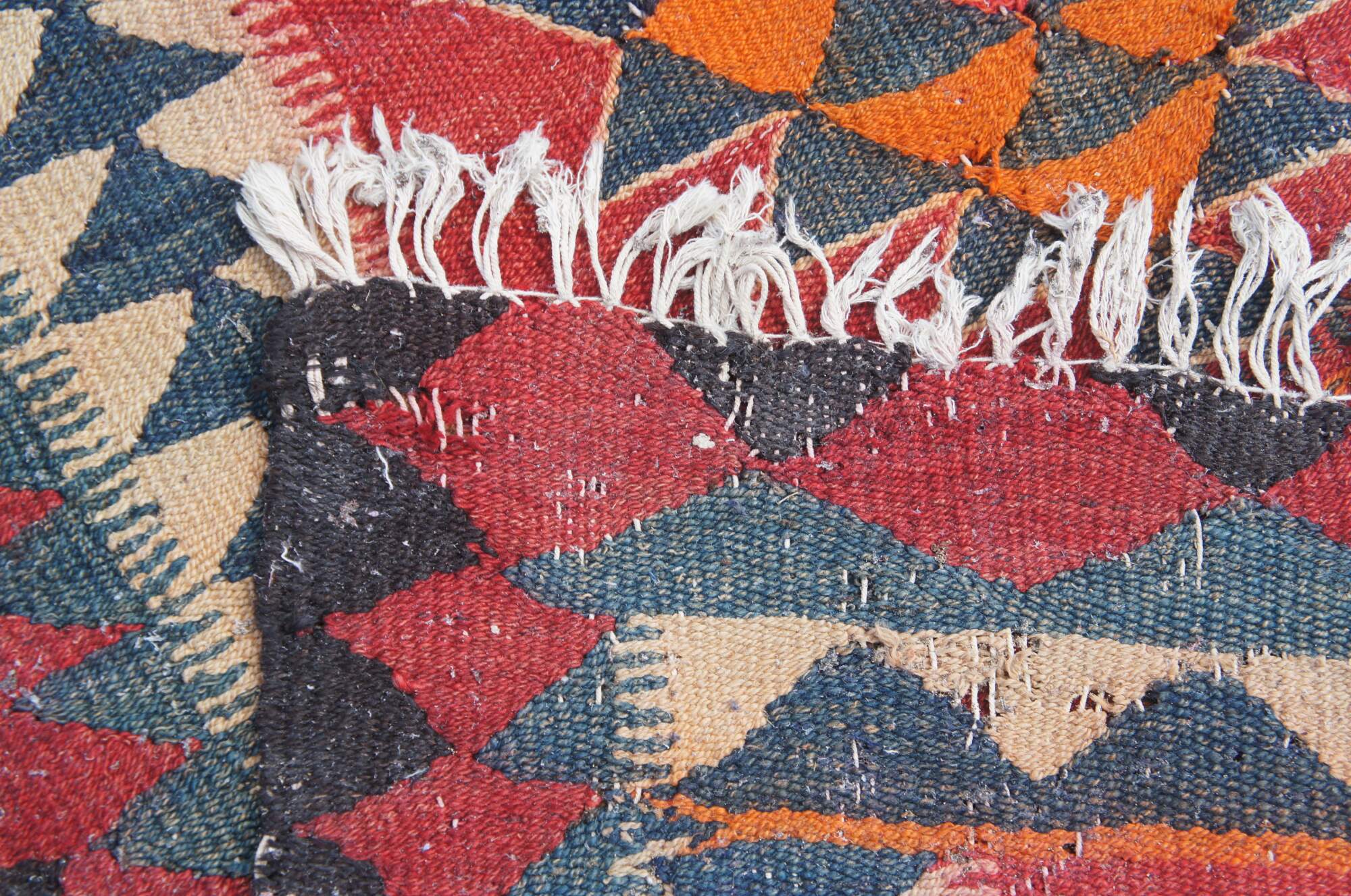 A colorful turkish kilim rug runner from the second half of the 20th century. Made from wool in Oushak (western) Turkey. Features a geometric pattern in red, blue orange and beige. Ushaks are flat-woven rugs that are on the thinner side of the rug spectrum. They are softer than other handmade rugs. These types of rugs are more durable than traditional rugs as they are made using natural fibers and dyes. Historically t hey are one of the oldest and finest Oriental carpets.