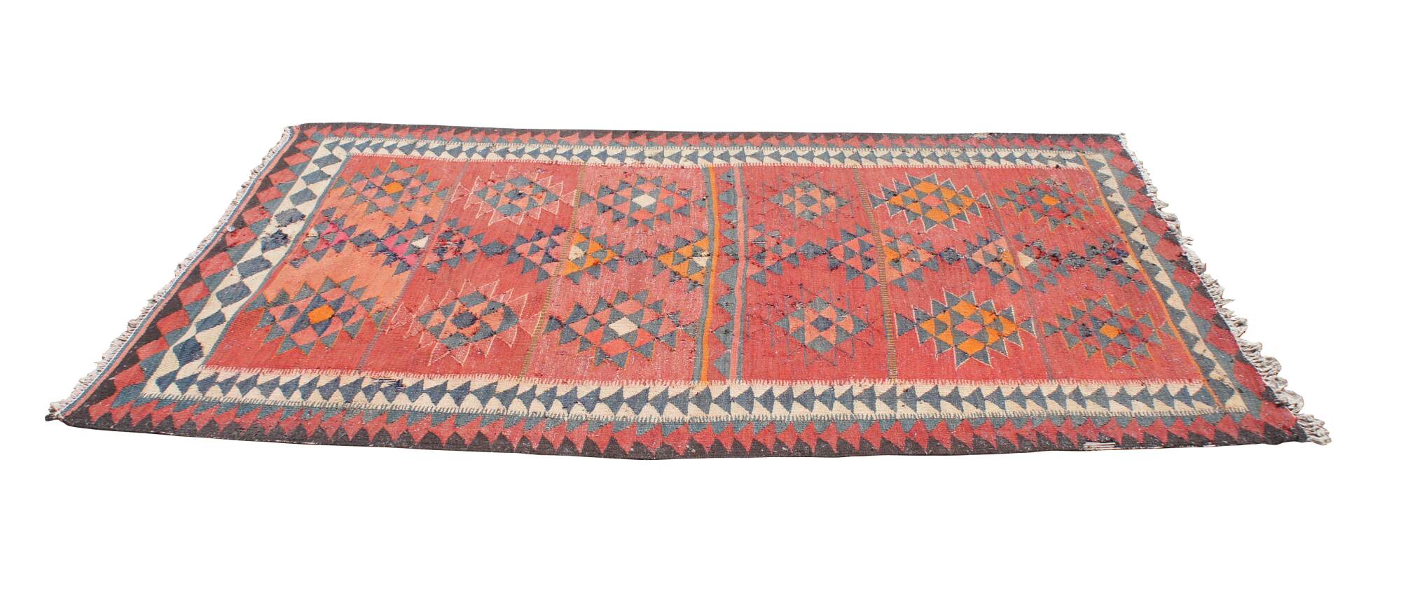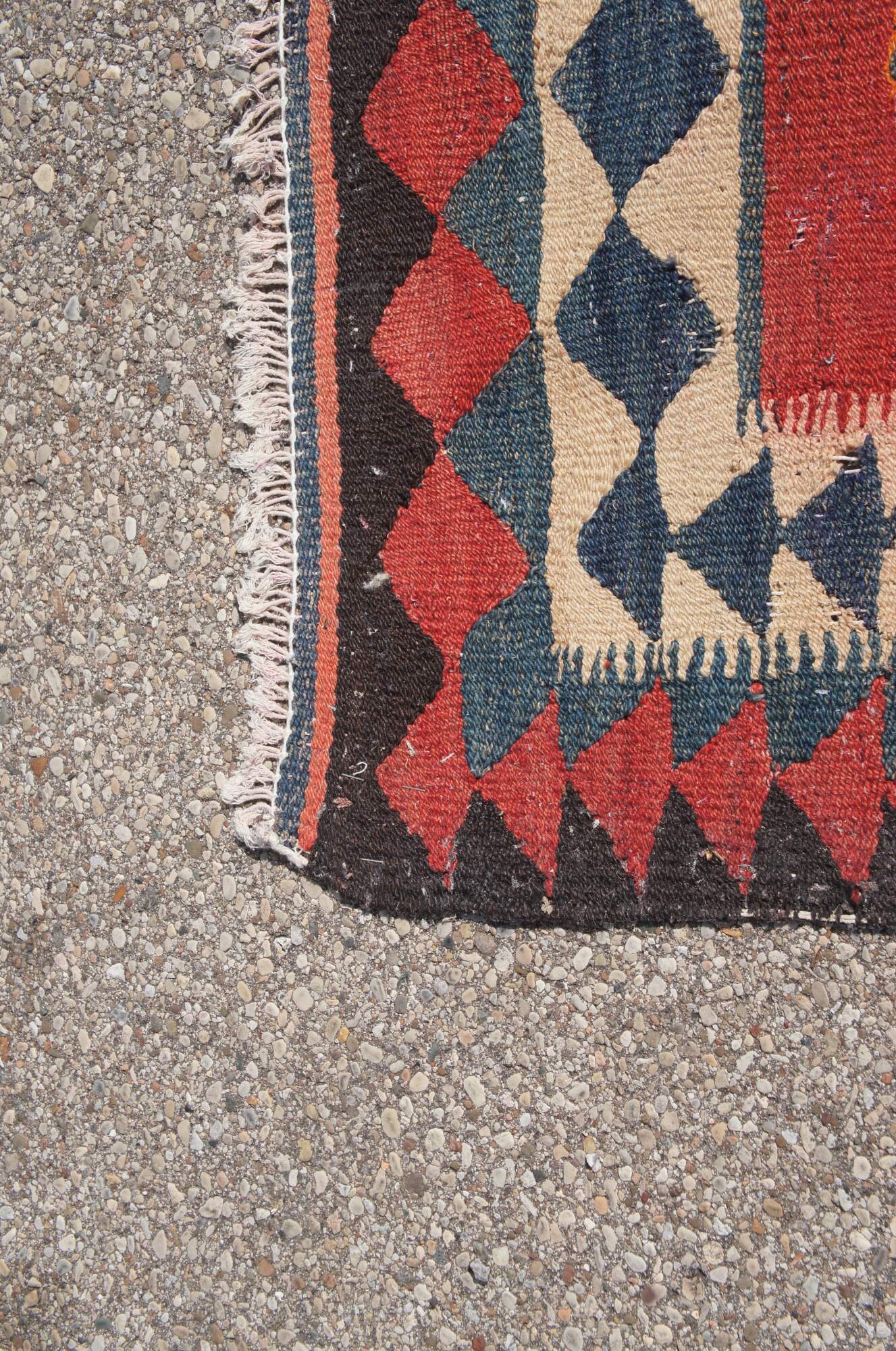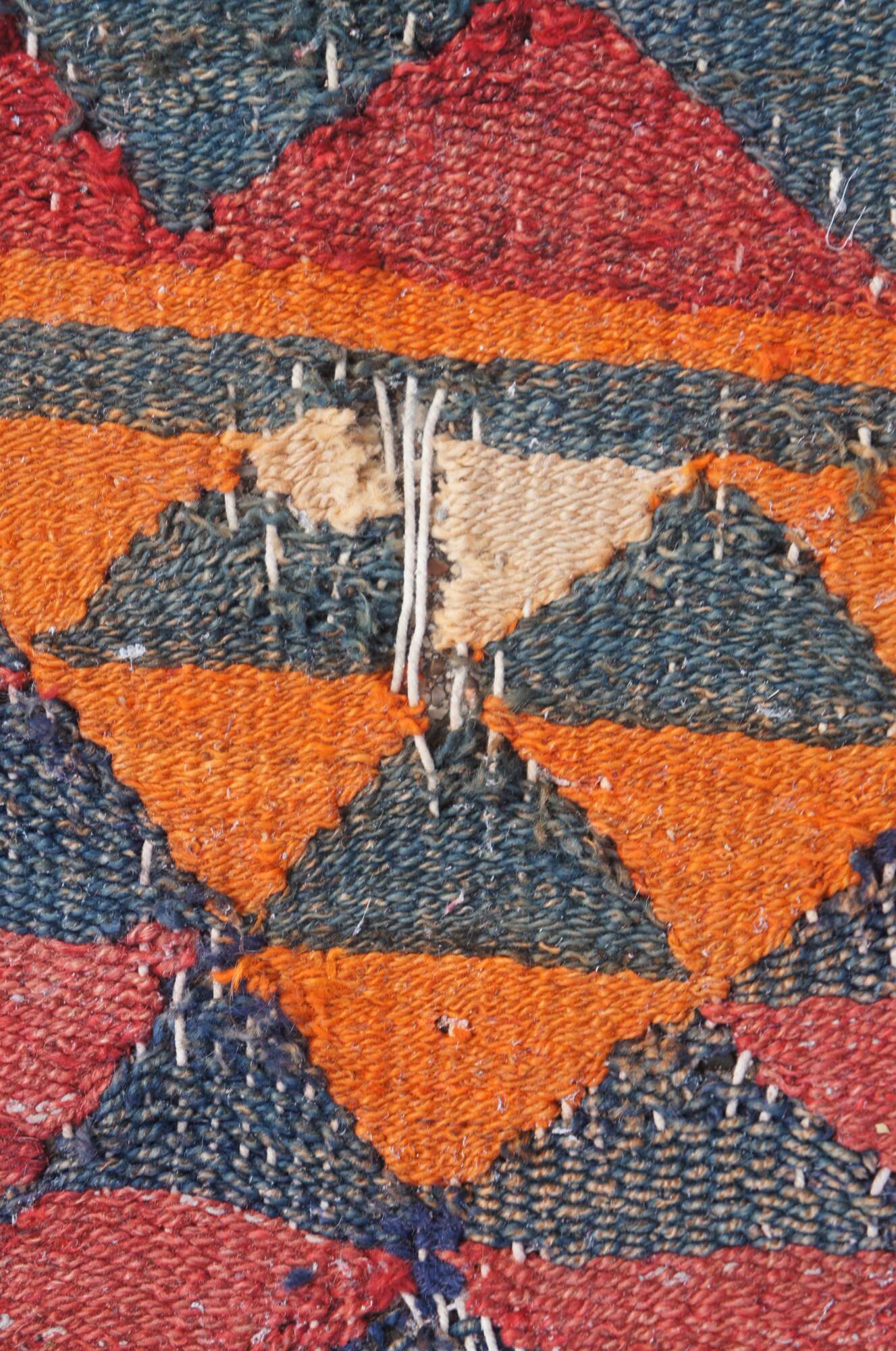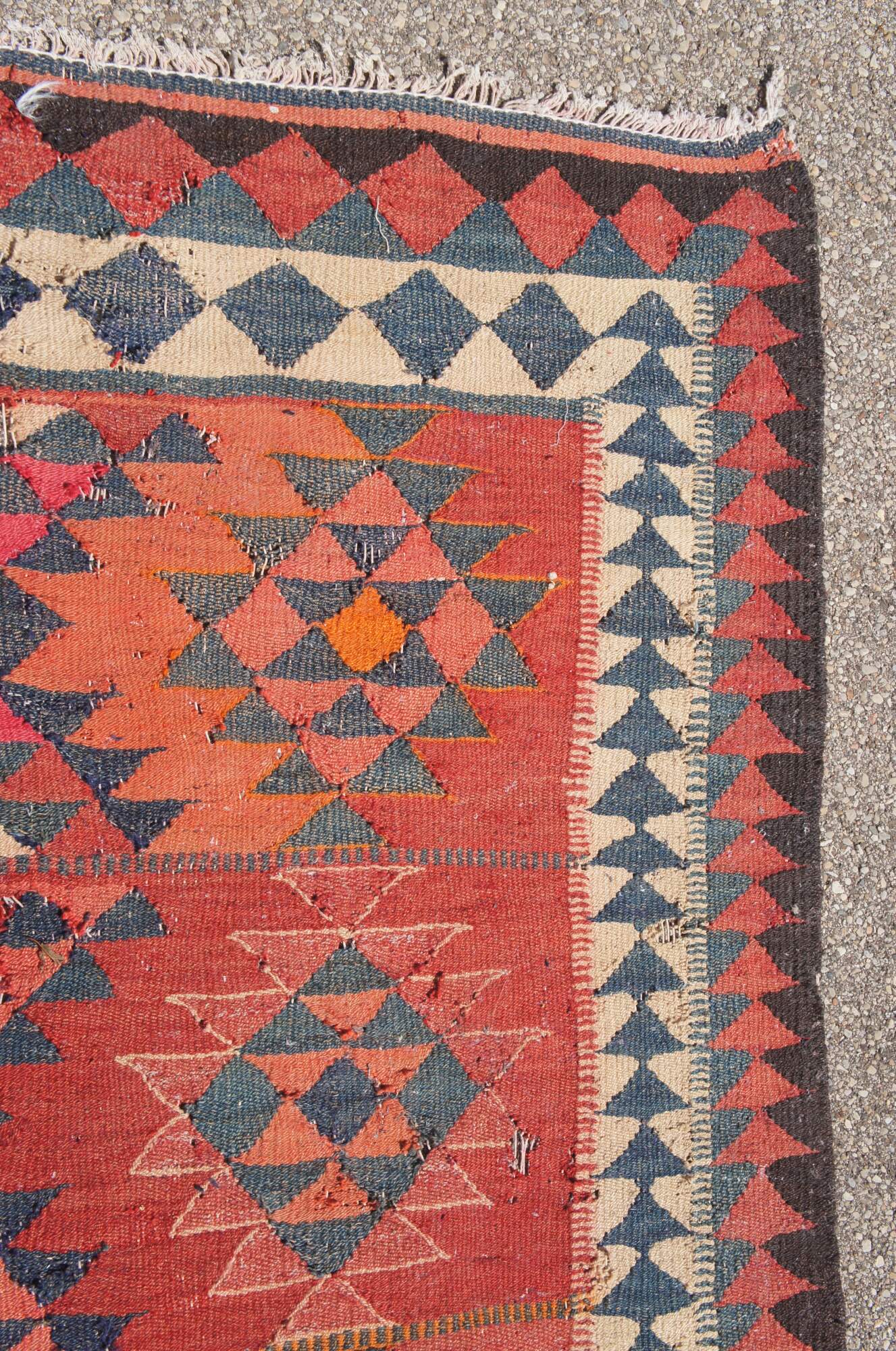 A colorful turkish kilim rug runner from the second half of the 20th century. Made from wool in Oushak (western) Turkey. Features a geometric pattern in red, blue orange and beige. Ushaks are flat-woven rugs that are on the thinner side of the rug spectrum. They are softer than other handmade rugs. These types of rugs are more durable than traditional rugs as they are made using natural fibers and dyes. Historically t hey are one of the oldest and finest Oriental carpets.