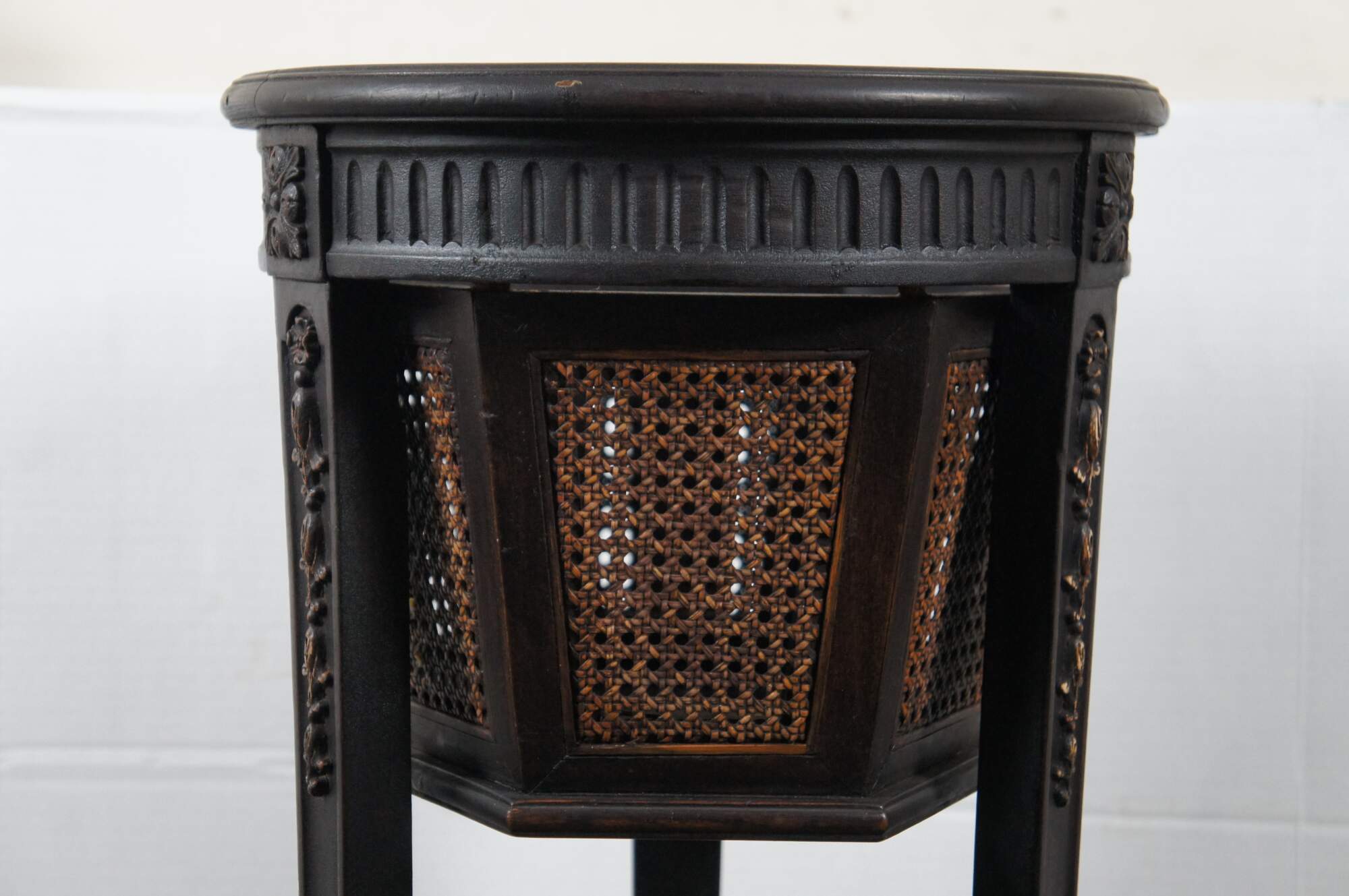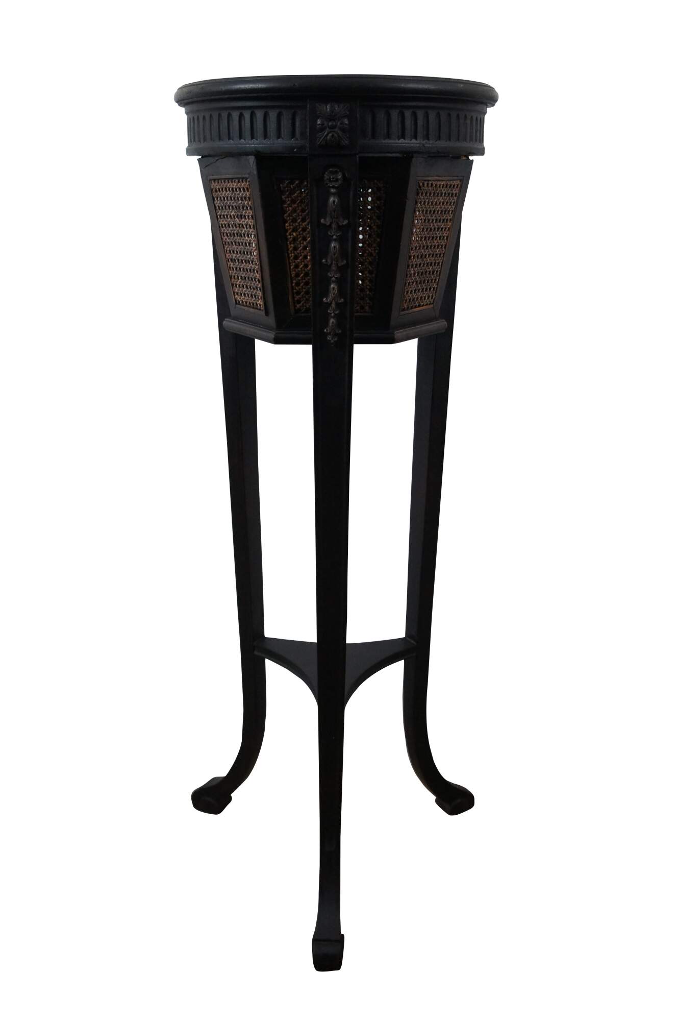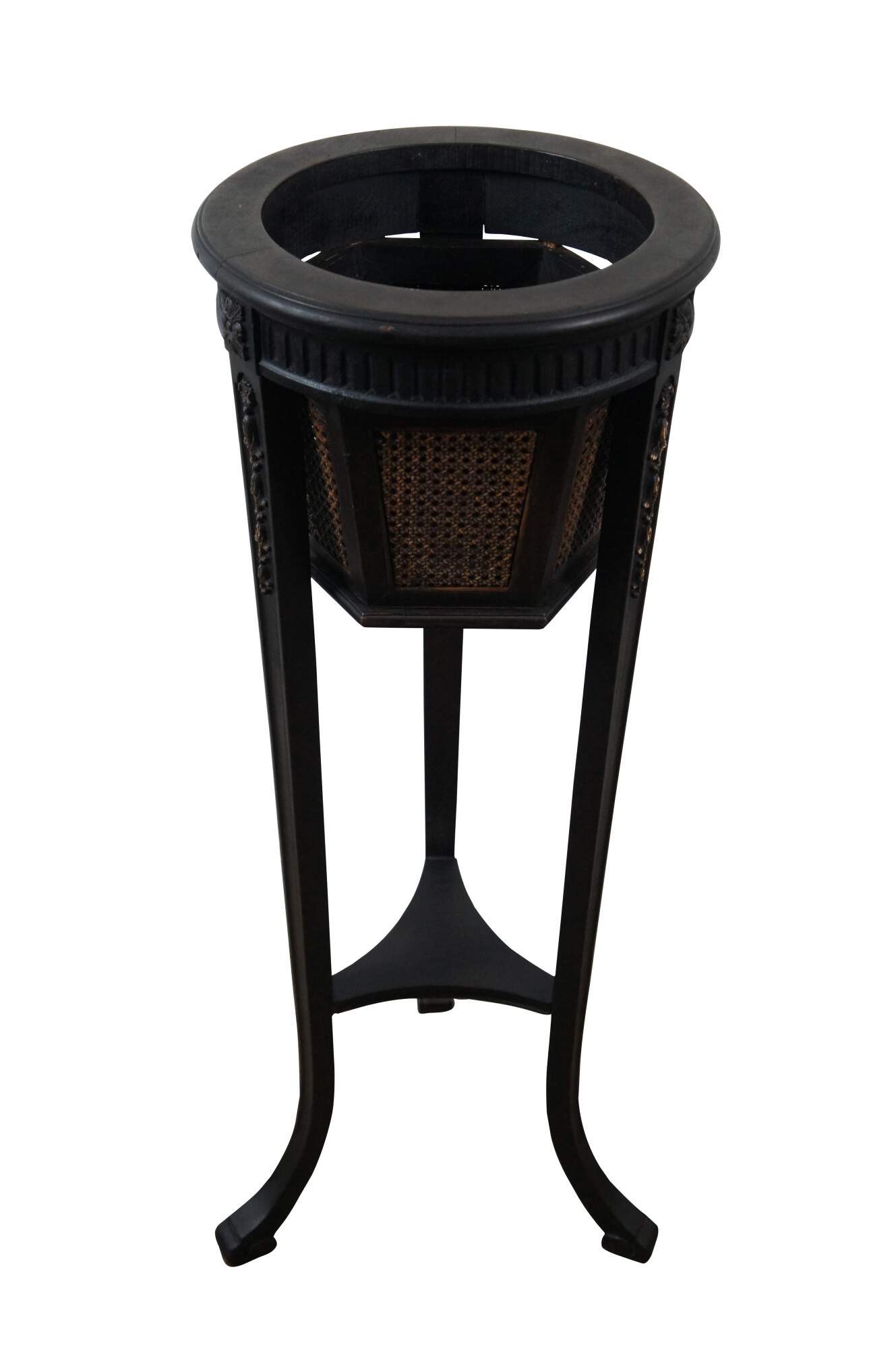 Antique Gustavian style plant stand featuring black painted mahogany frame with hexagon shaped caned planter, tapered tripod legs, and fluted and carved floral accents.