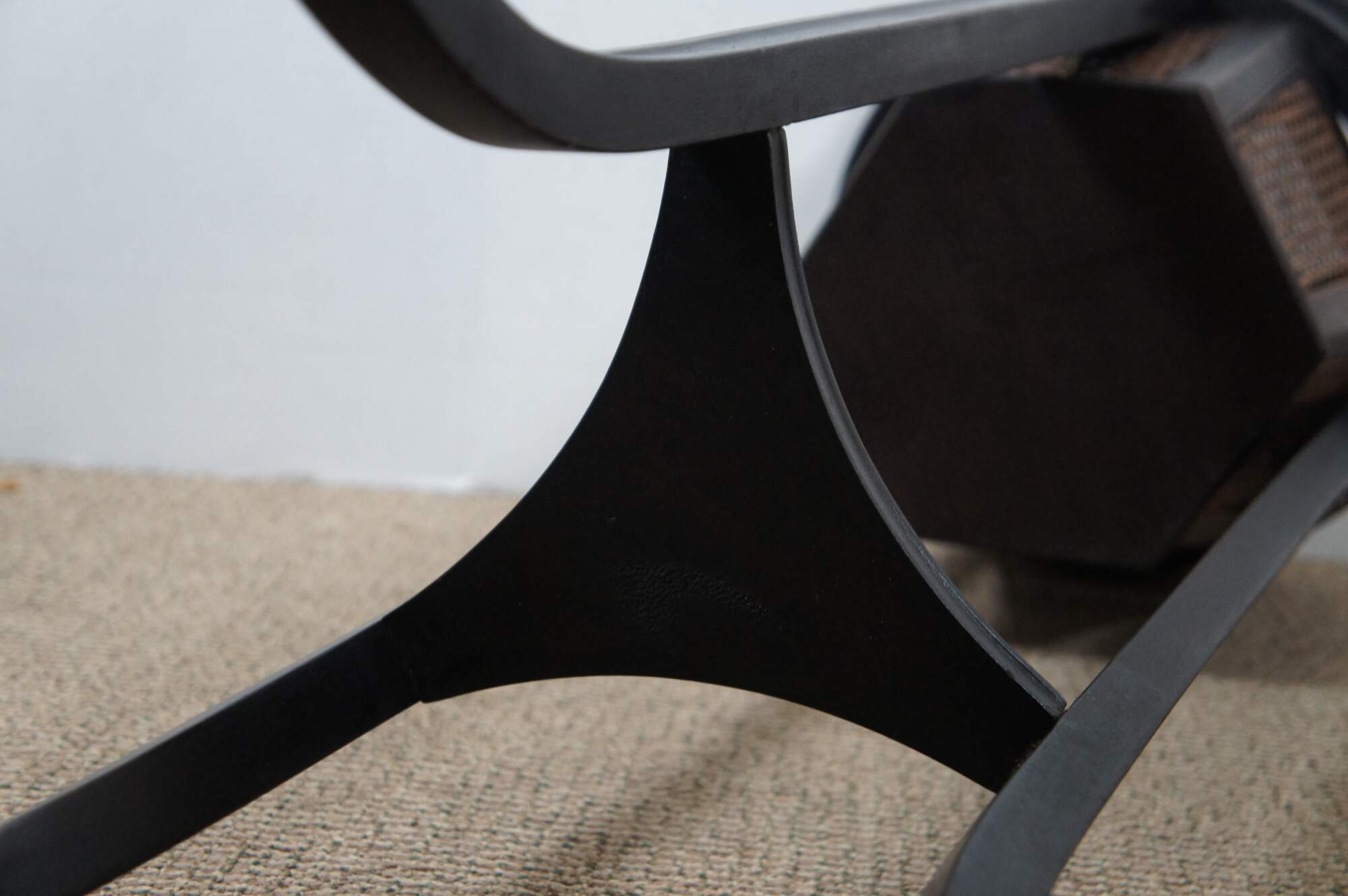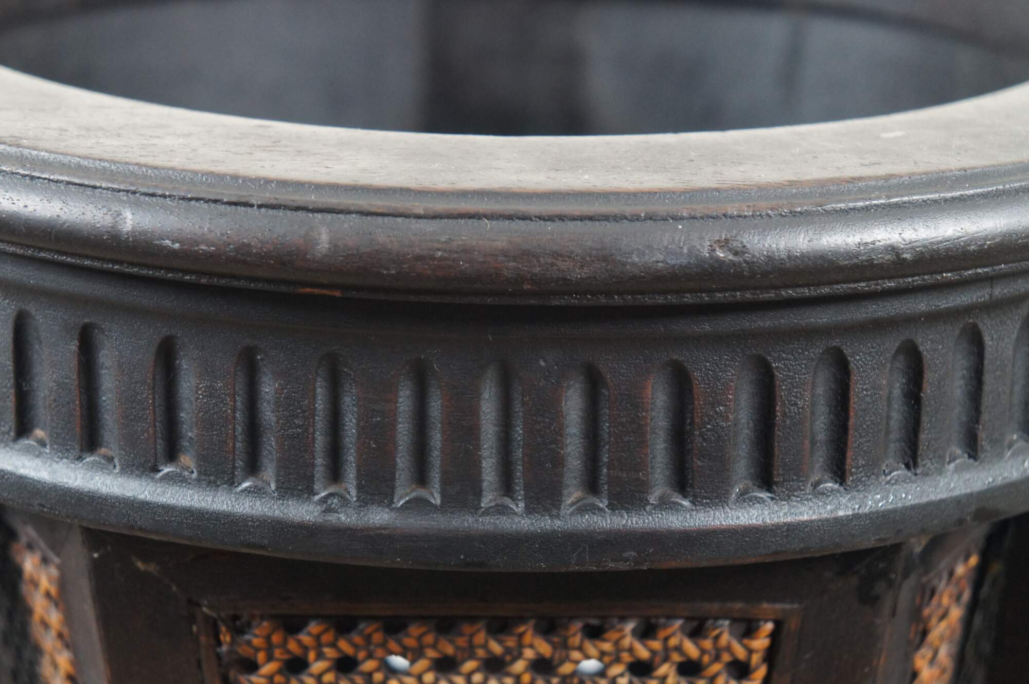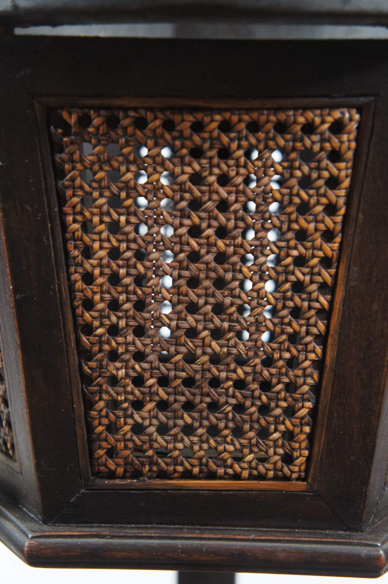 Antique Gustavian style plant stand featuring black painted mahogany frame with hexagon shaped caned planter, tapered tripod legs, and fluted and carved floral accents.