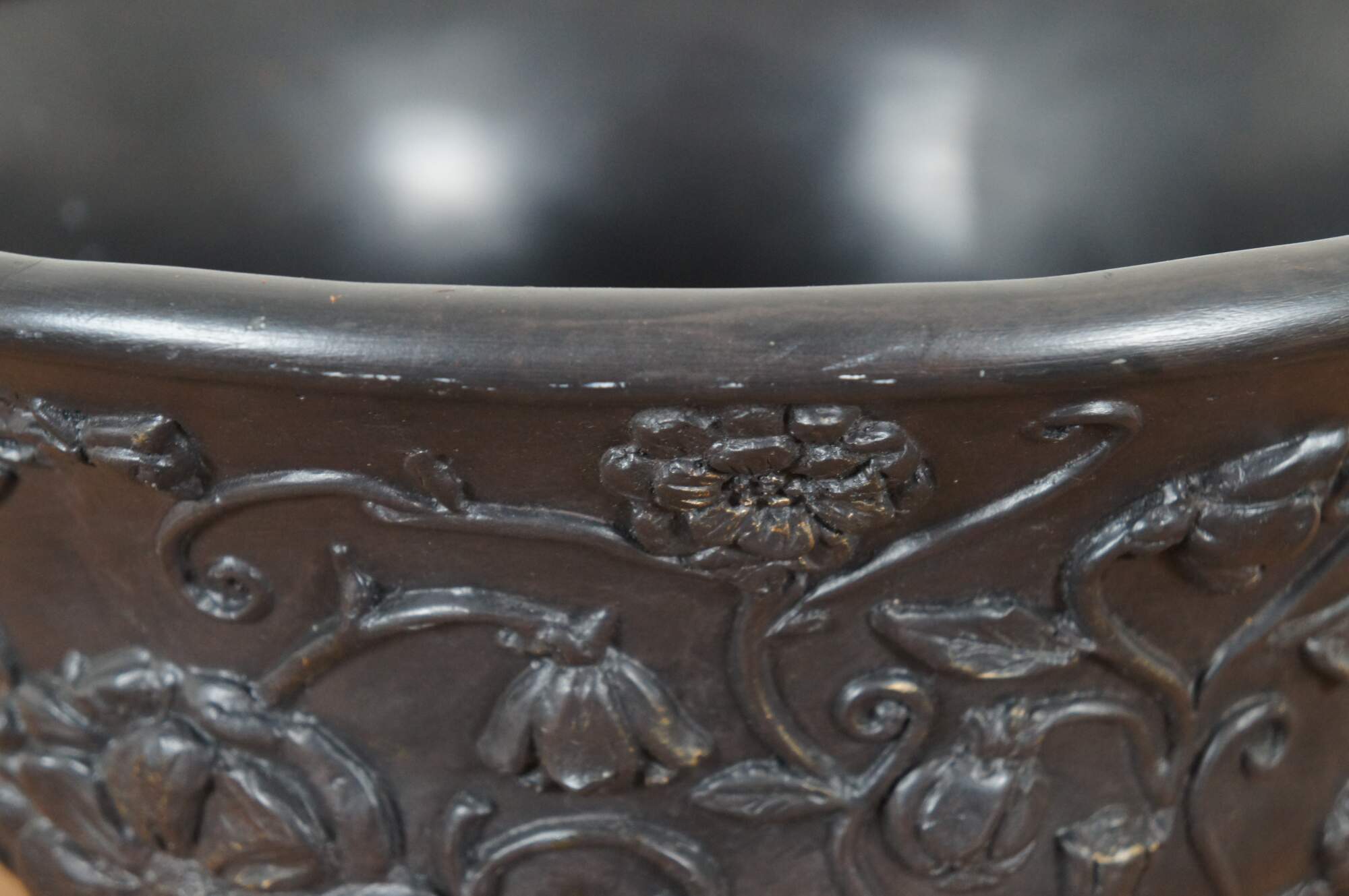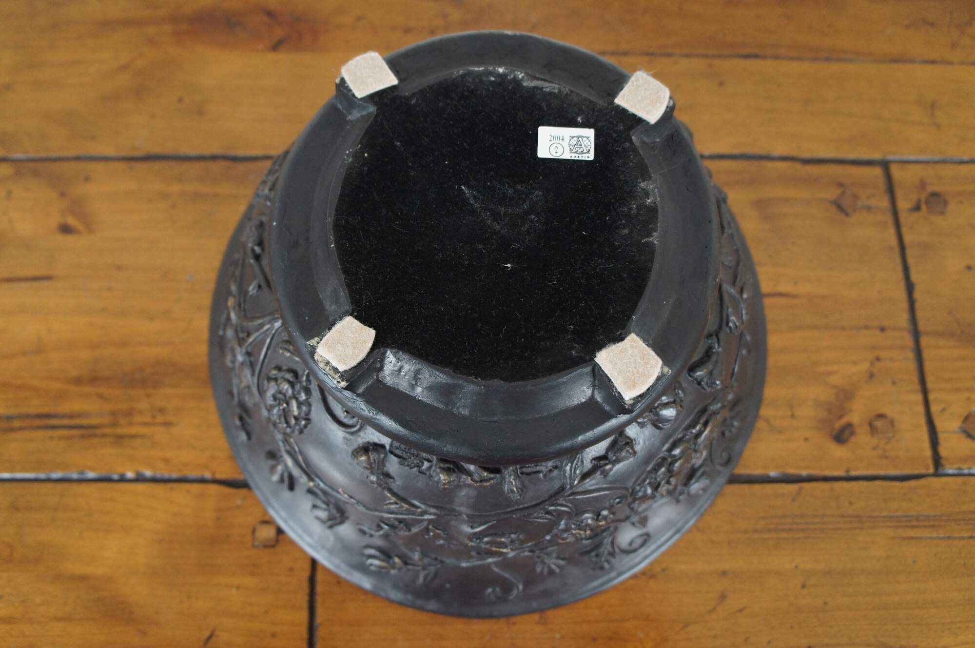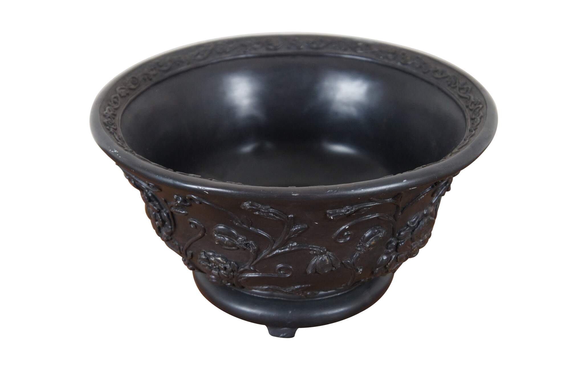 A rare Austin Productions Centerpiece, Jardinière or Bowl. Features a black finish with low relief floral and chrysanthemum design. The bowl is signified by a flared mouth with detailed rim and chrysanthemum at the center of the base. The pot has a built in footed base. Marked along underside. Made from composition