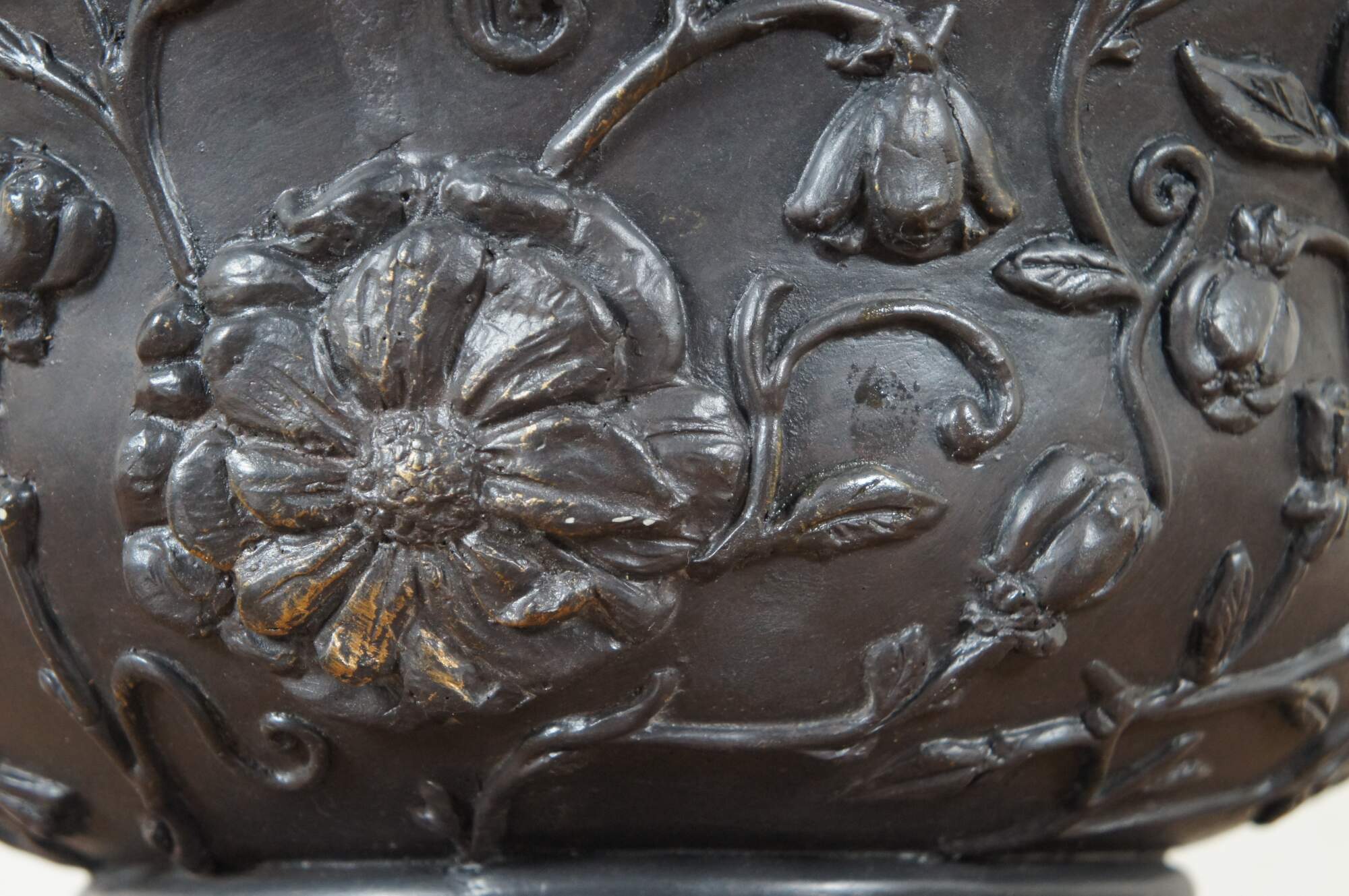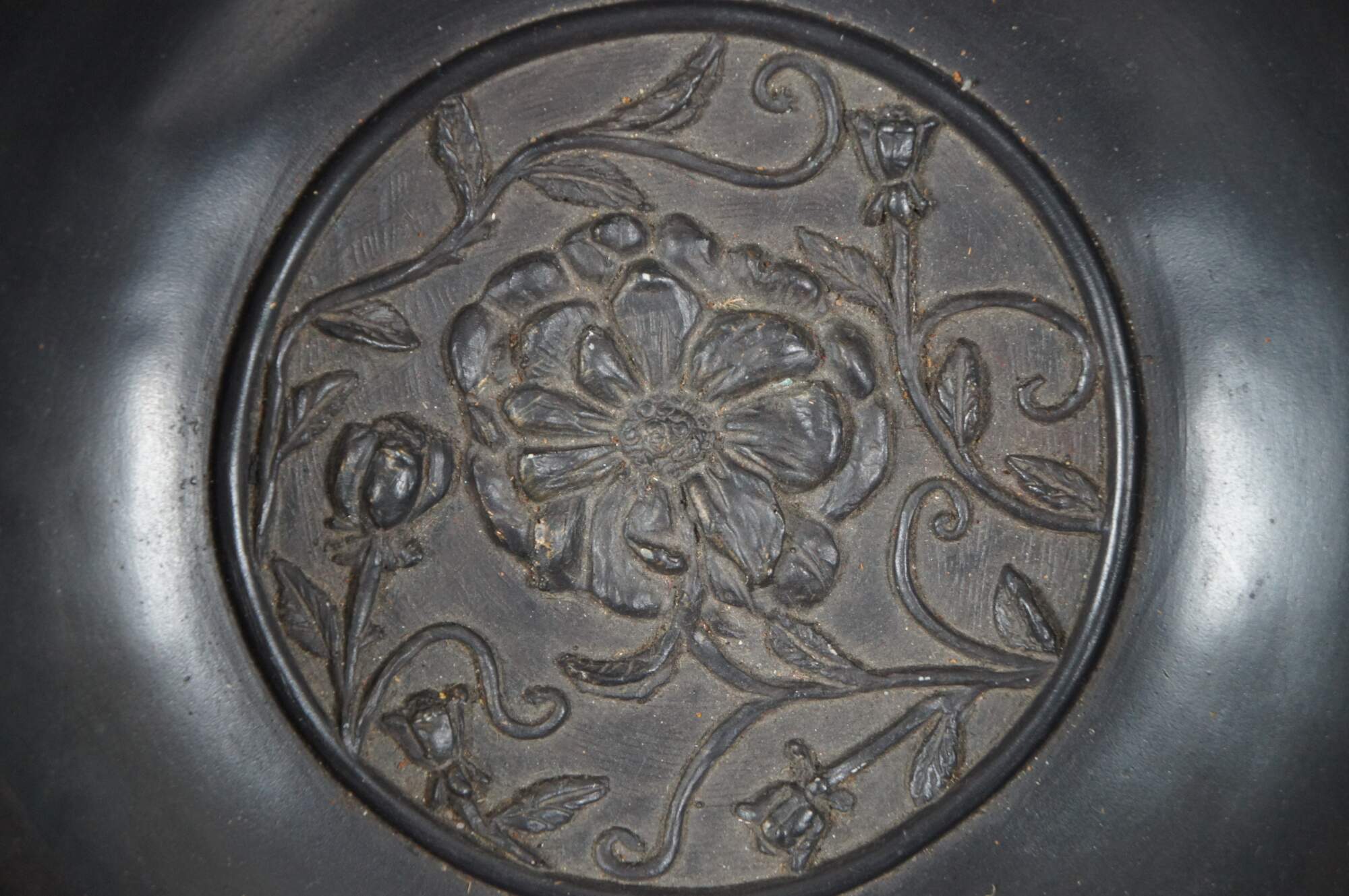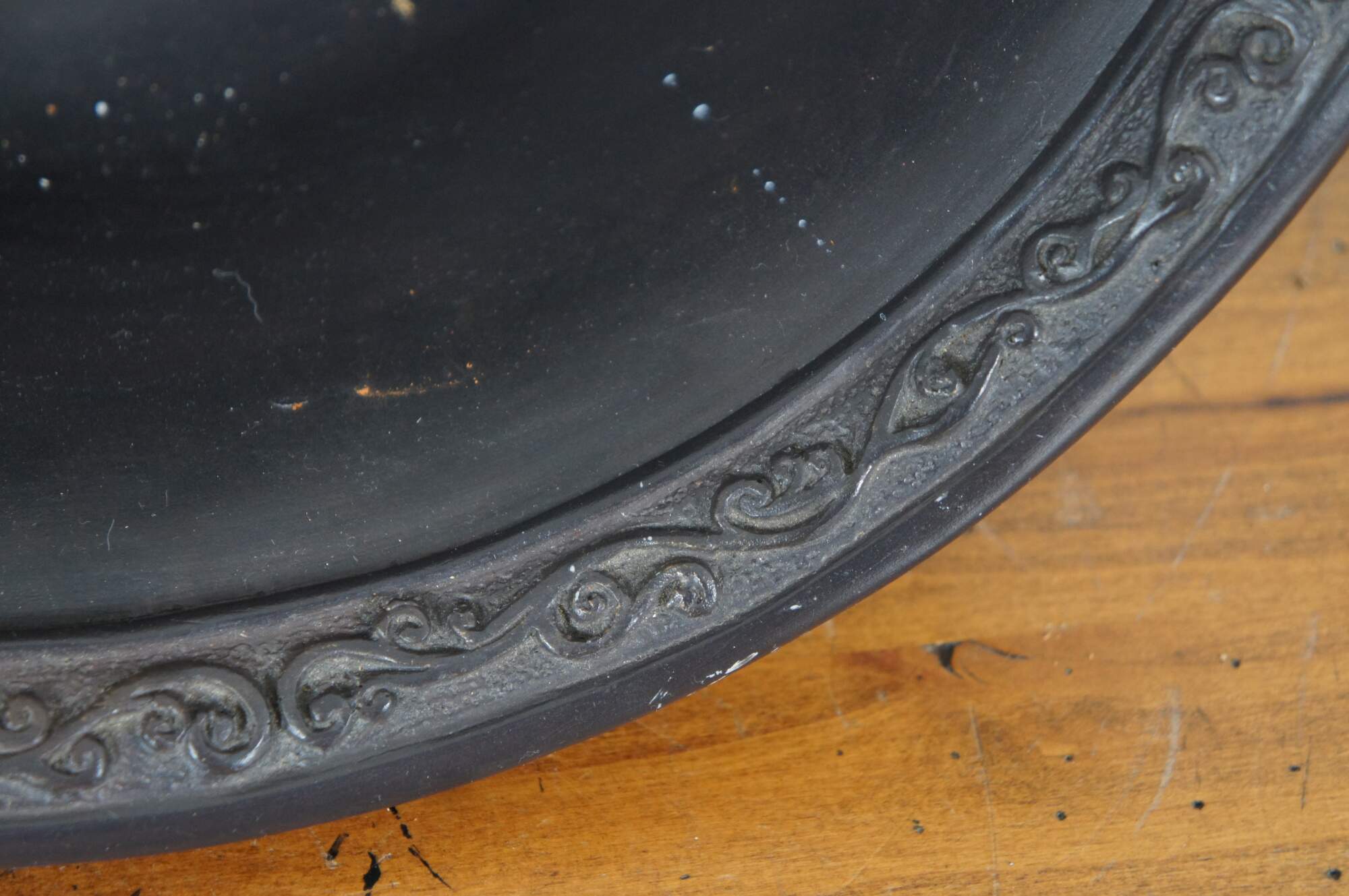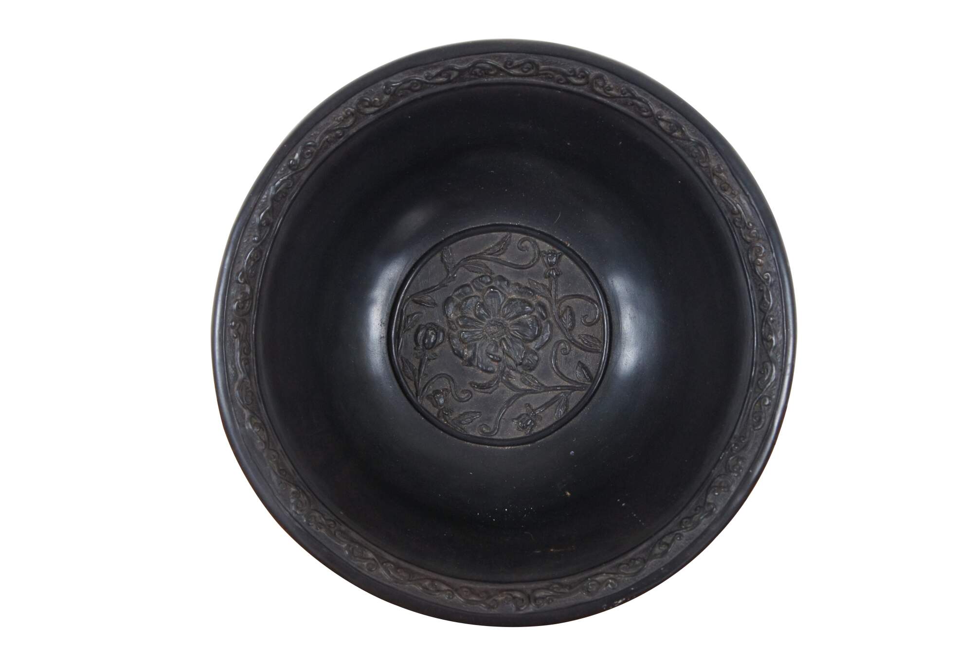 A rare Austin Productions Centerpiece, Jardinière or Bowl. Features a black finish with low relief floral and chrysanthemum design. The bowl is signified by a flared mouth with detailed rim and chrysanthemum at the center of the base. The pot has a built in footed base. Marked along underside. Made from composition