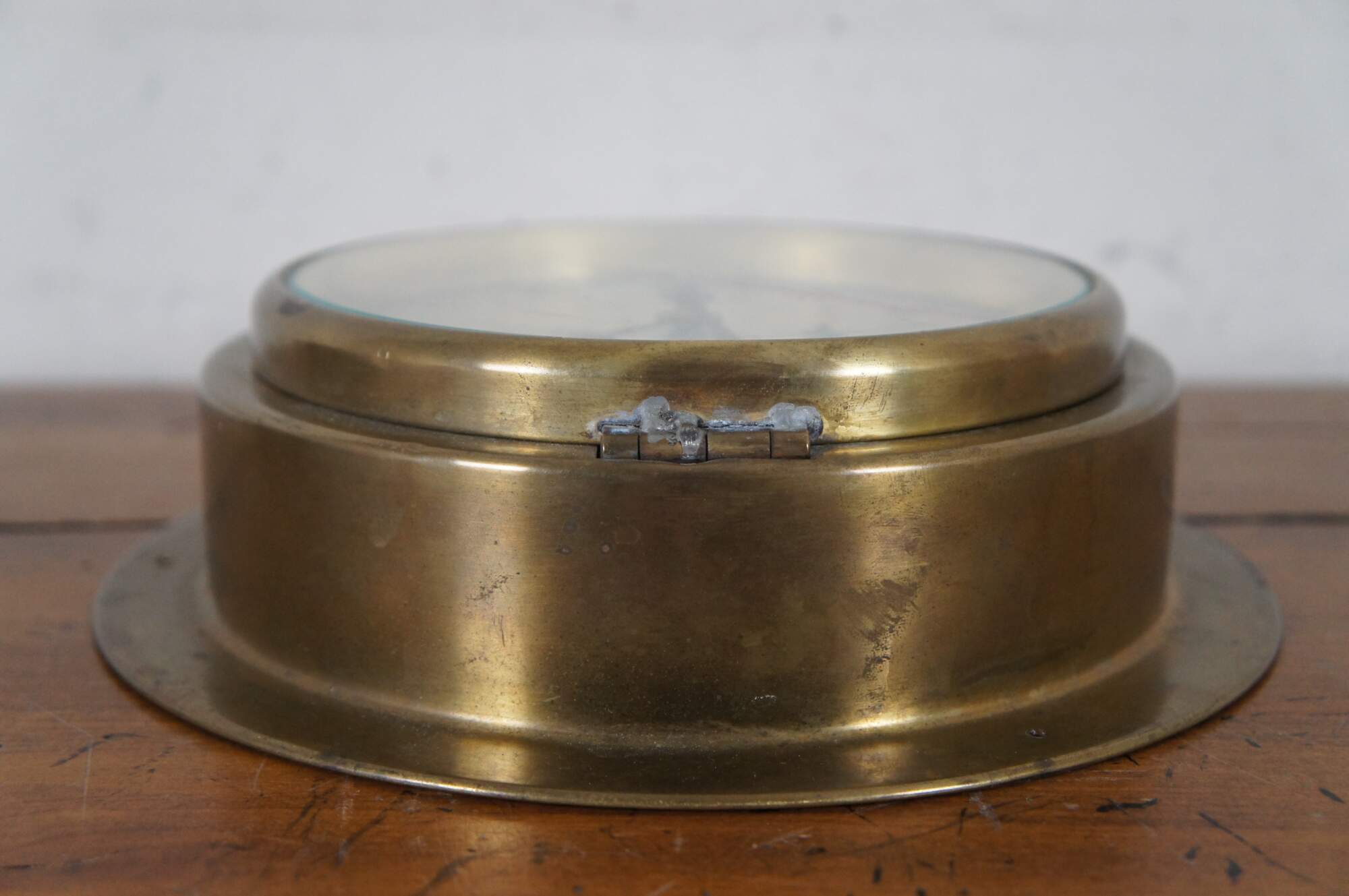 Mid 20th century key wound port hole clock. Features a brass frame with metal dial and glass window. Hangs via 3 screw holes at the base. Marked along the face EW
