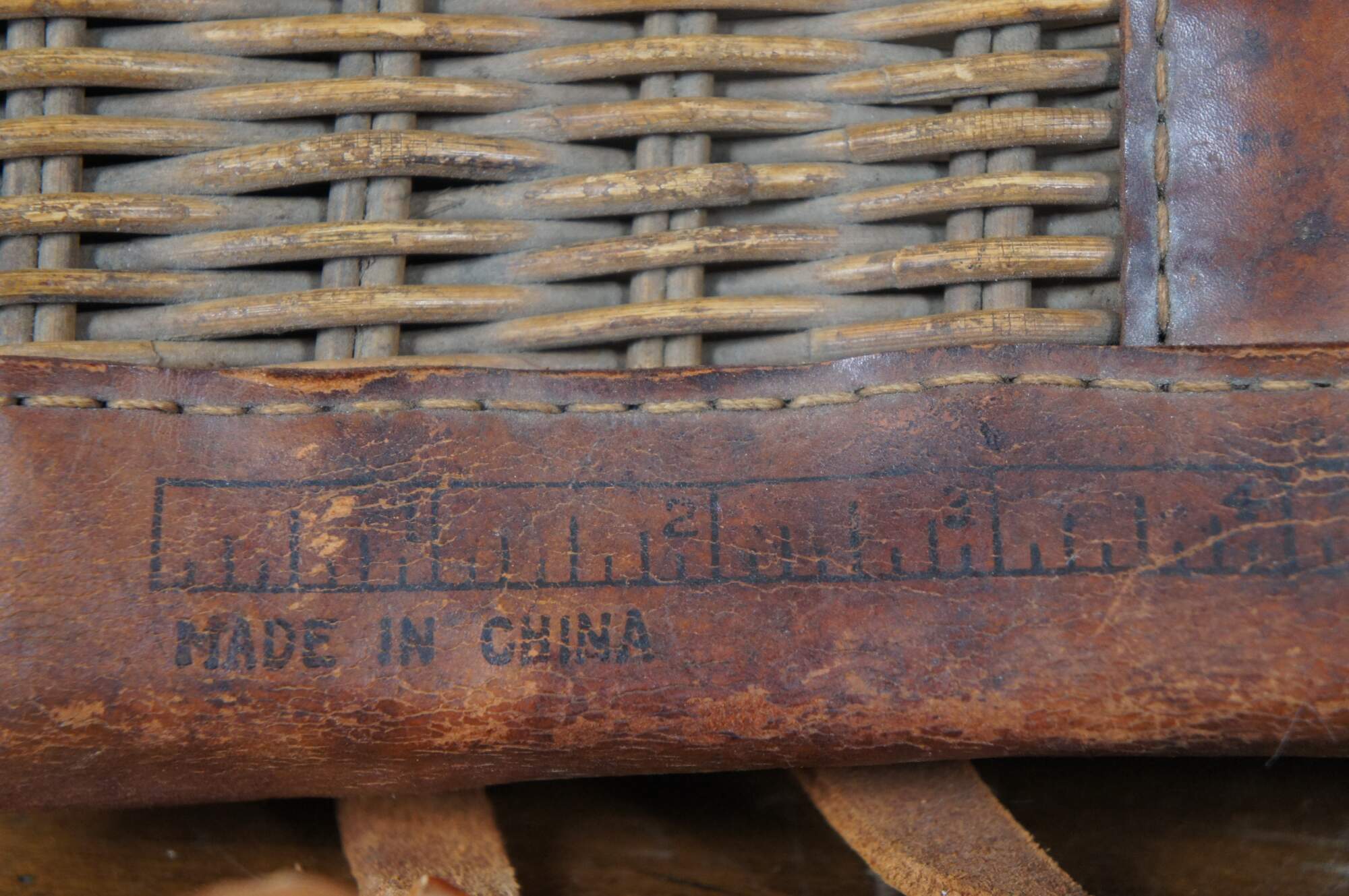 Montana fly fishing vintage creel, circa 1930-1940's. The creel features a tightly woven wicker, leather wrapped rims to the lids, support for the shoulder strap, and a buckle and strap closure. Made in China