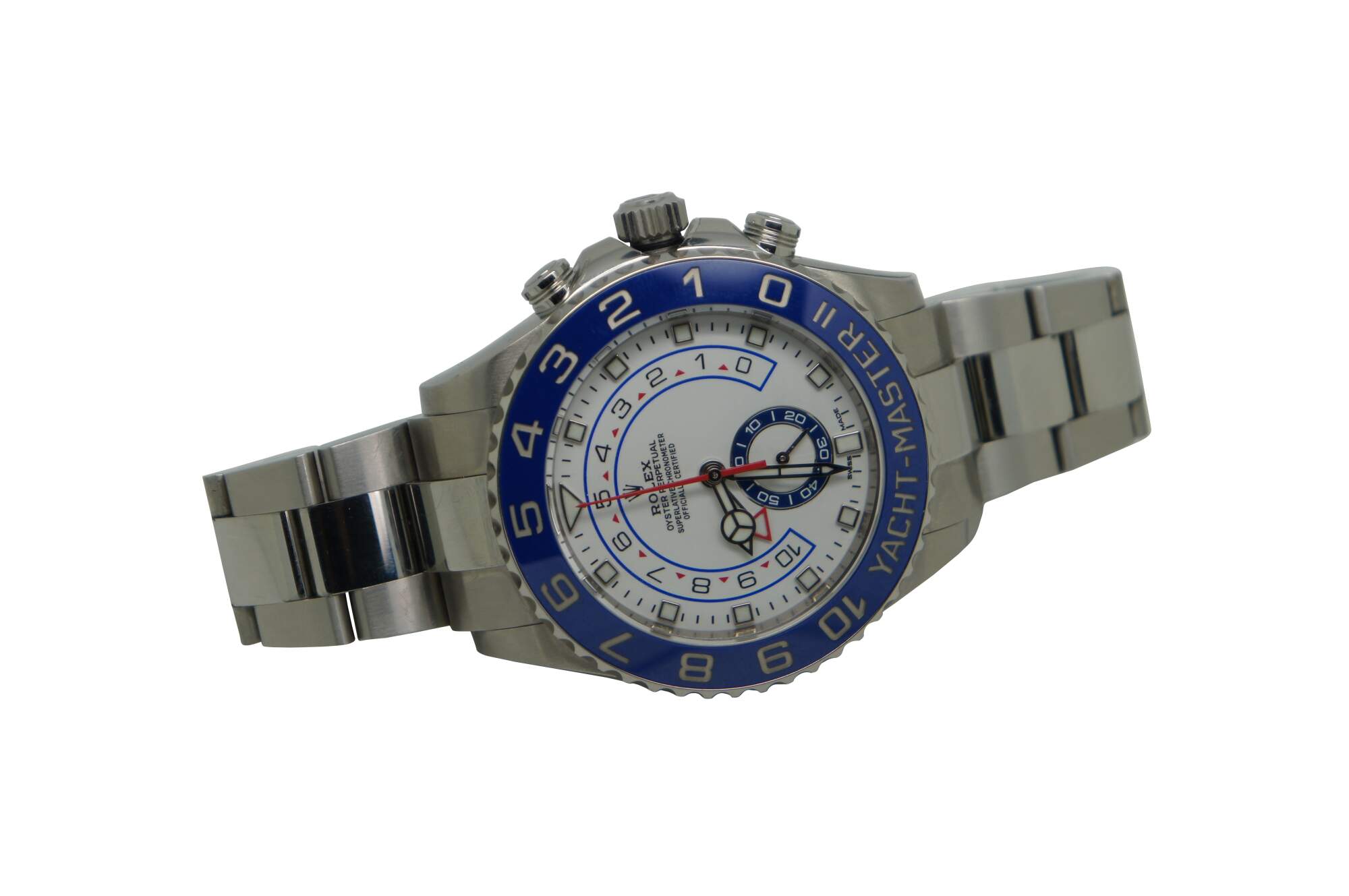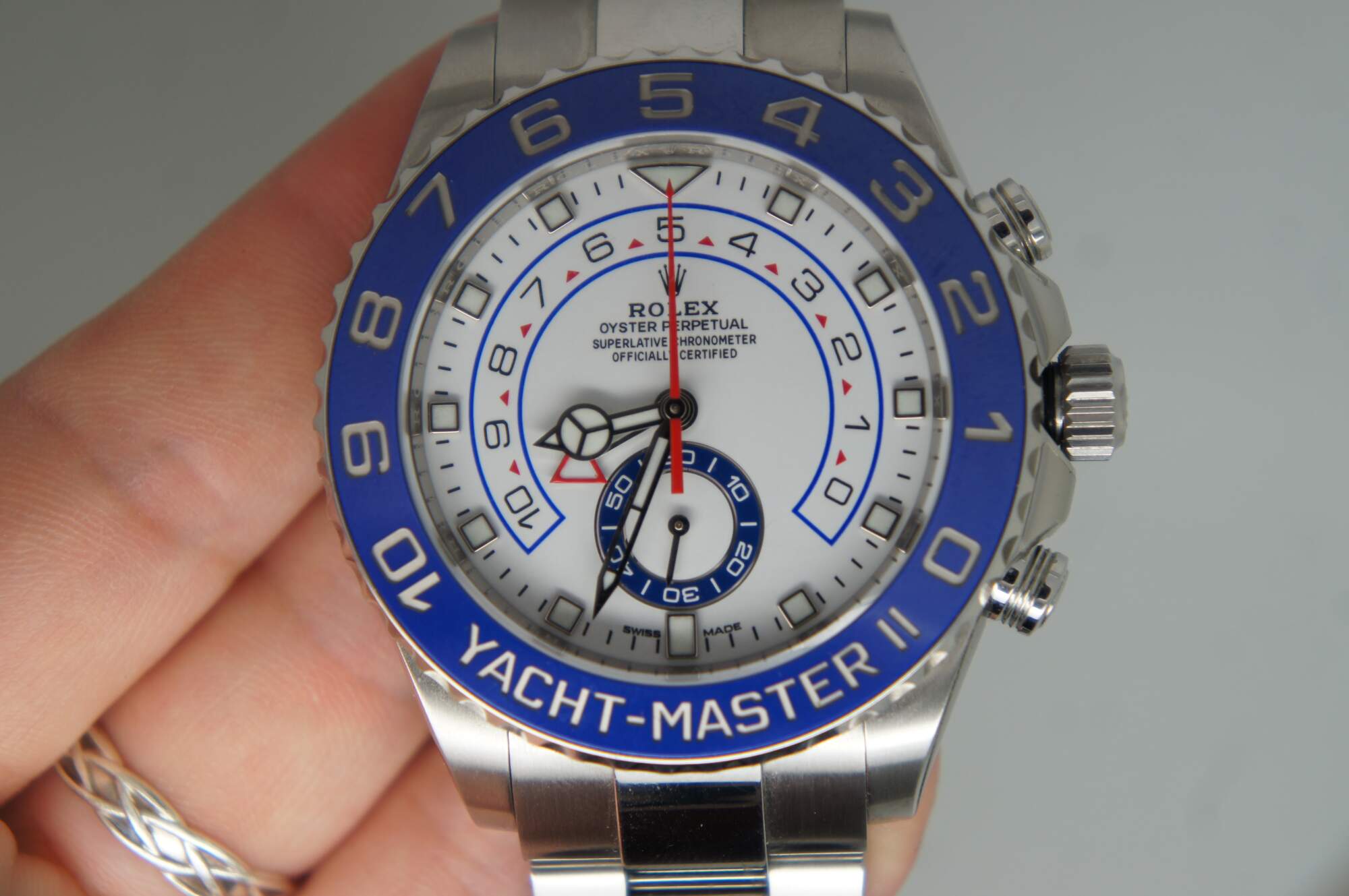 The Yacht-Master II comes with a nautical function that is a programmable countdown that works in tandem with mechanical memory and on-the-fly synchronization. The stainless steel 44 mm case is assembled with a screw-down case back and a winding crown. This timepiece is powered by the self-winding 4161 calibre which has a programmable countdown and a 72-hour power reserve. Comes with Box, Papers and watch card