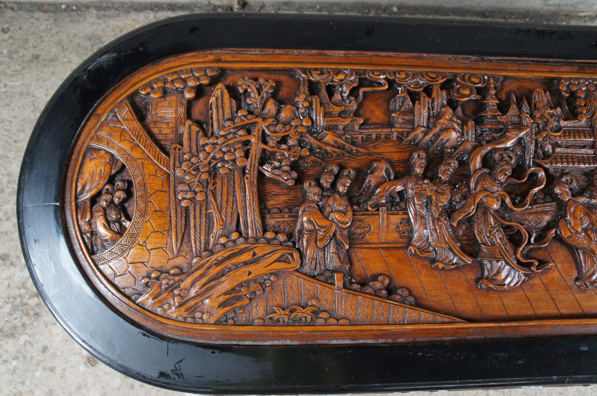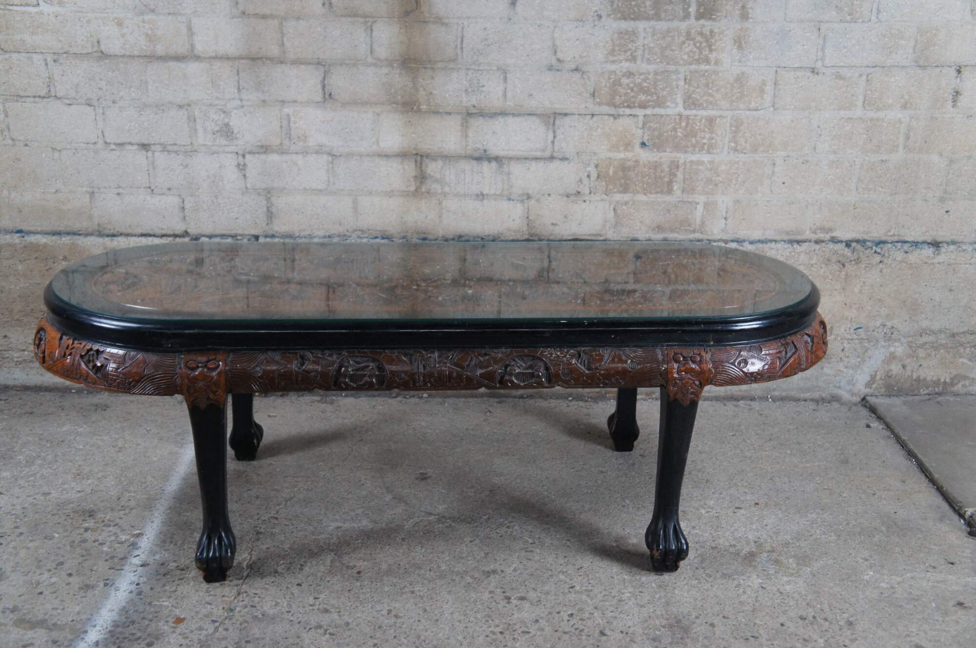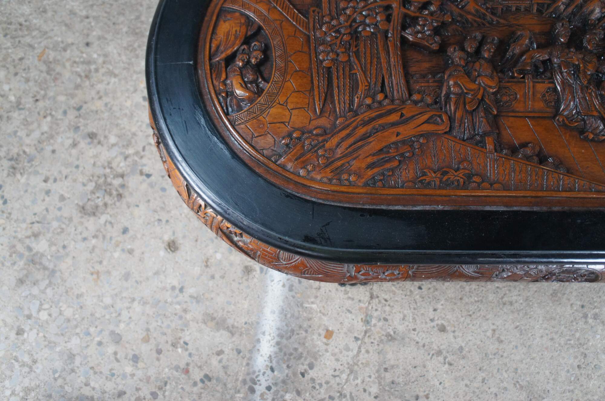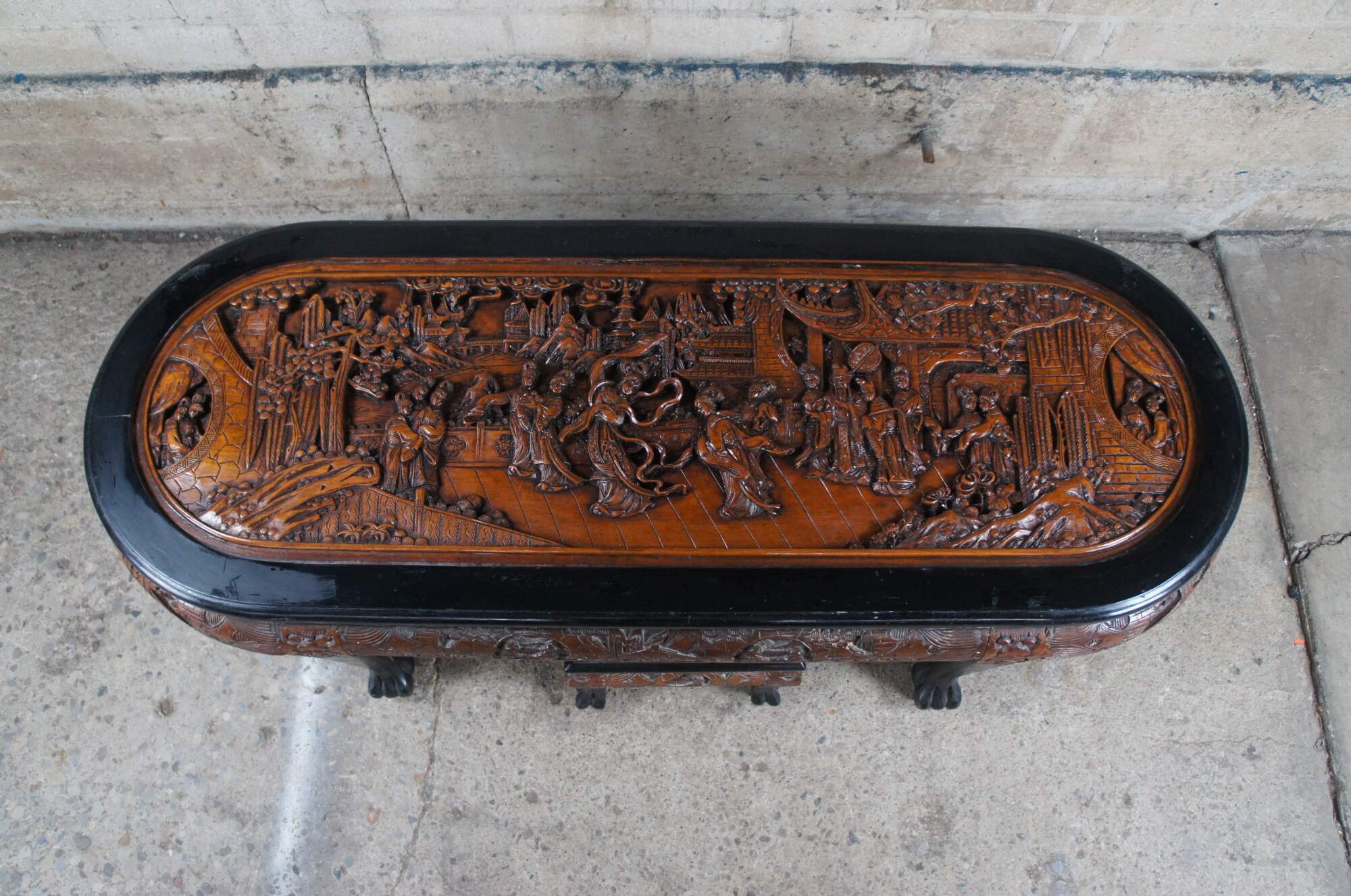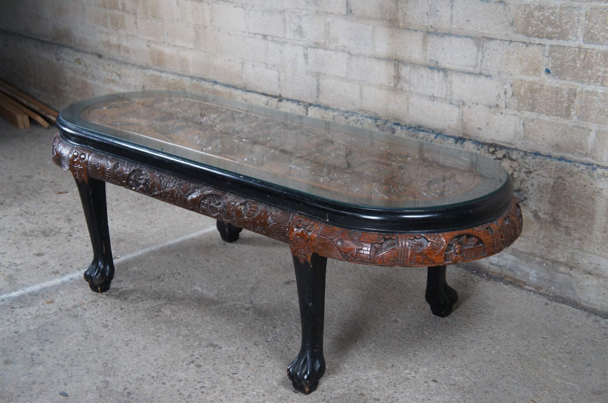 Vintage Chinese Chinoiserie oval coffee / cocktail / dining / tea table and four nesting stools. Made of elm and black lacquer featuring a carved landscape scene with Emporer, dancing Geishas, pagodas, Cherry Blossom trees, dragon faces and claw / paw feet.