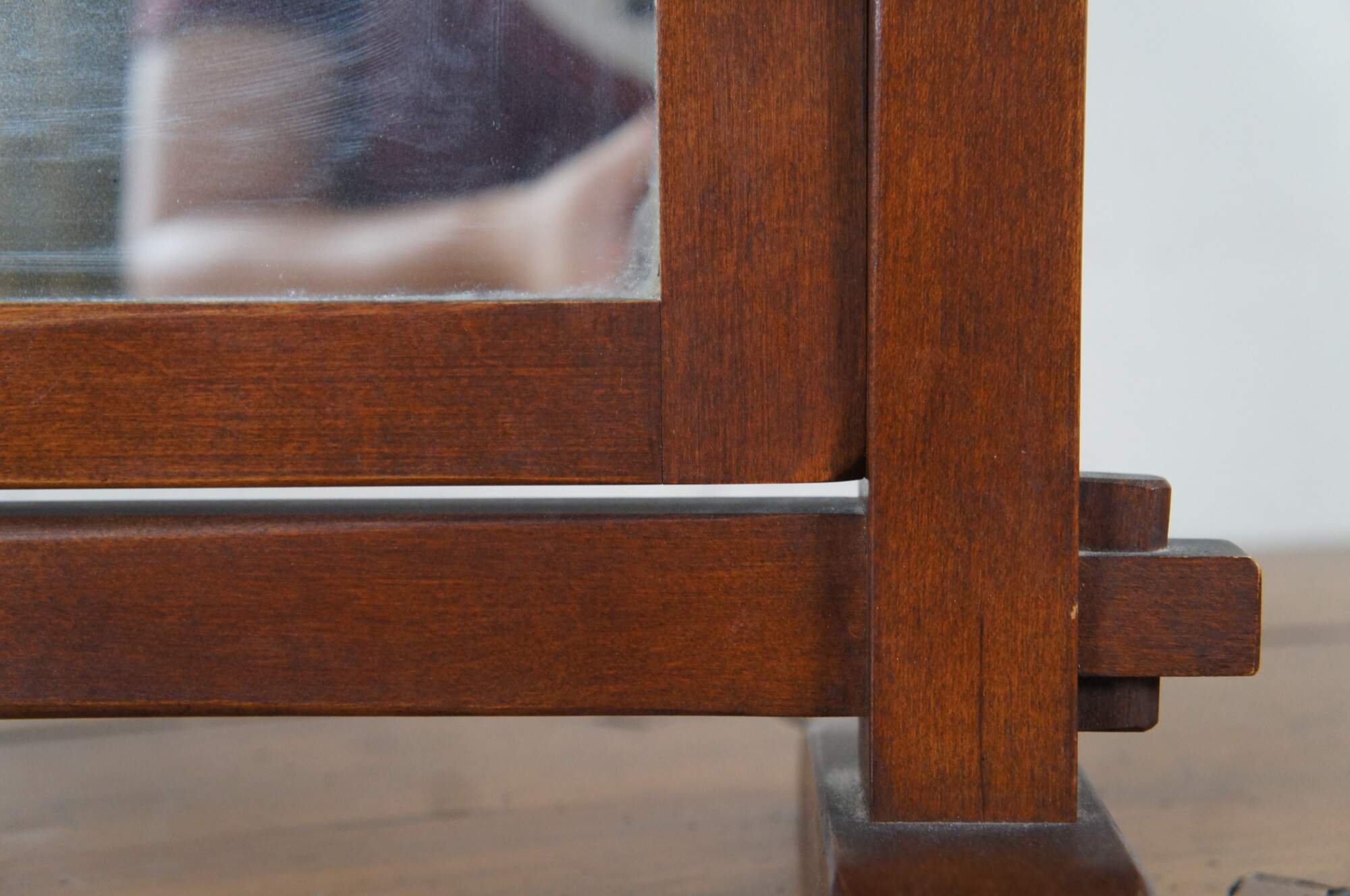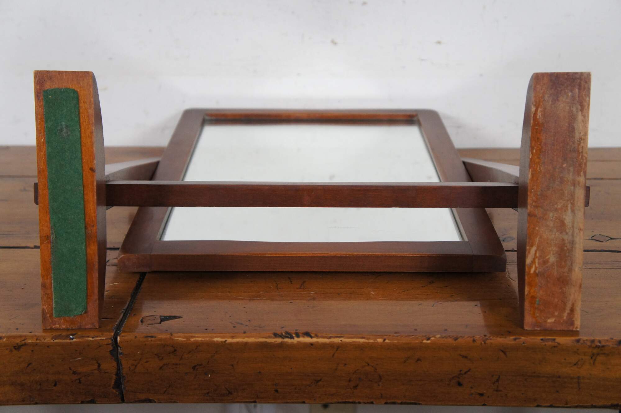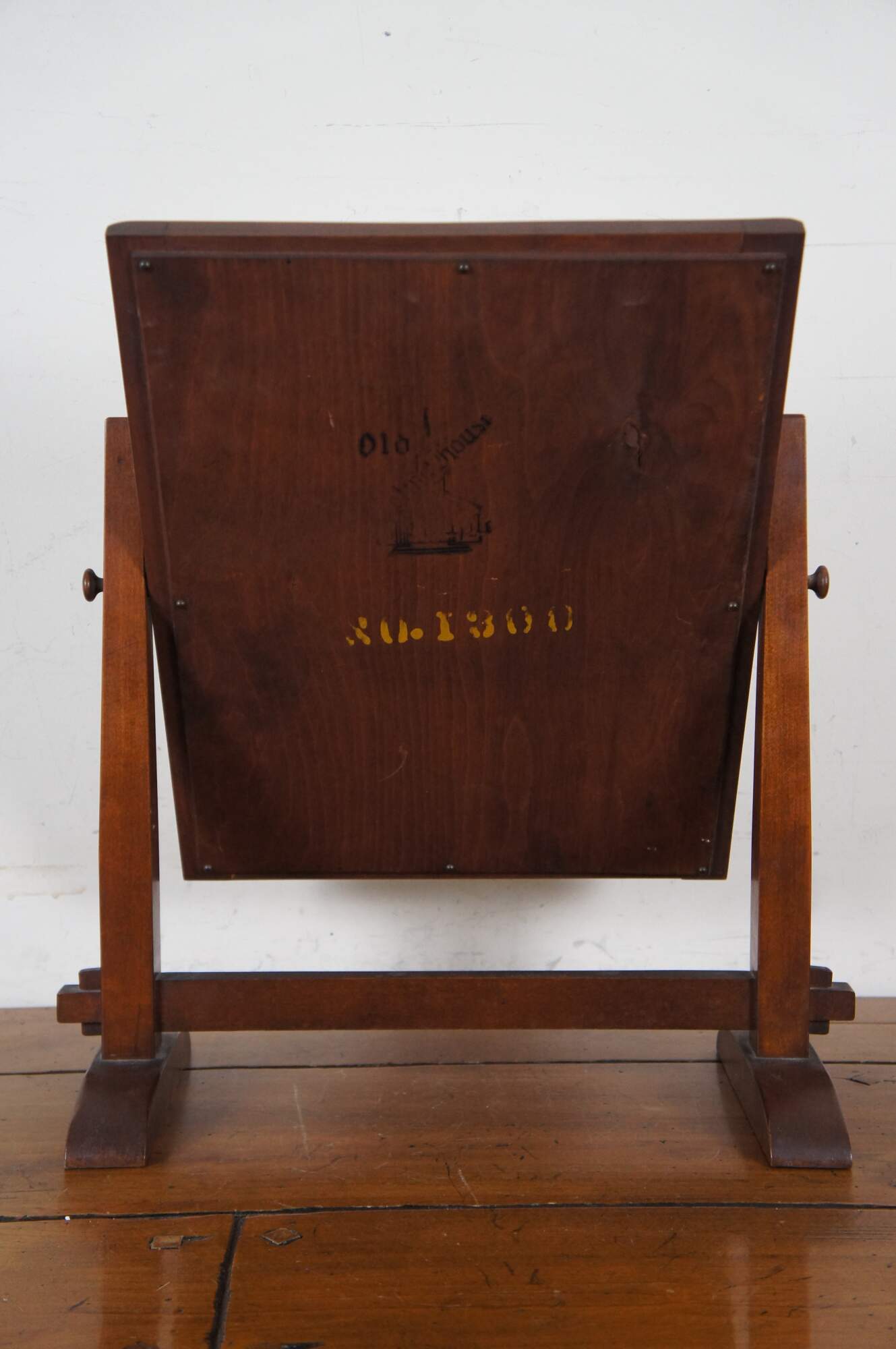 Antique Old Meeting House dresser / table top shaving or vanity mirror. Made of maple featuring Mission styling with swivel stand.