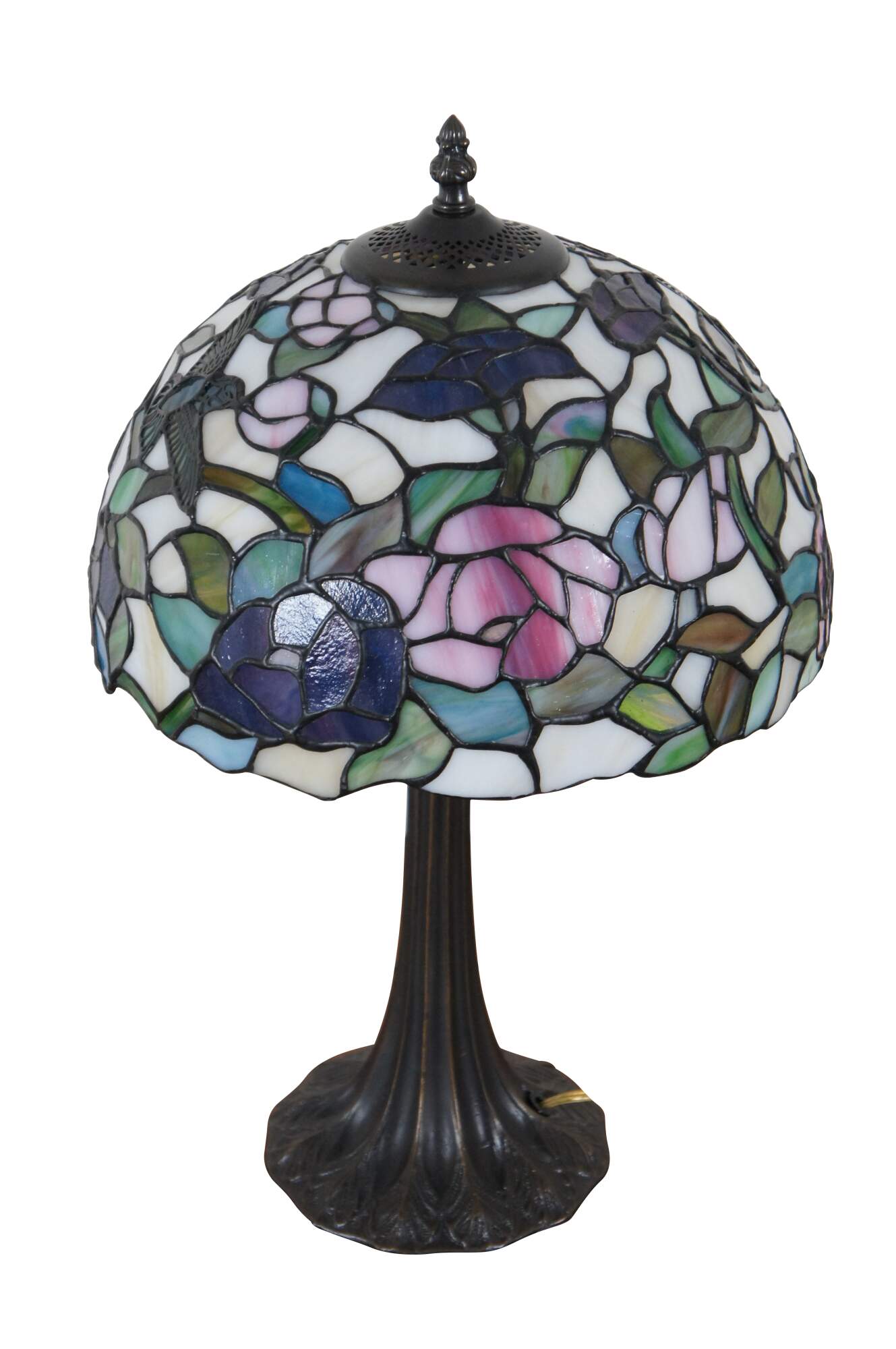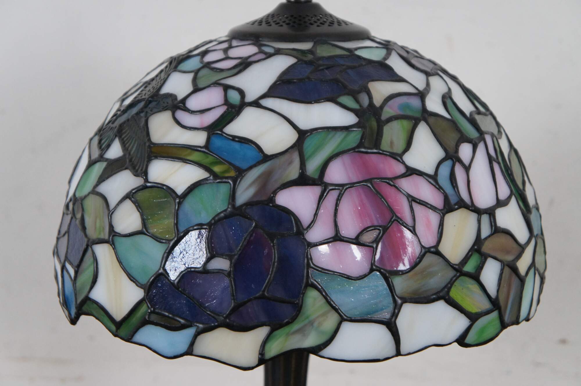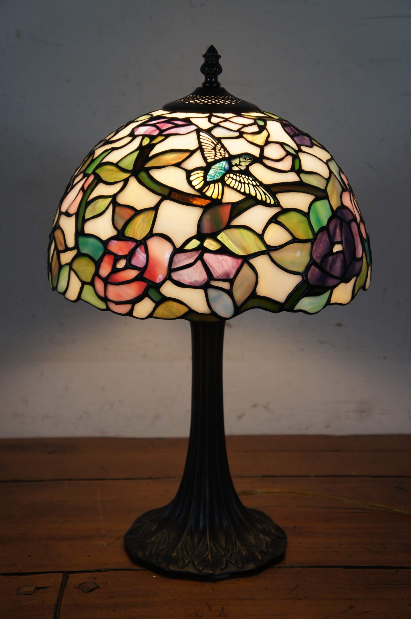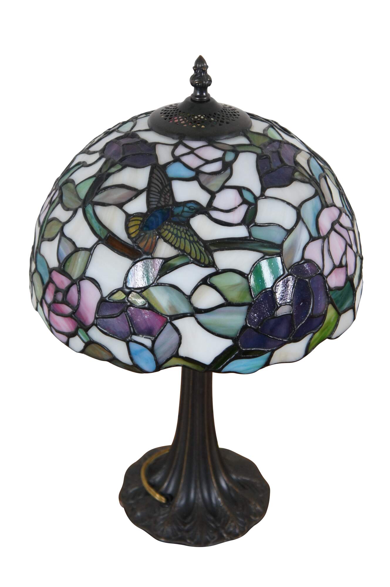 Vintage Tiffany style parlor table lamp. Made of stained glass featuring Art Nouveau styling with a floral / rose and Hummingbird shade and leaf design tapered body.