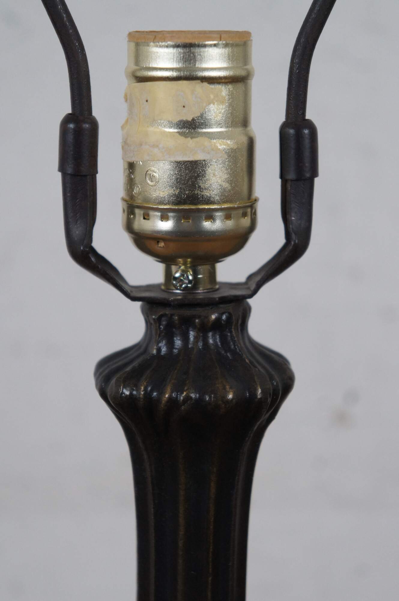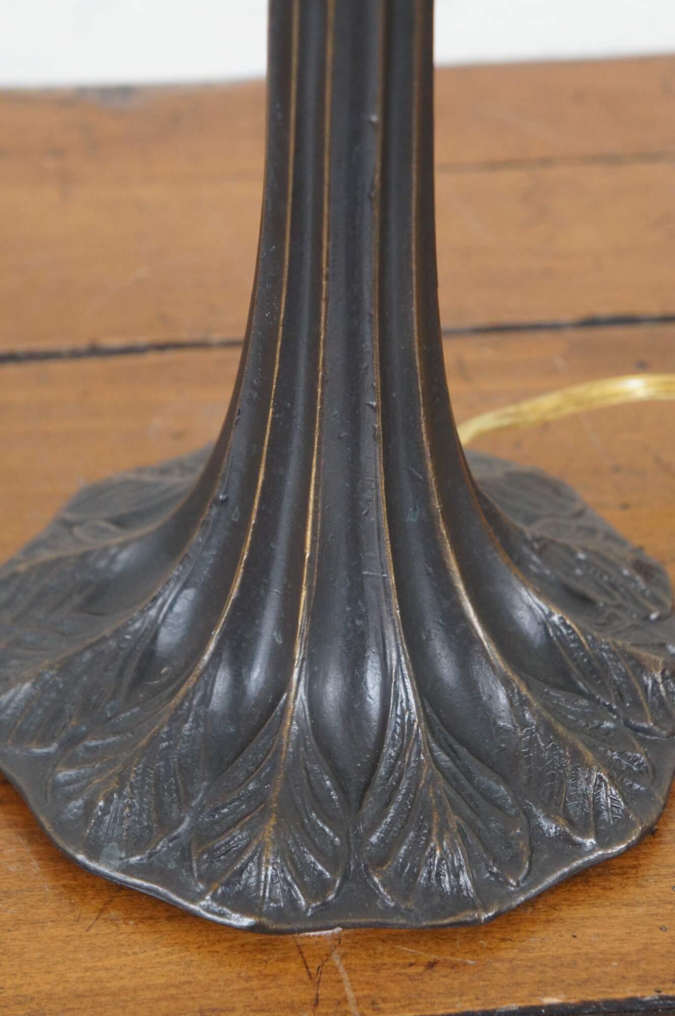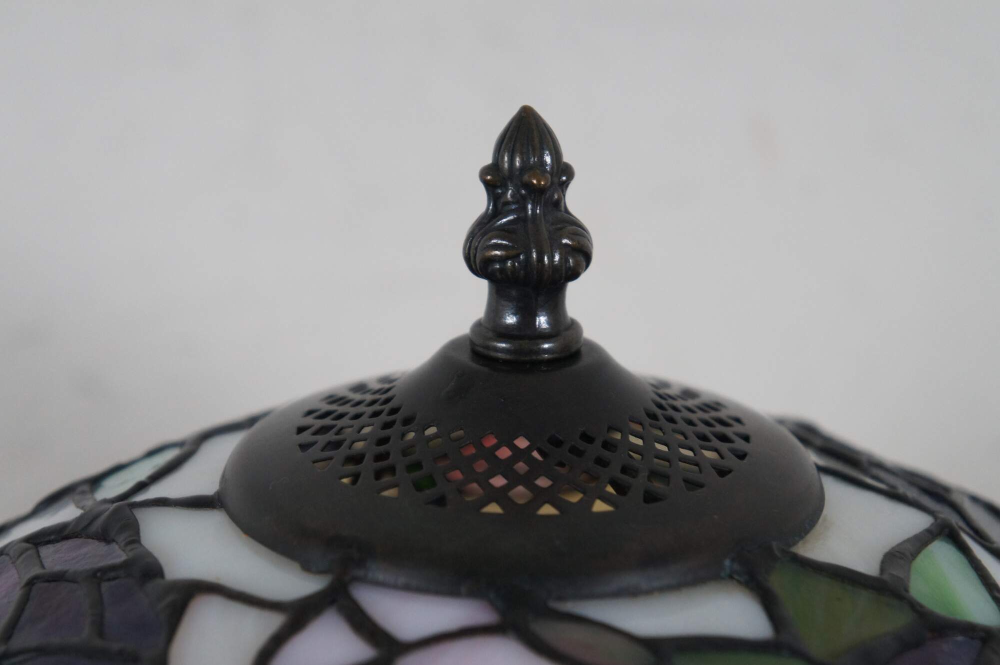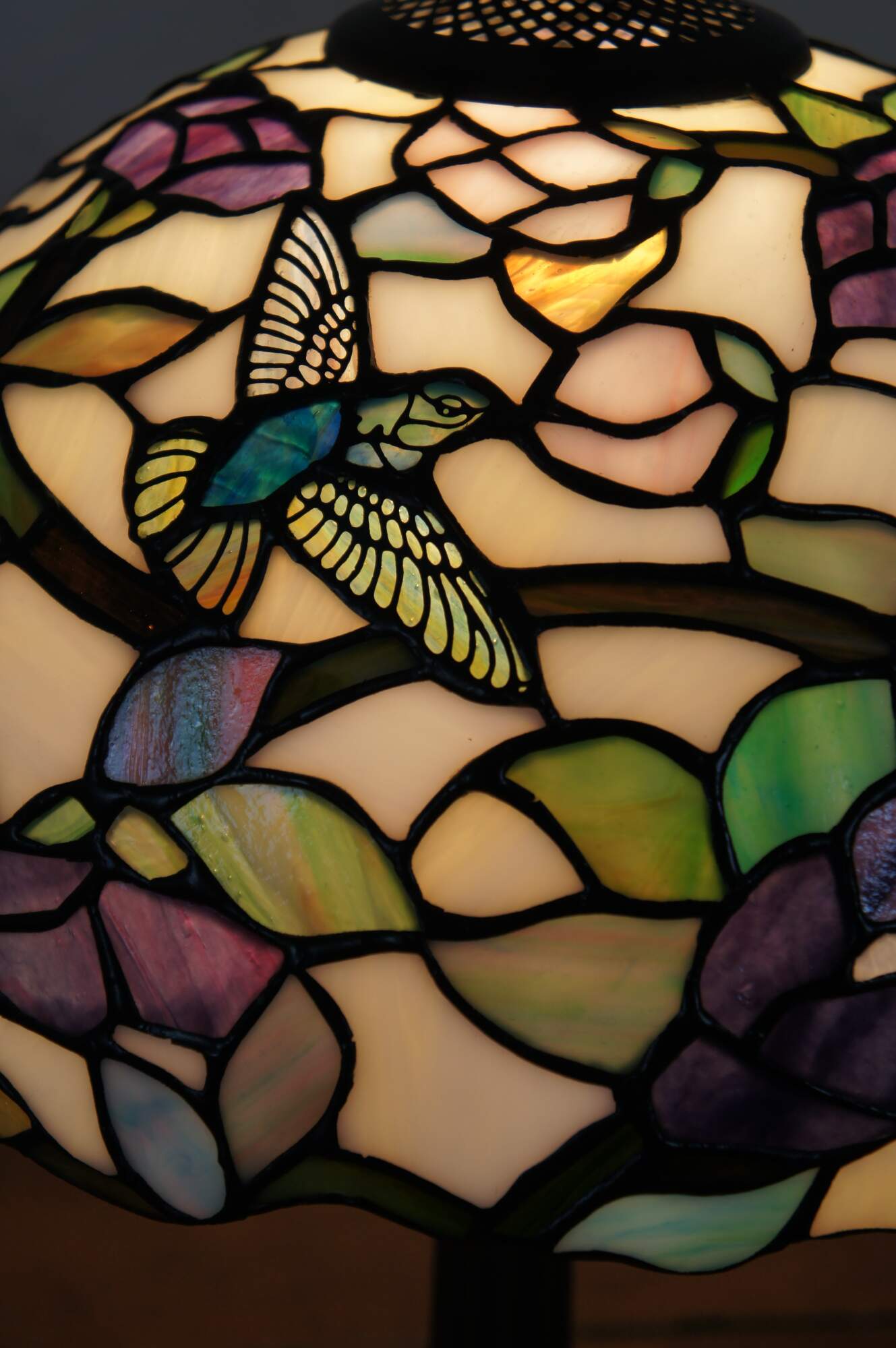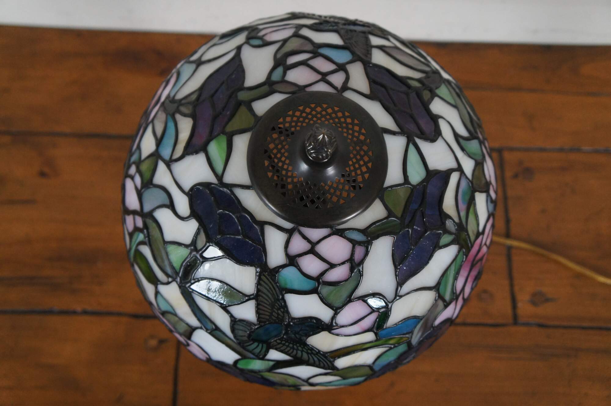 Vintage Tiffany style parlor table lamp. Made of stained glass featuring Art Nouveau styling with a floral / rose and Hummingbird shade and leaf design tapered body.