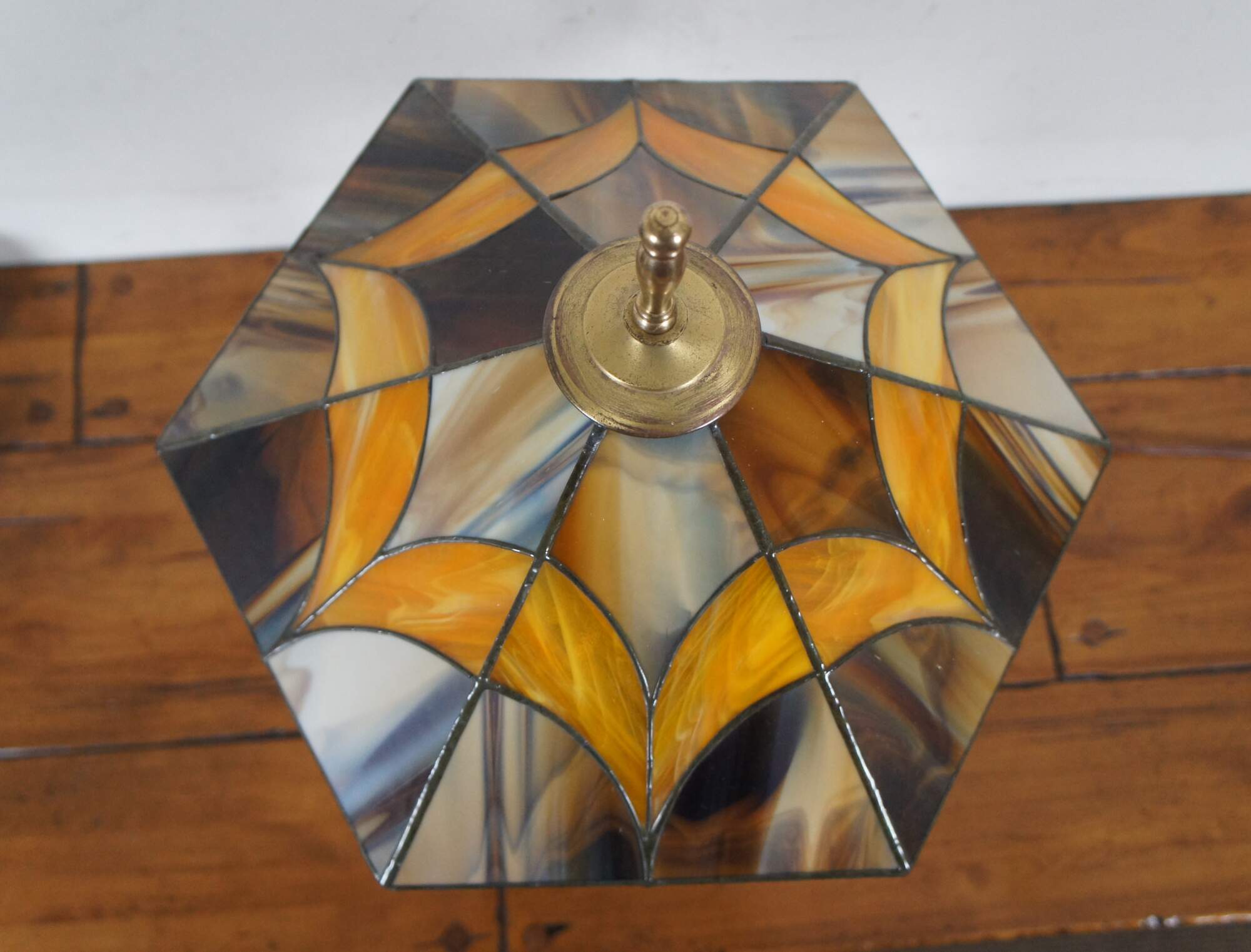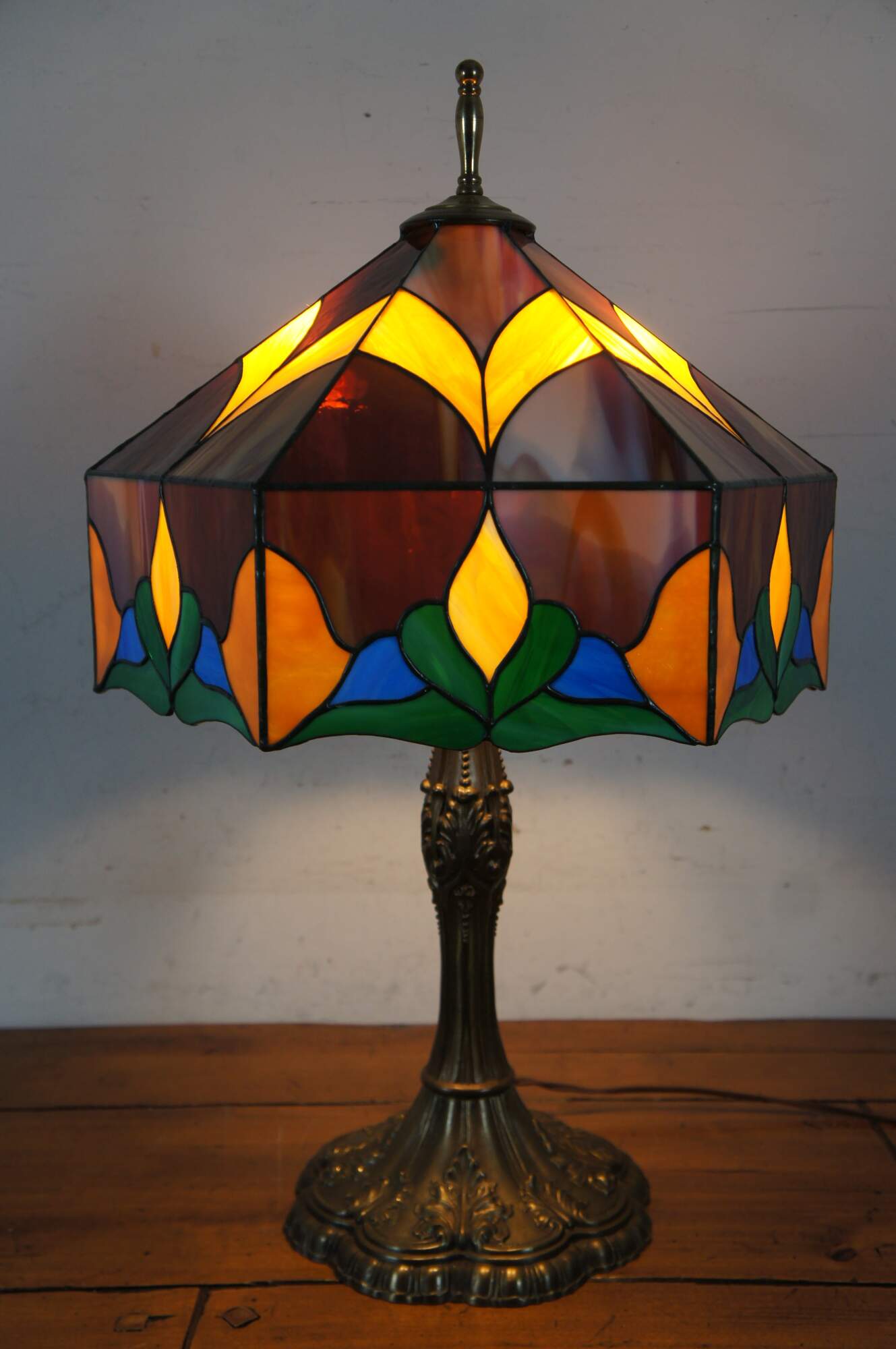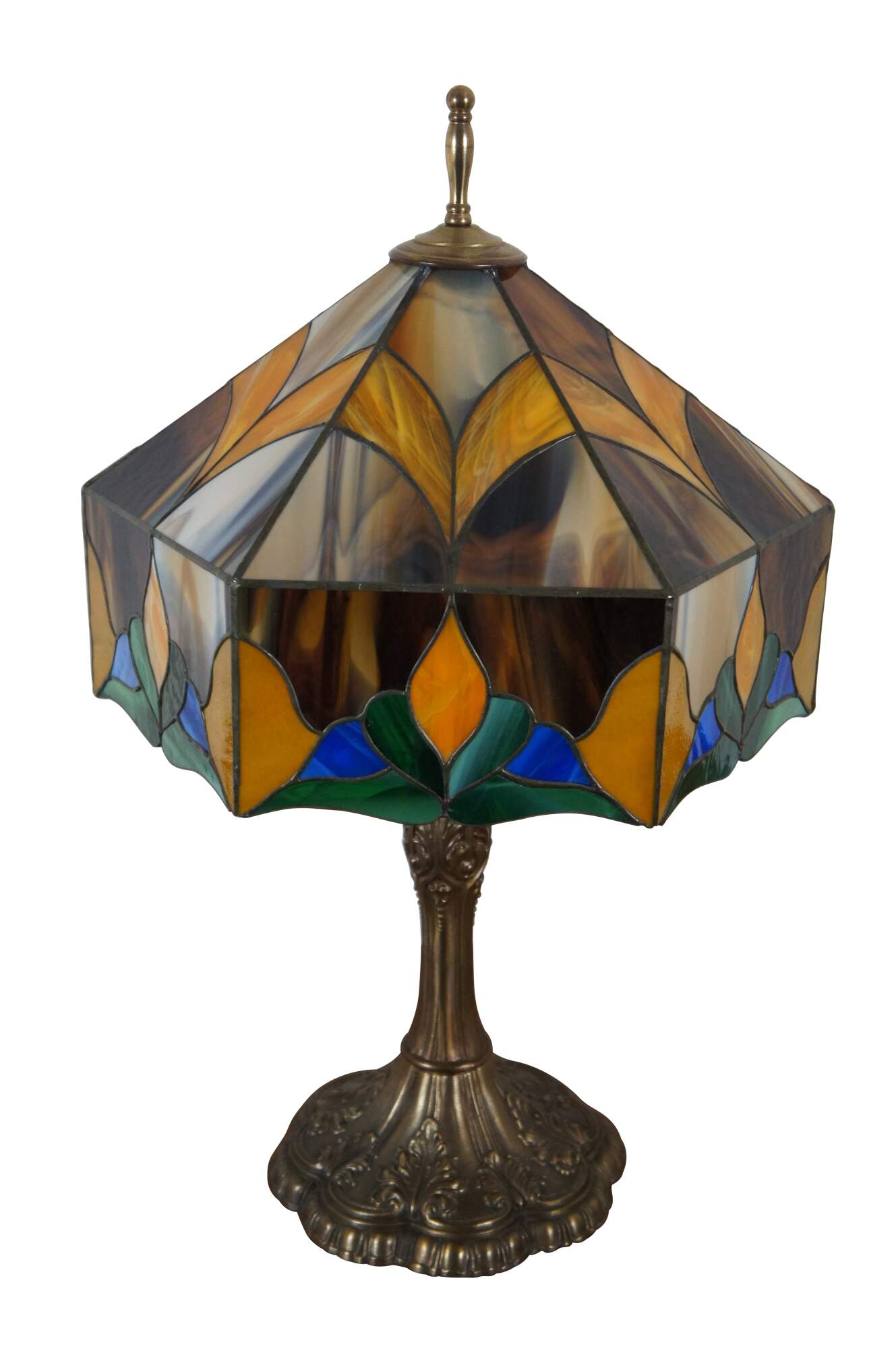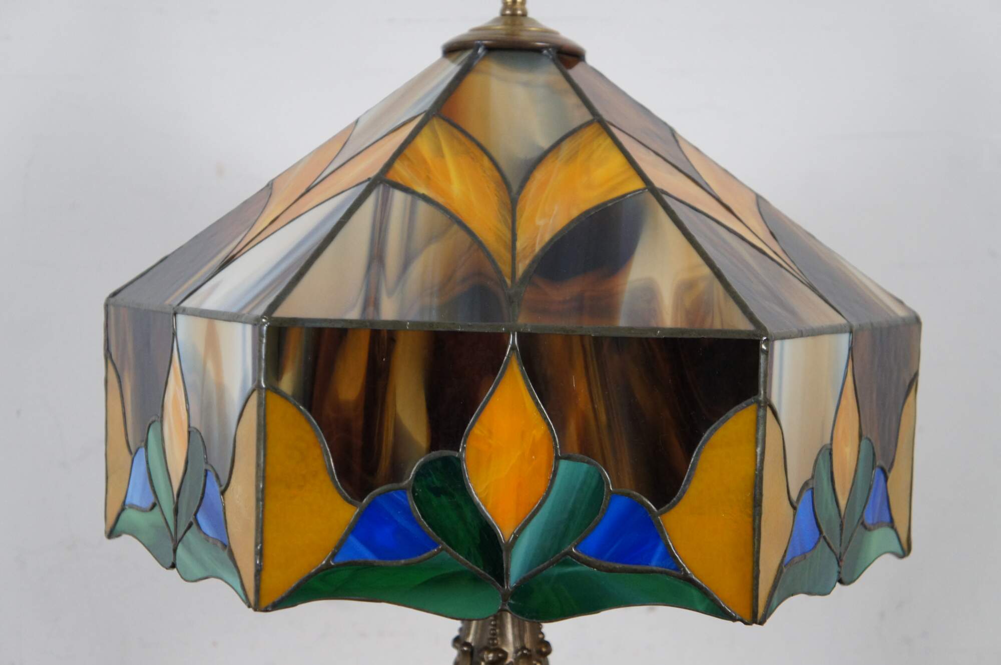 Vintage Tiffany style stained slag glass two light parlor table lamp featuring Art Nouveau styling with beautiful abstract floral design shade of blues, greens, orange and tortoise brown supported by a tapered and scalloped acanthus base.