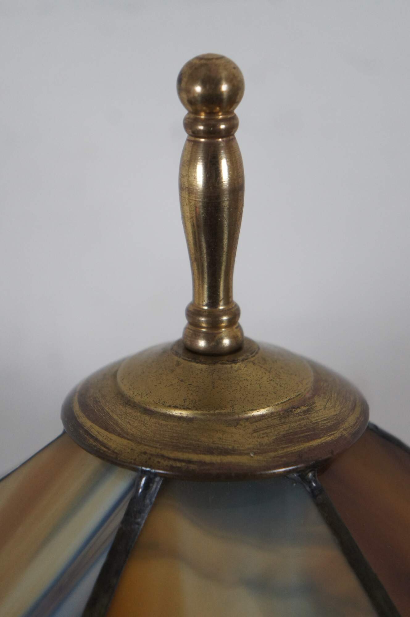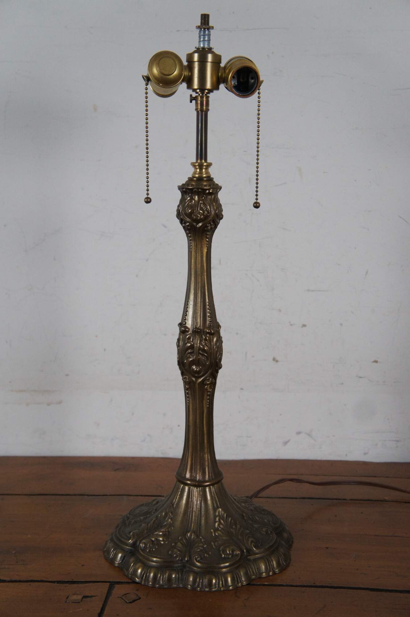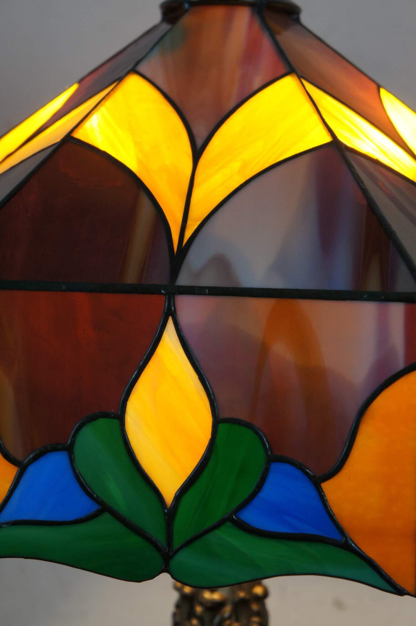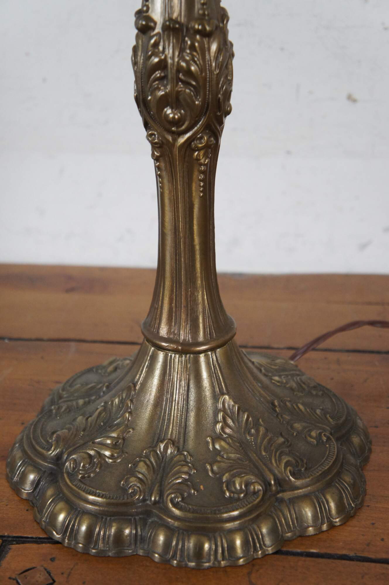 Vintage Tiffany style stained slag glass two light parlor table lamp featuring Art Nouveau styling with beautiful abstract floral design shade of blues, greens, orange and tortoise brown supported by a tapered and scalloped acanthus base.