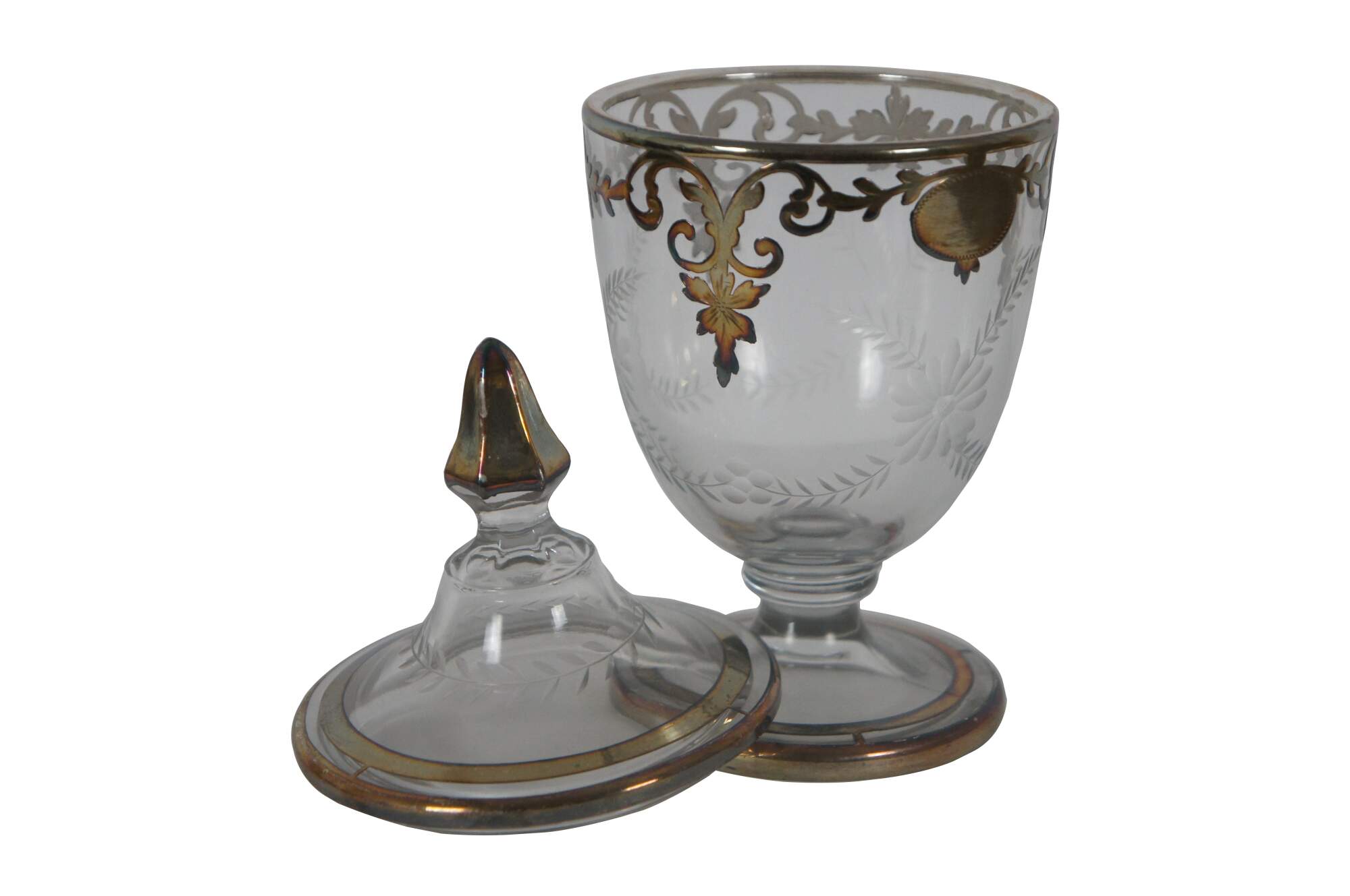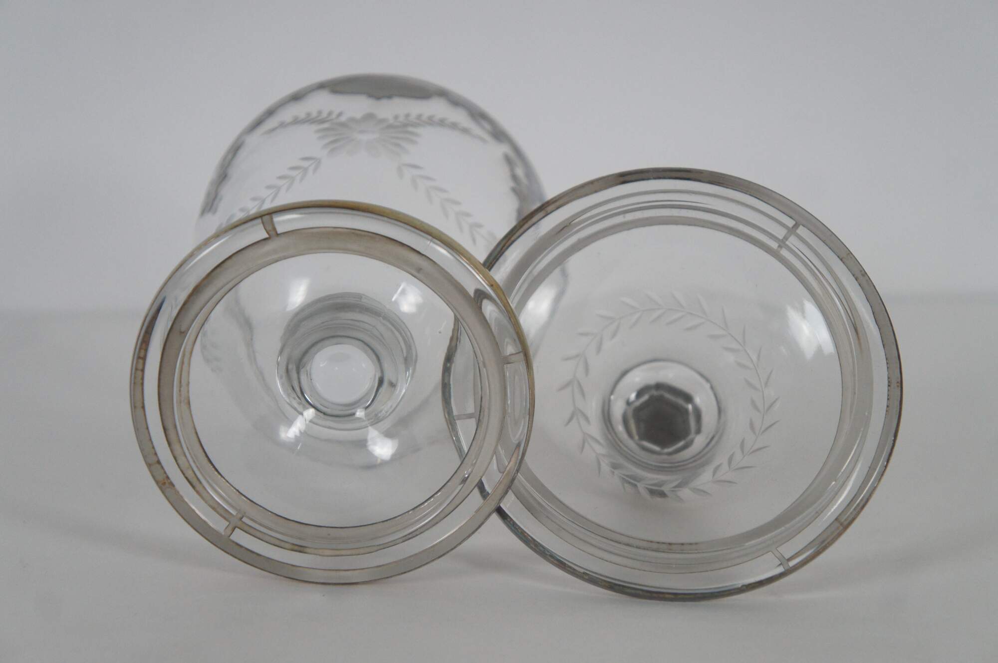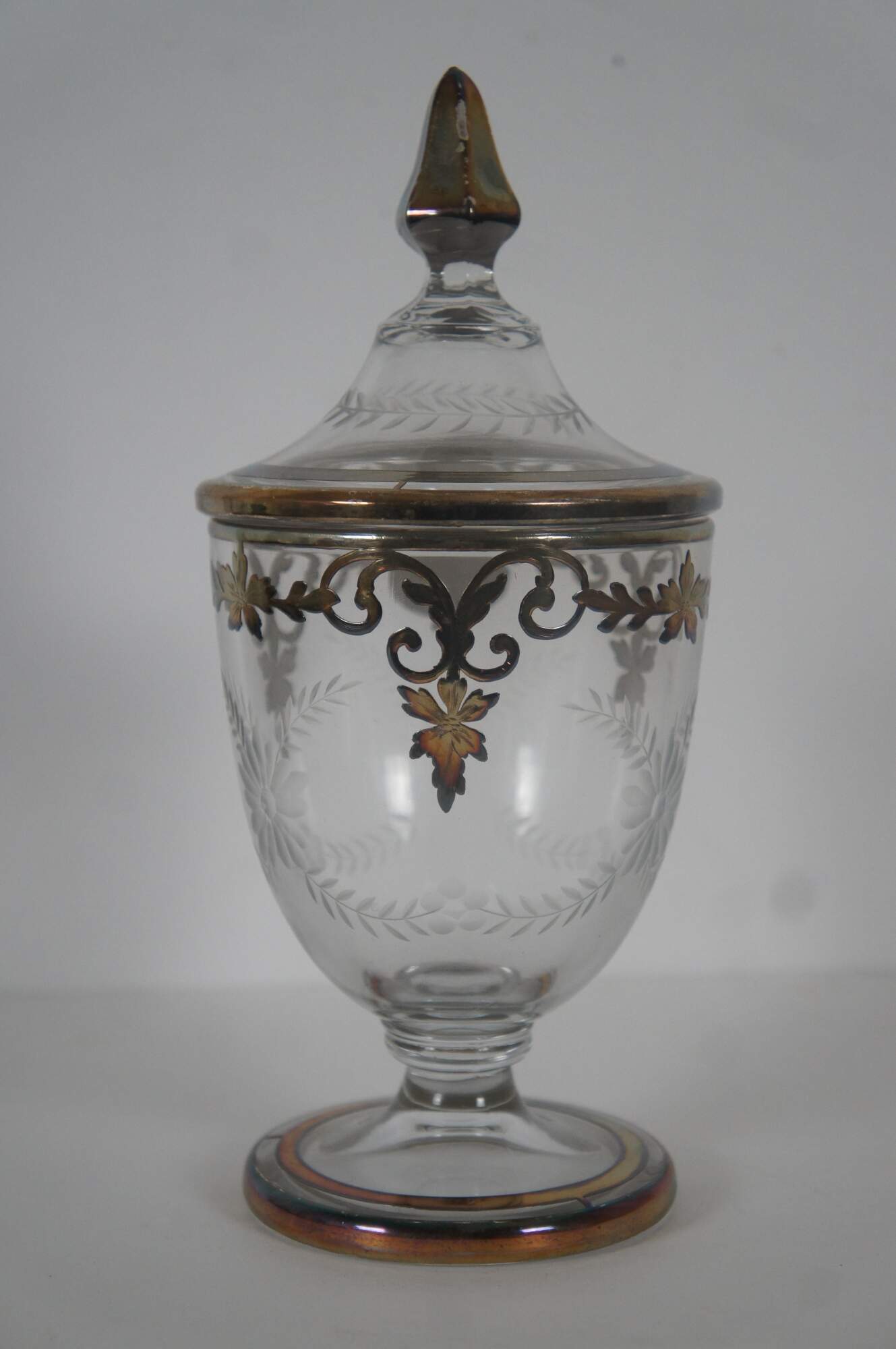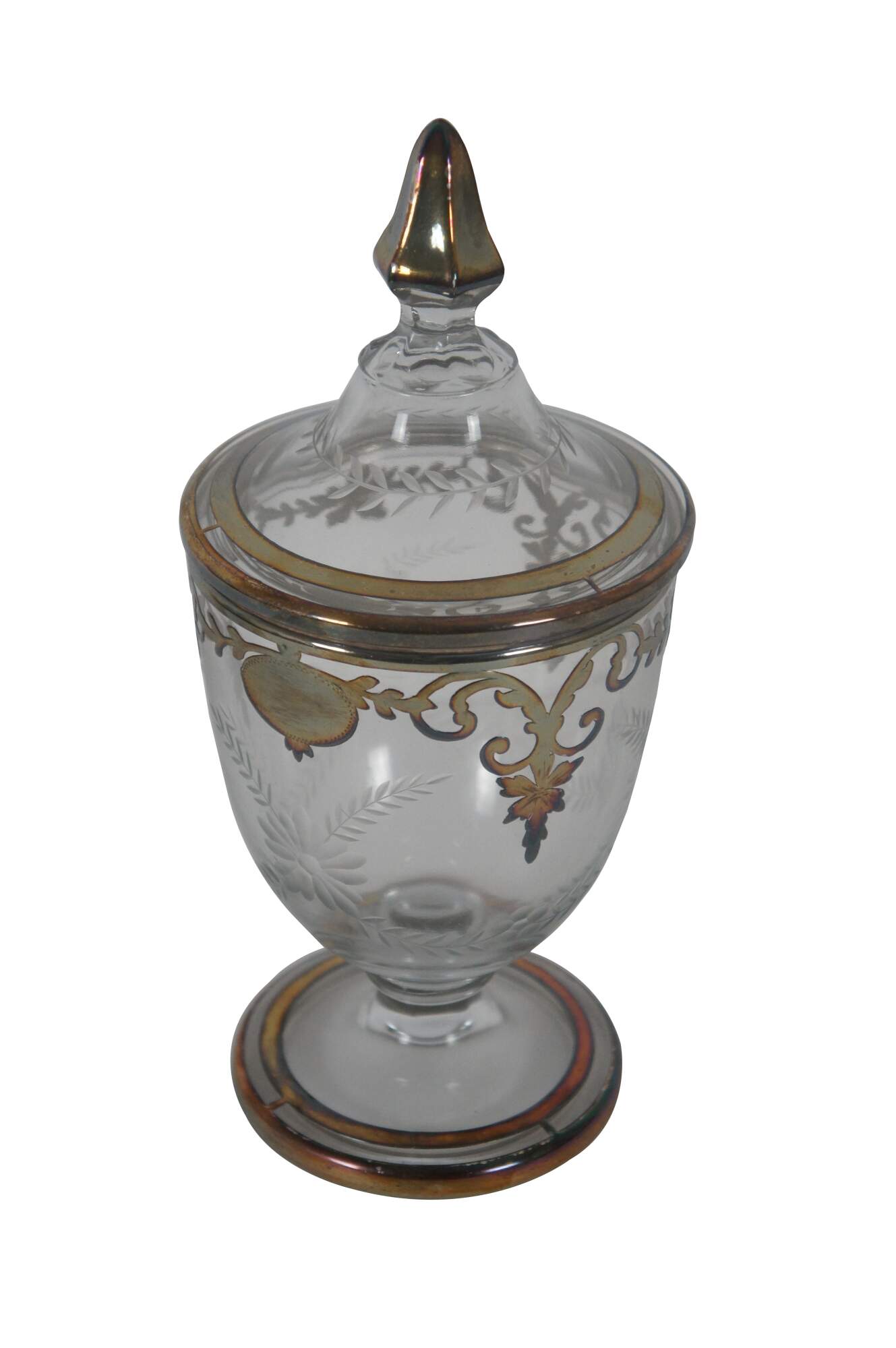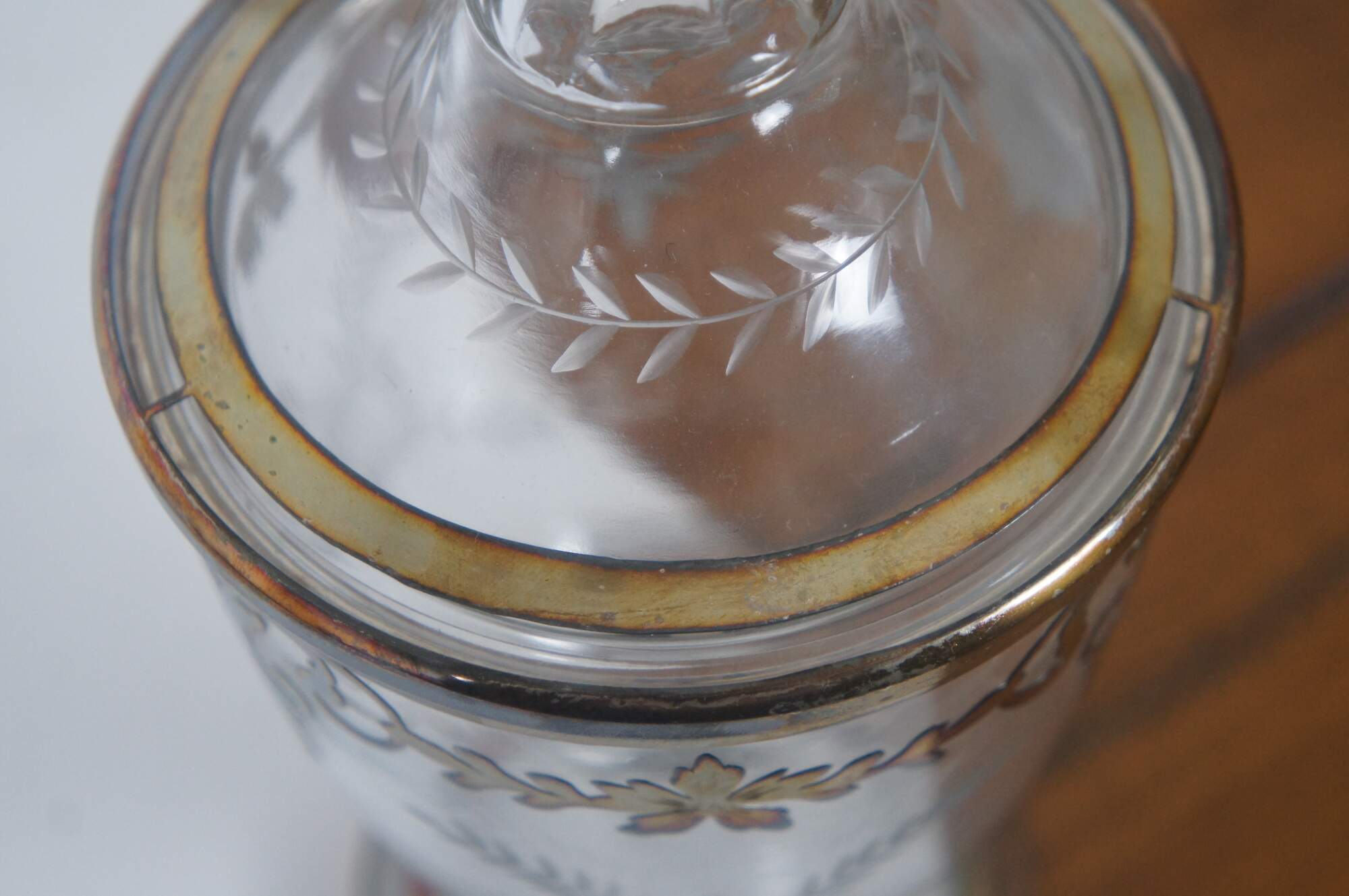 Antique Heisey pressed and etched glass candy jar / compote featuring trophy urn form with footed pedestal base, baroque sterling silver overlay and lidded top with finial.