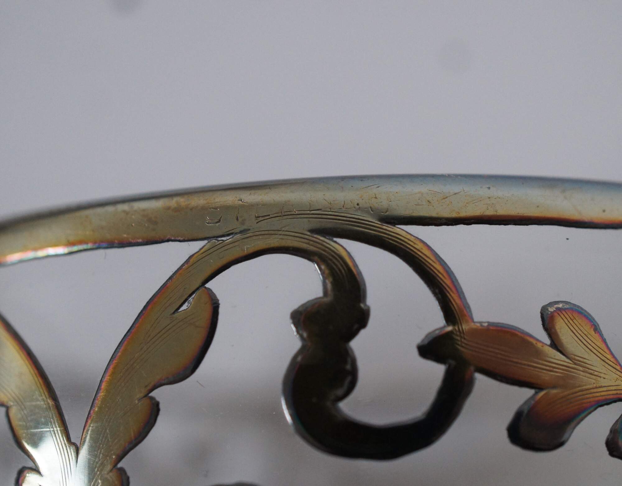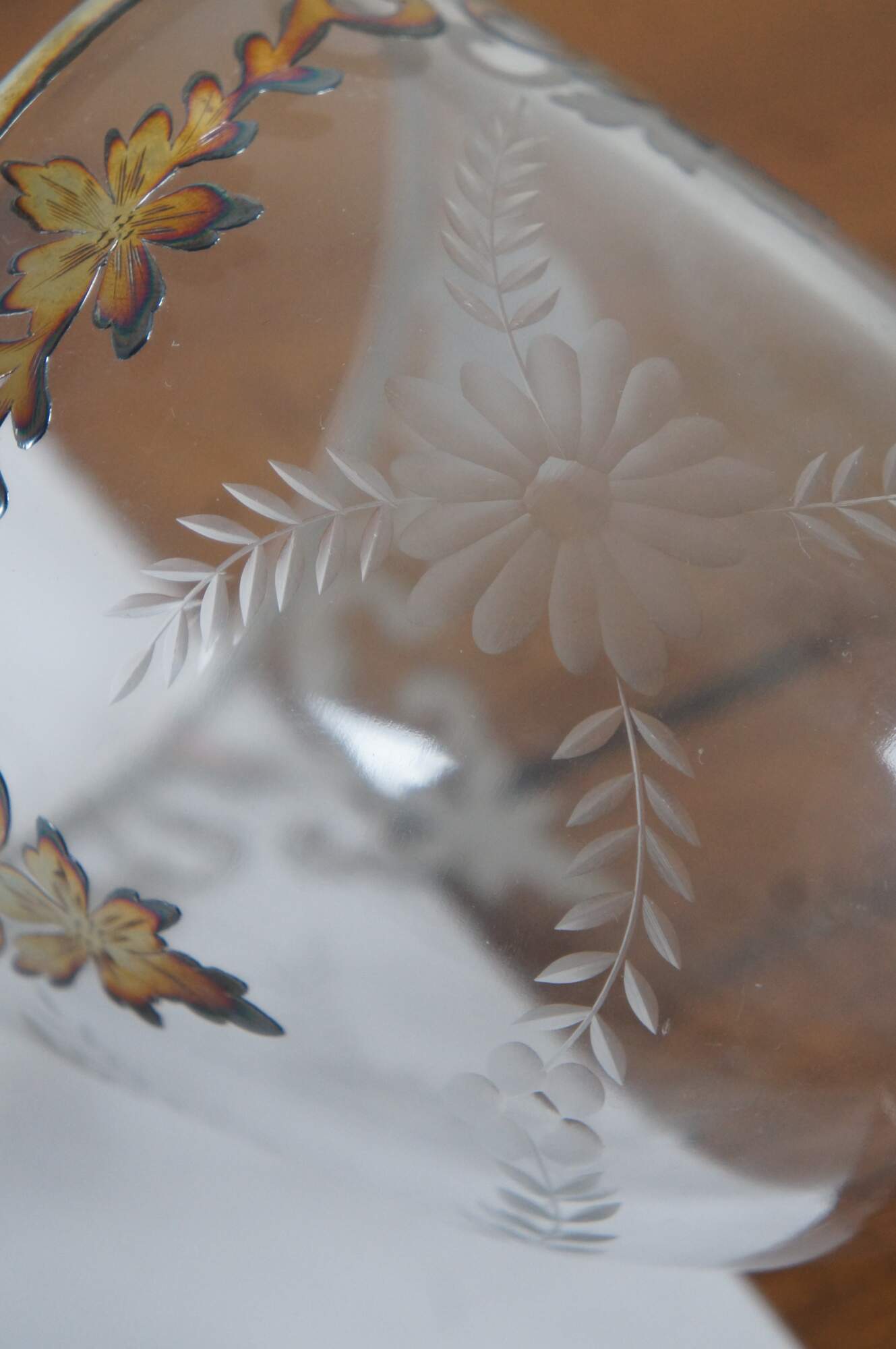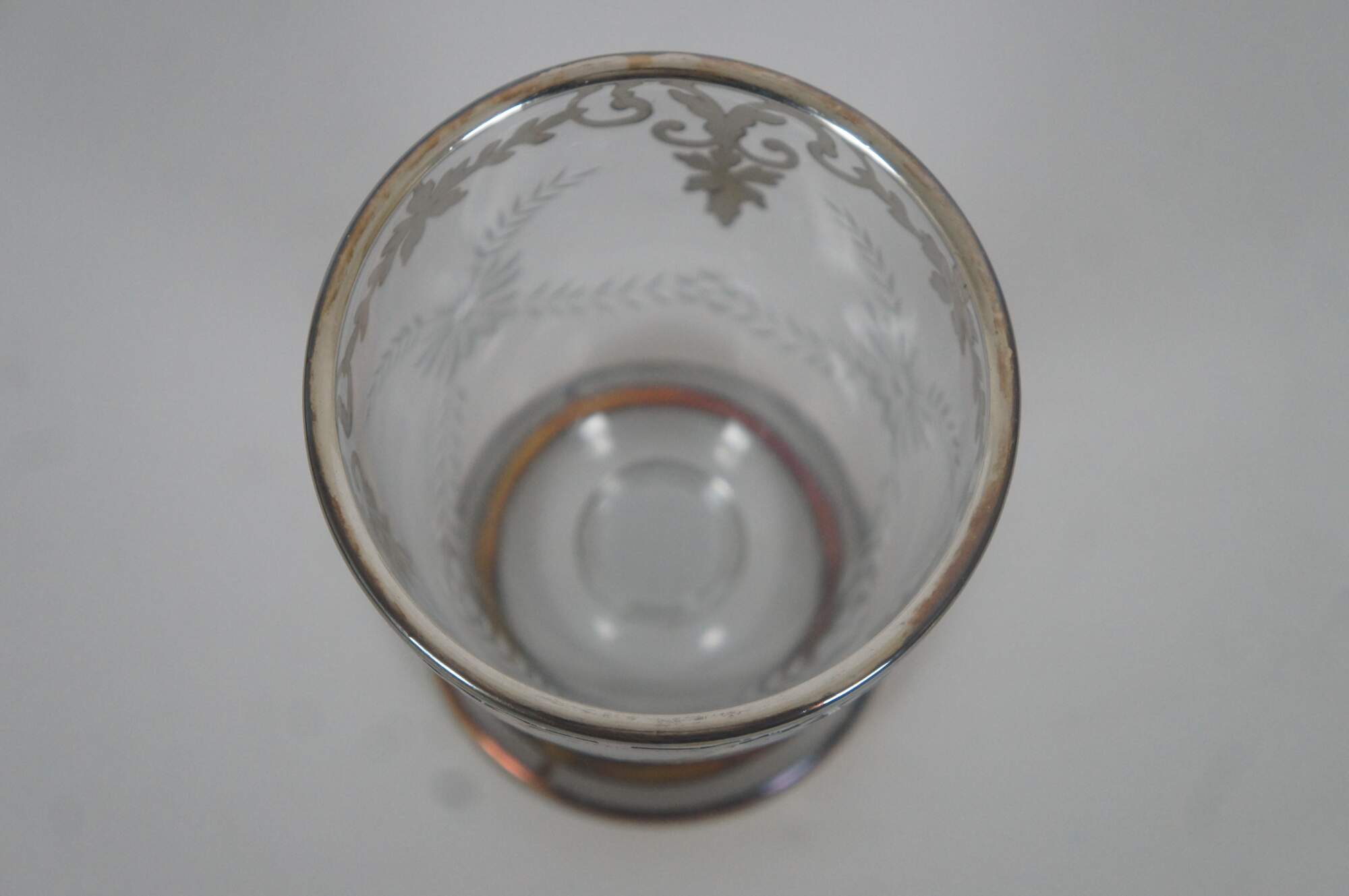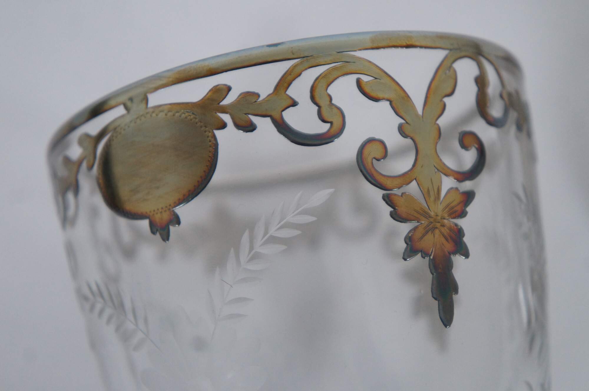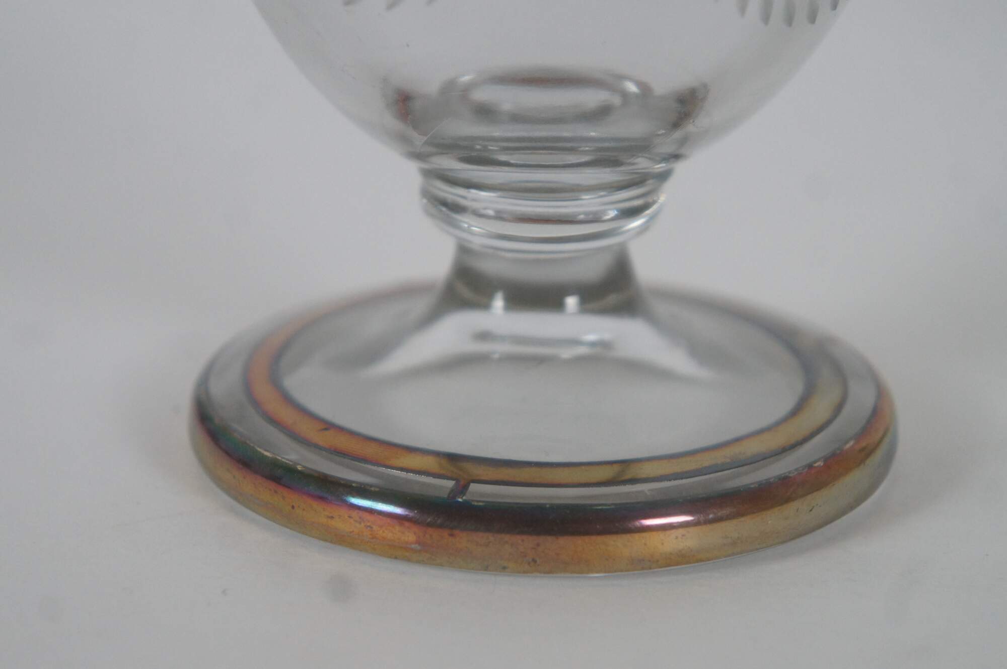 Antique Heisey pressed and etched glass candy jar / compote featuring trophy urn form with footed pedestal base, baroque sterling silver overlay and lidded top with finial.
