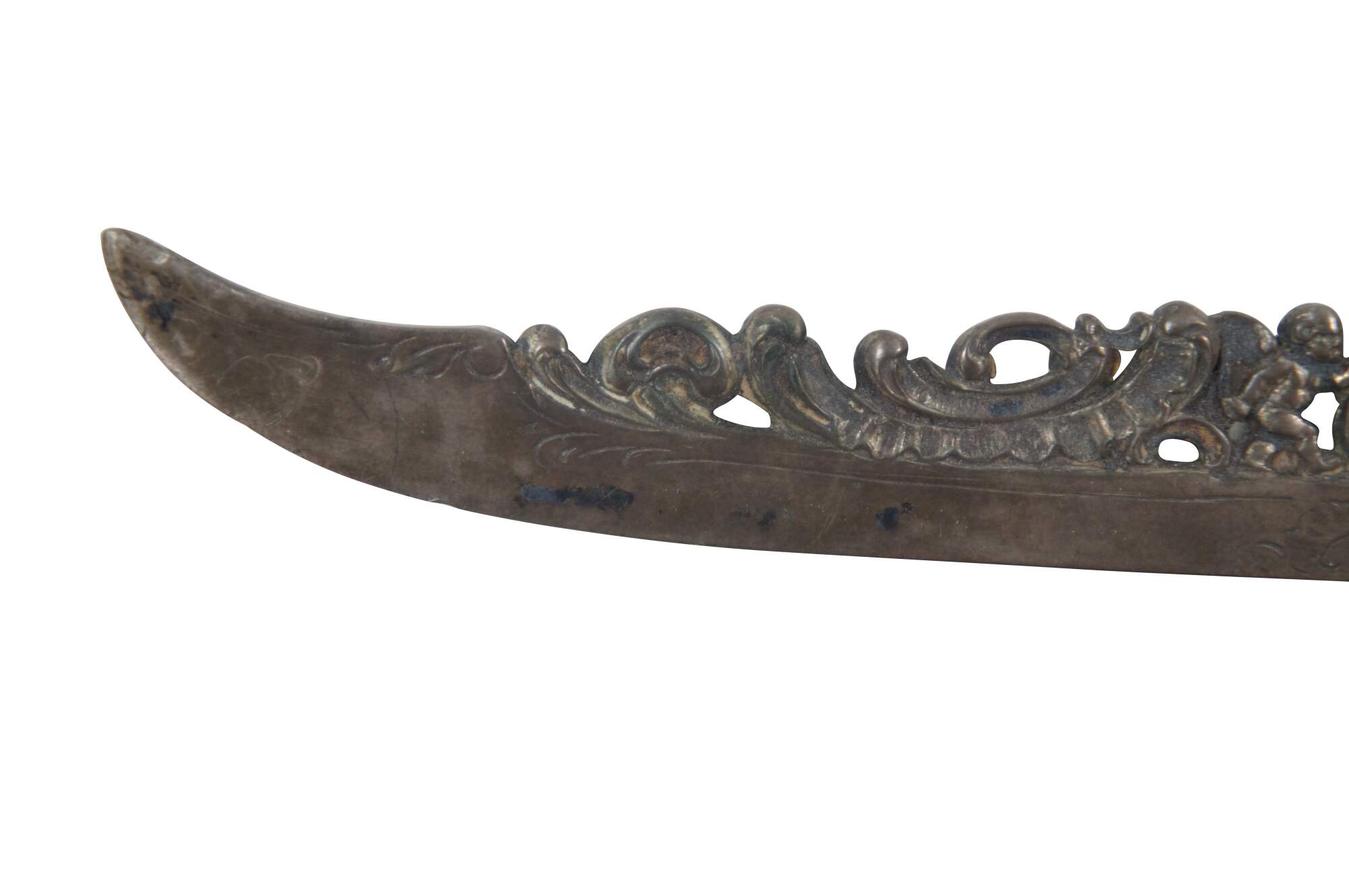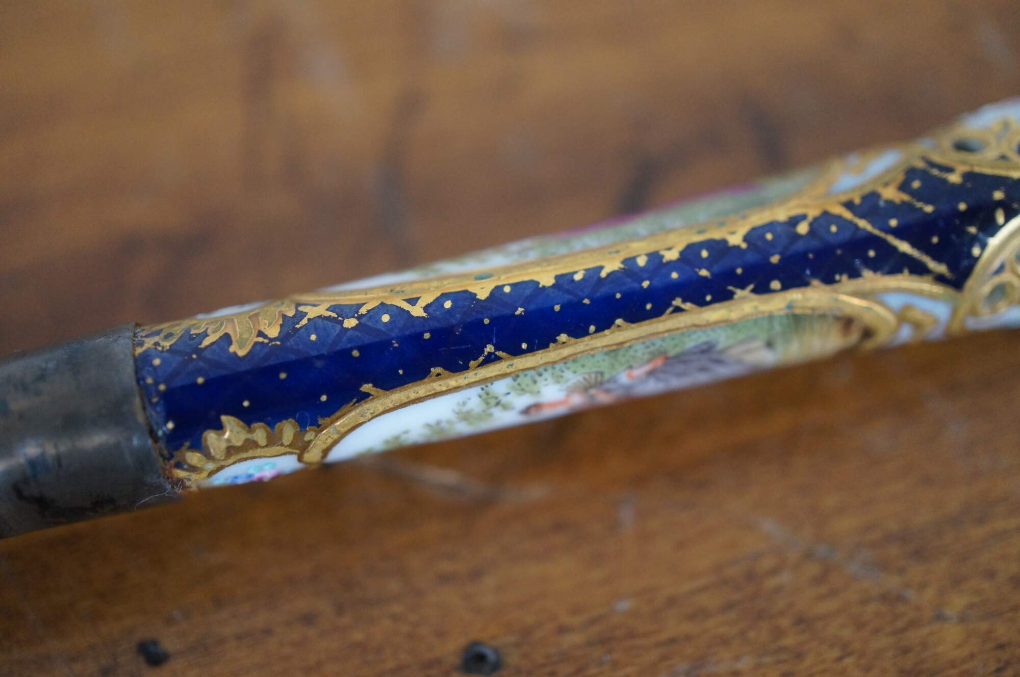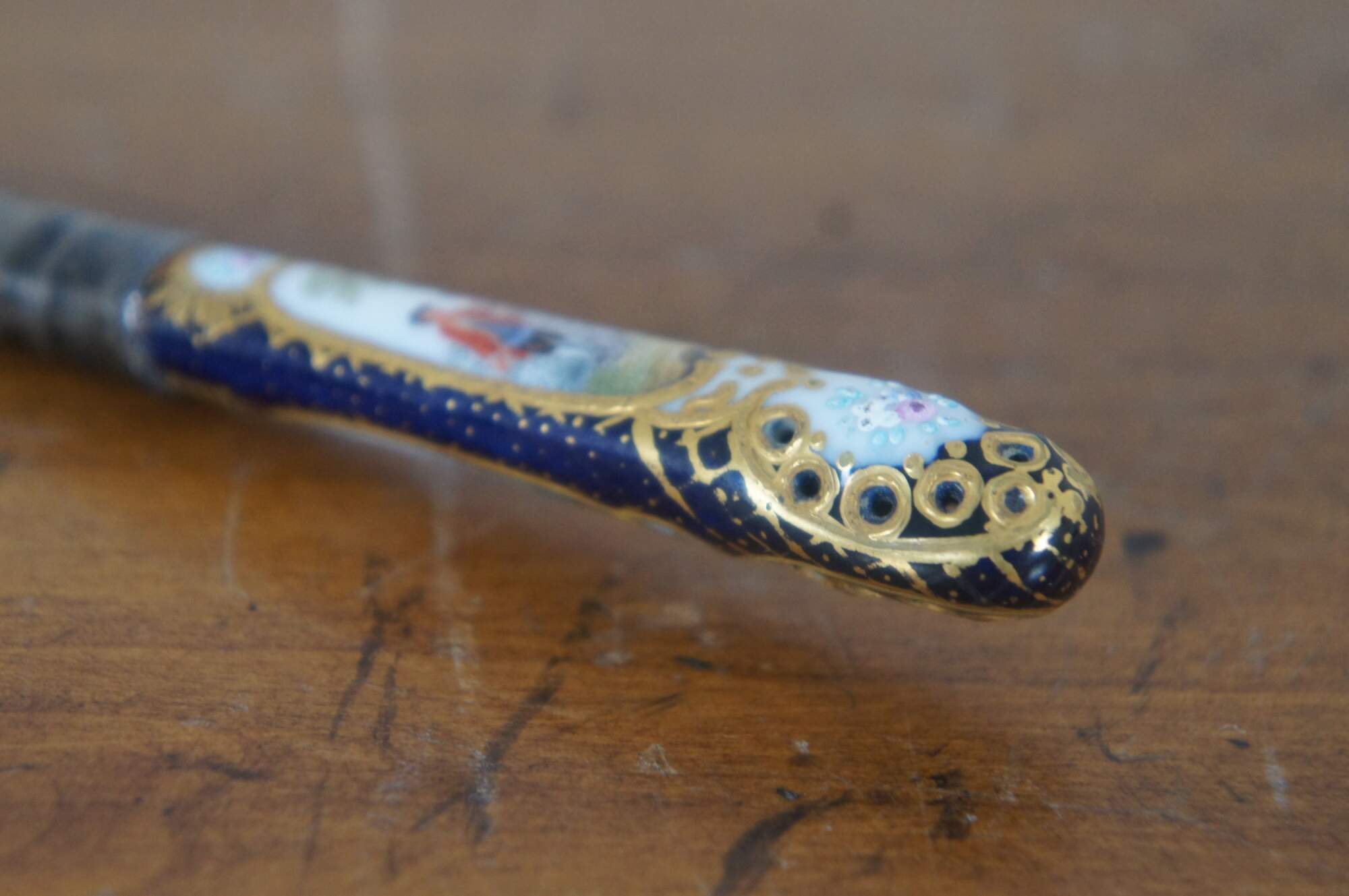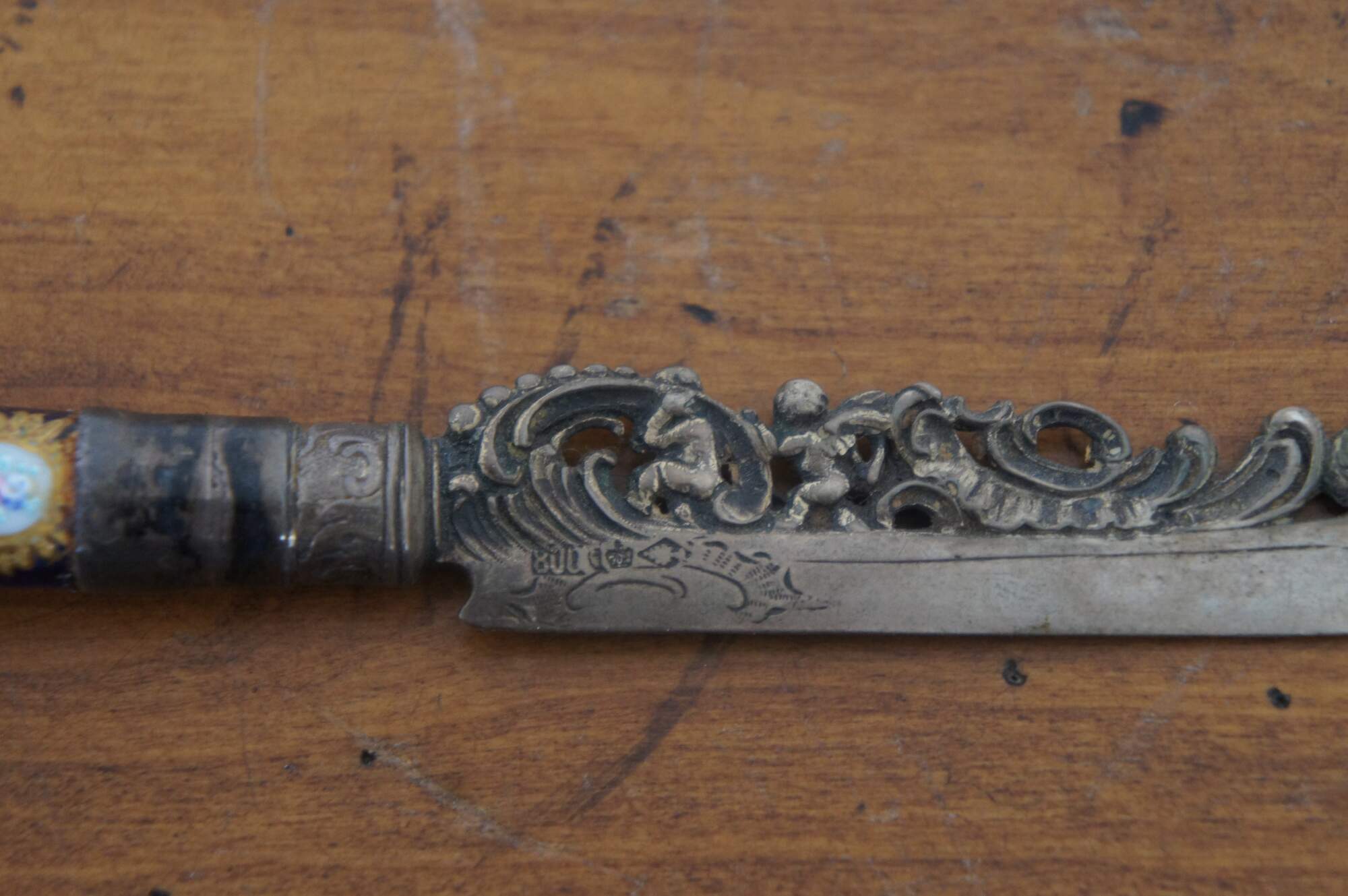 Antique 800 silver porcelain serving knife by Richard Garten, featuring a reticulated baroque blade with figural cherubs and a hand painted cobalt blue and gold accent handle with two colonial couples.