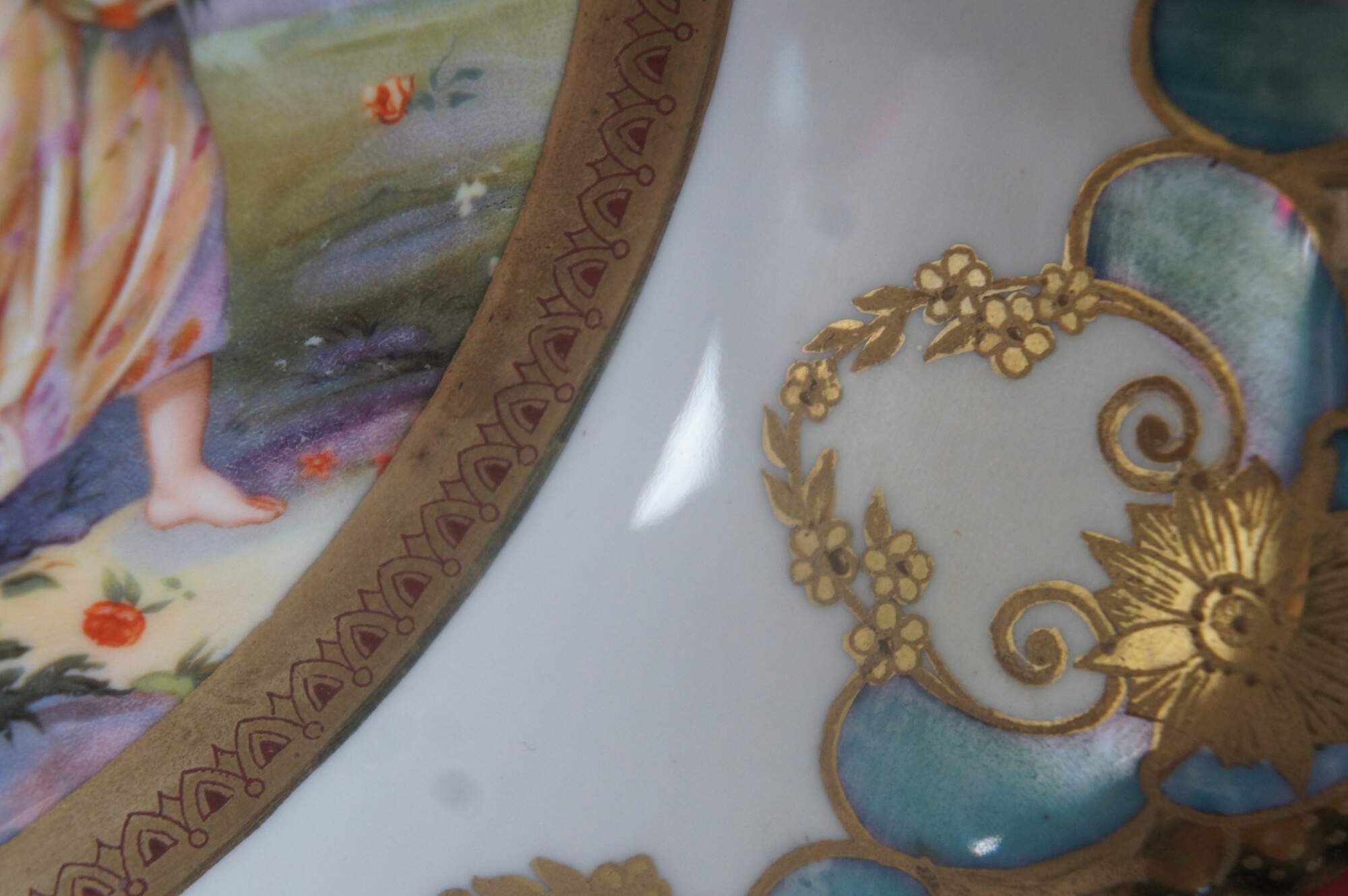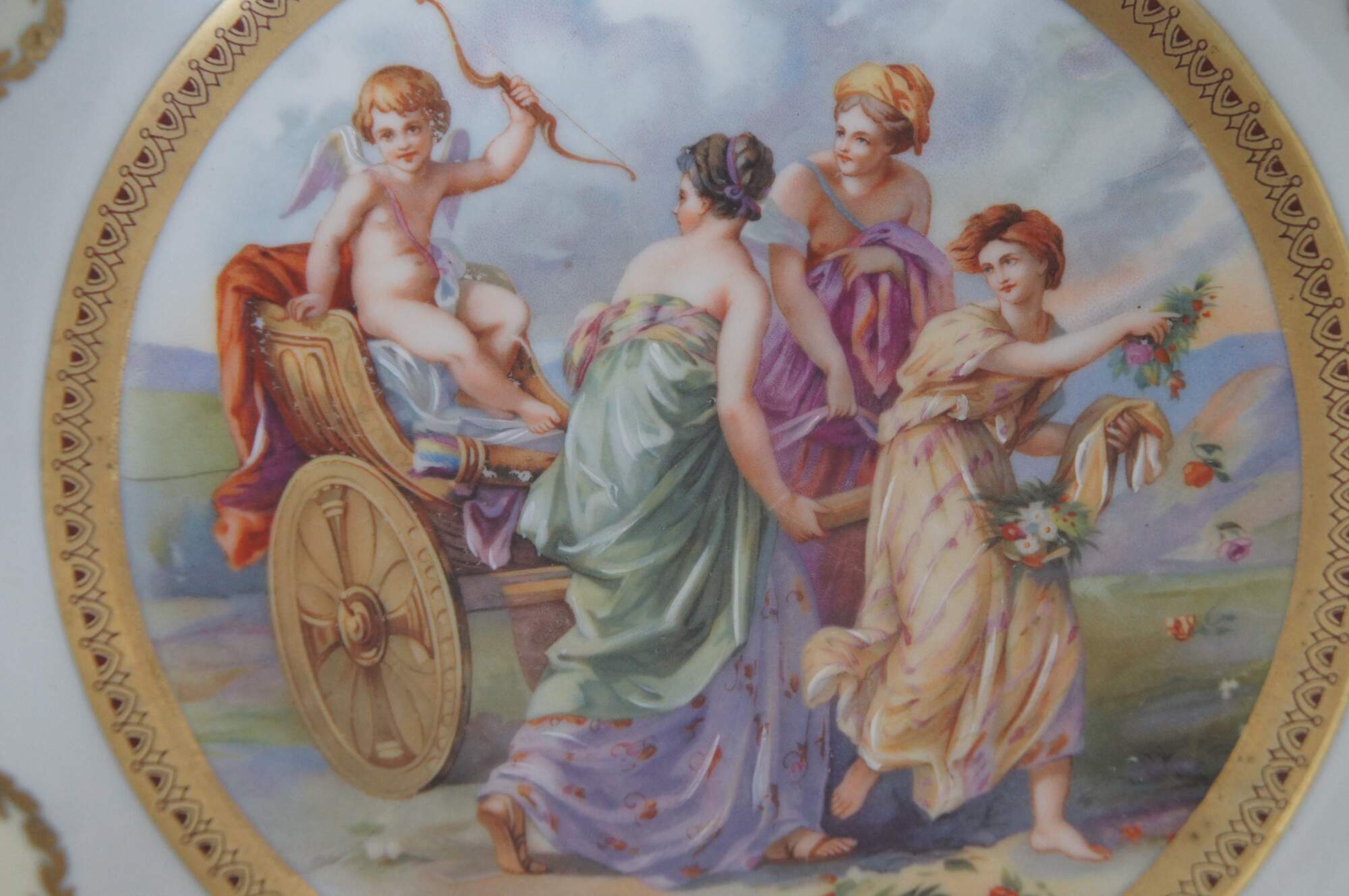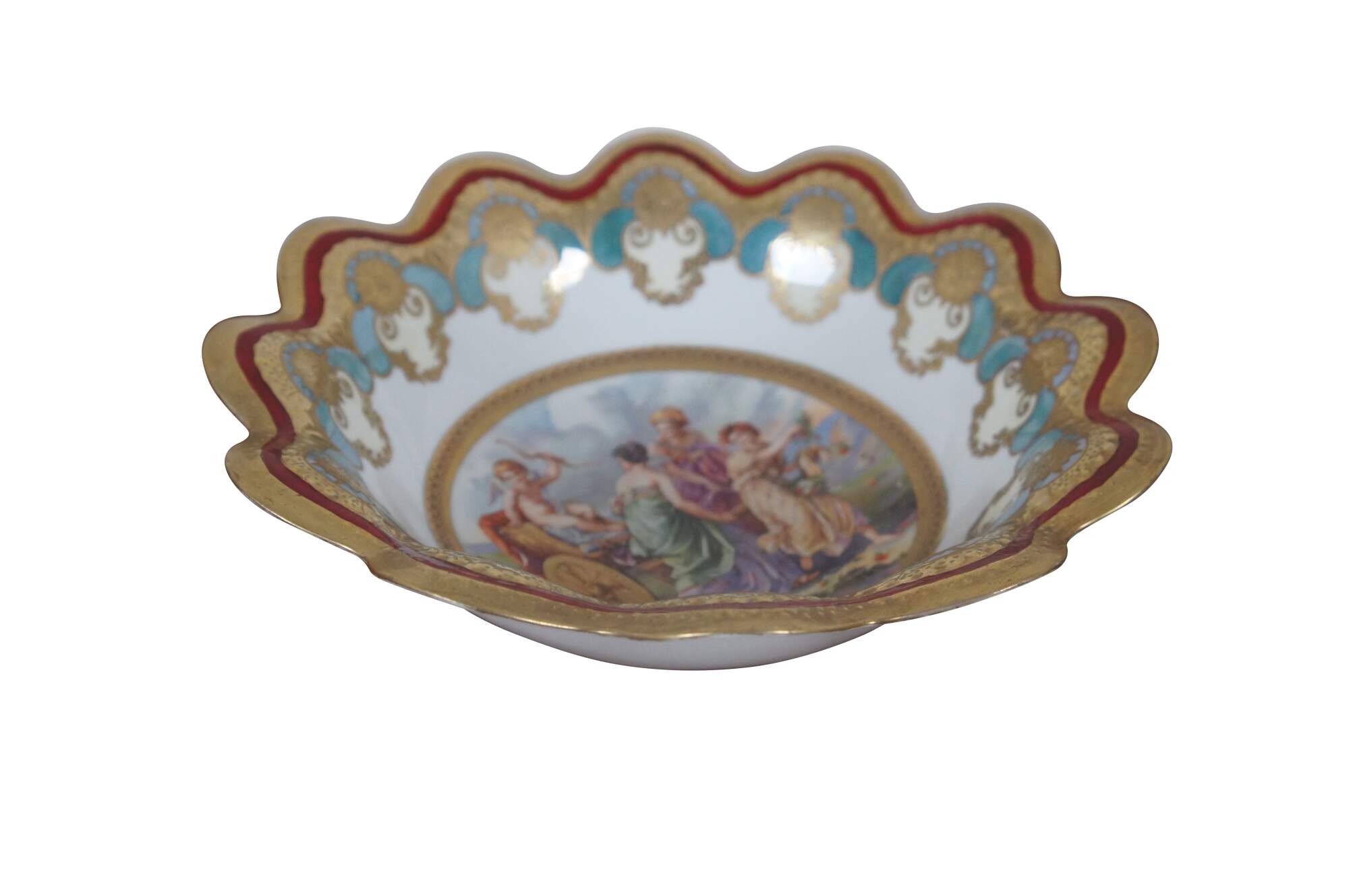 Antique Austrian scalloped porcelain bowl featuring a gold, turquoise and red Neoclassical theme with a Cherub riding in chariot led by three flower girls.