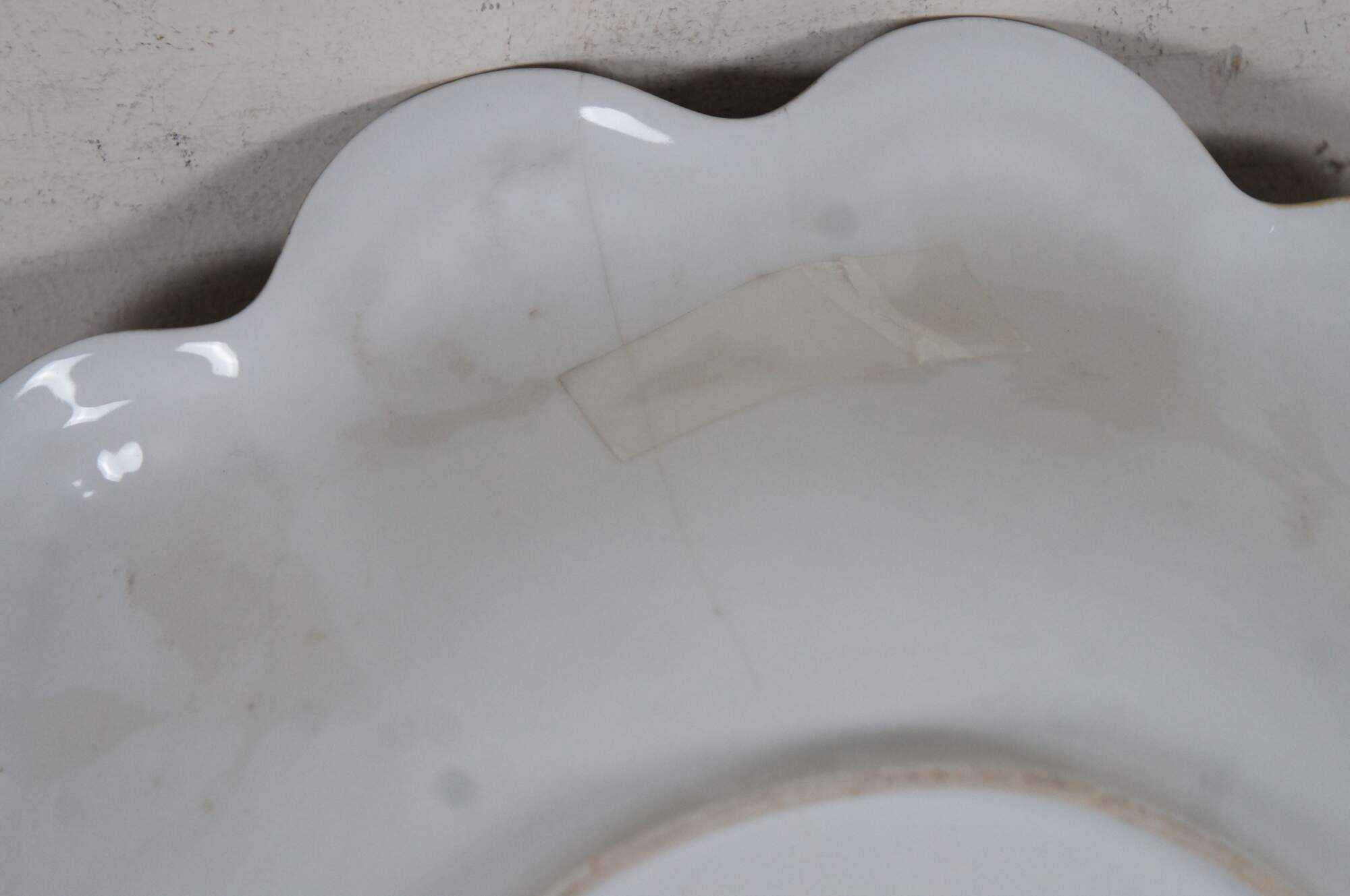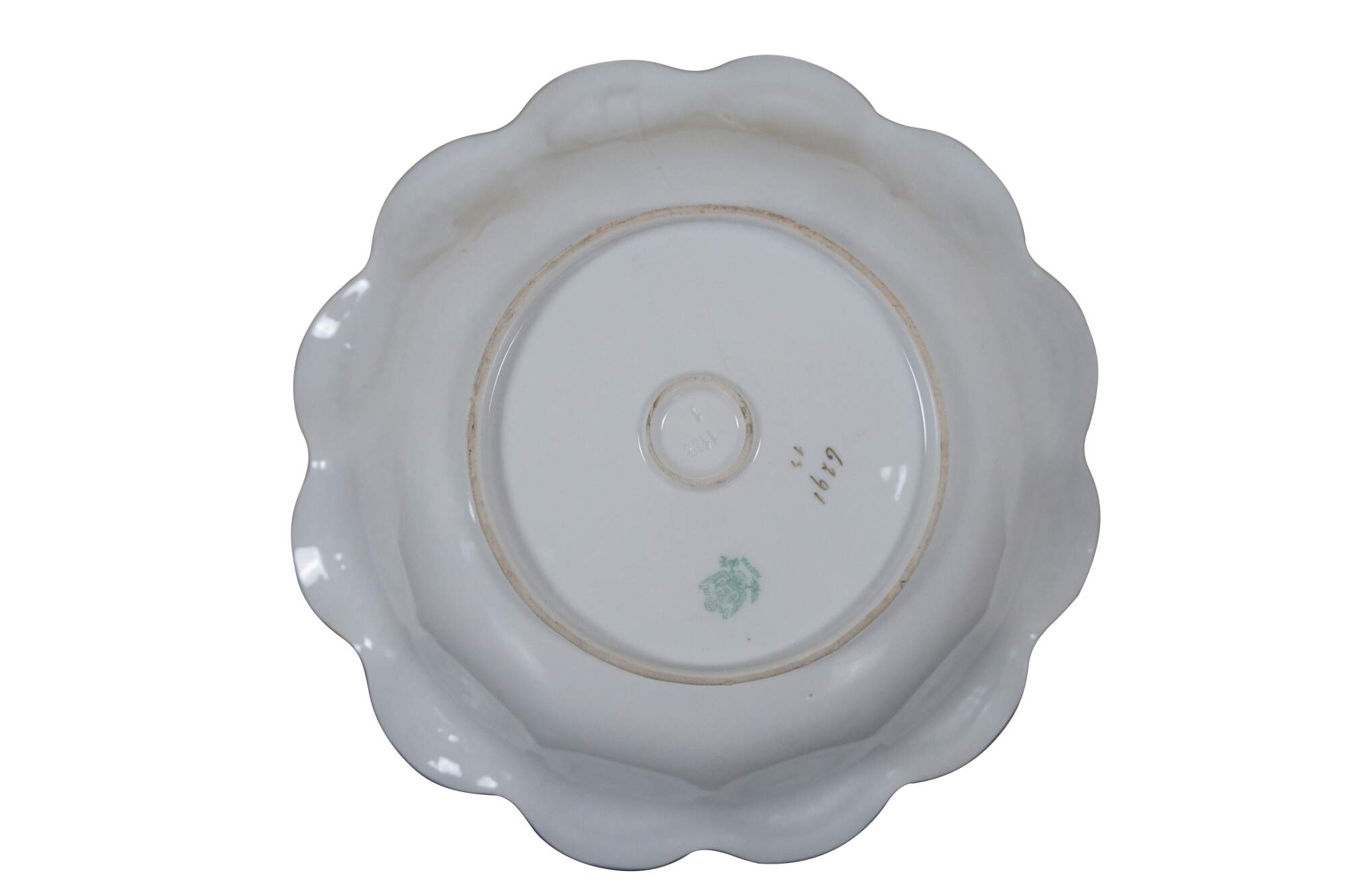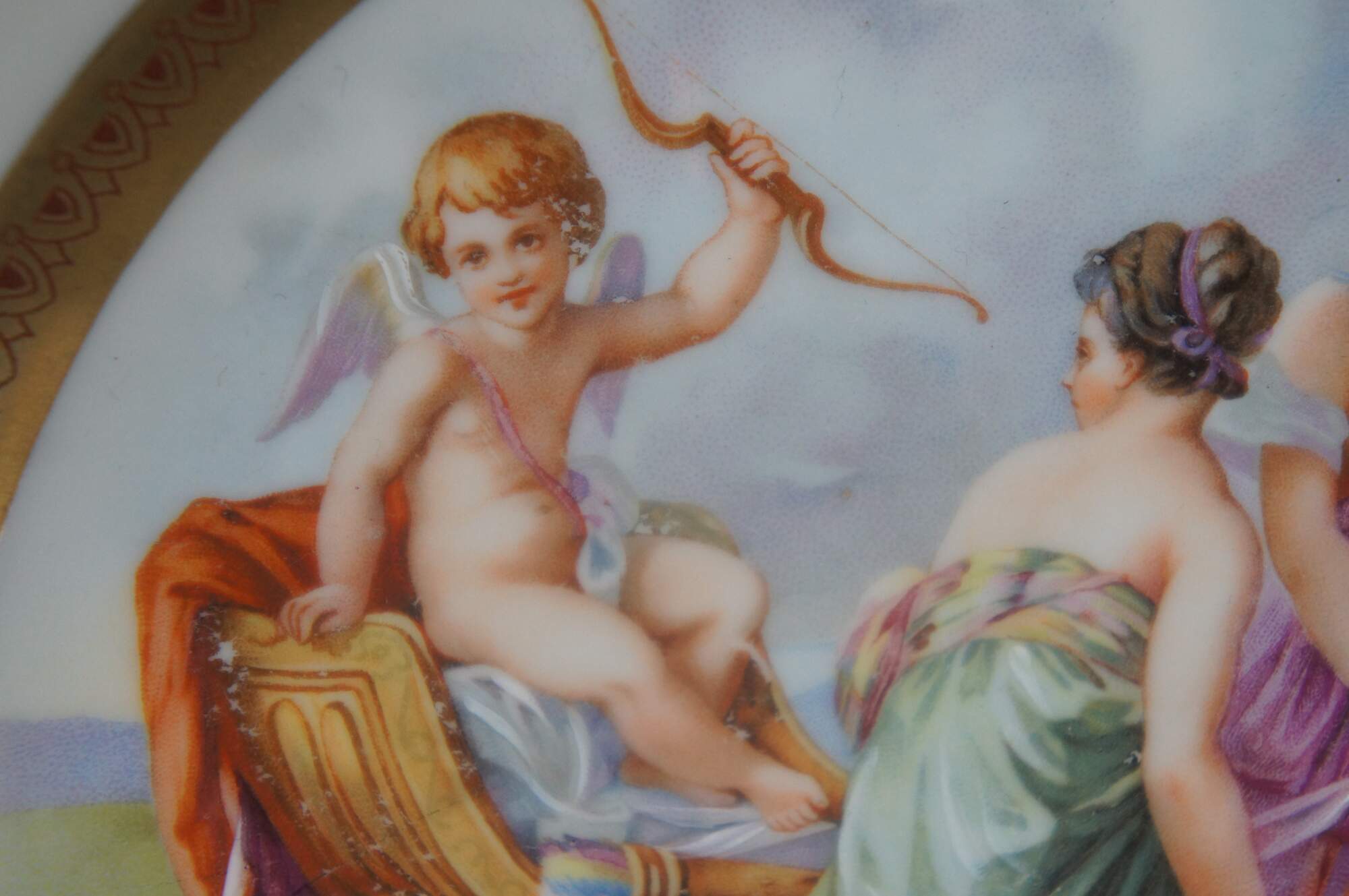 Antique Austrian scalloped porcelain bowl featuring a gold, turquoise and red Neoclassical theme with a Cherub riding in chariot led by three flower girls.