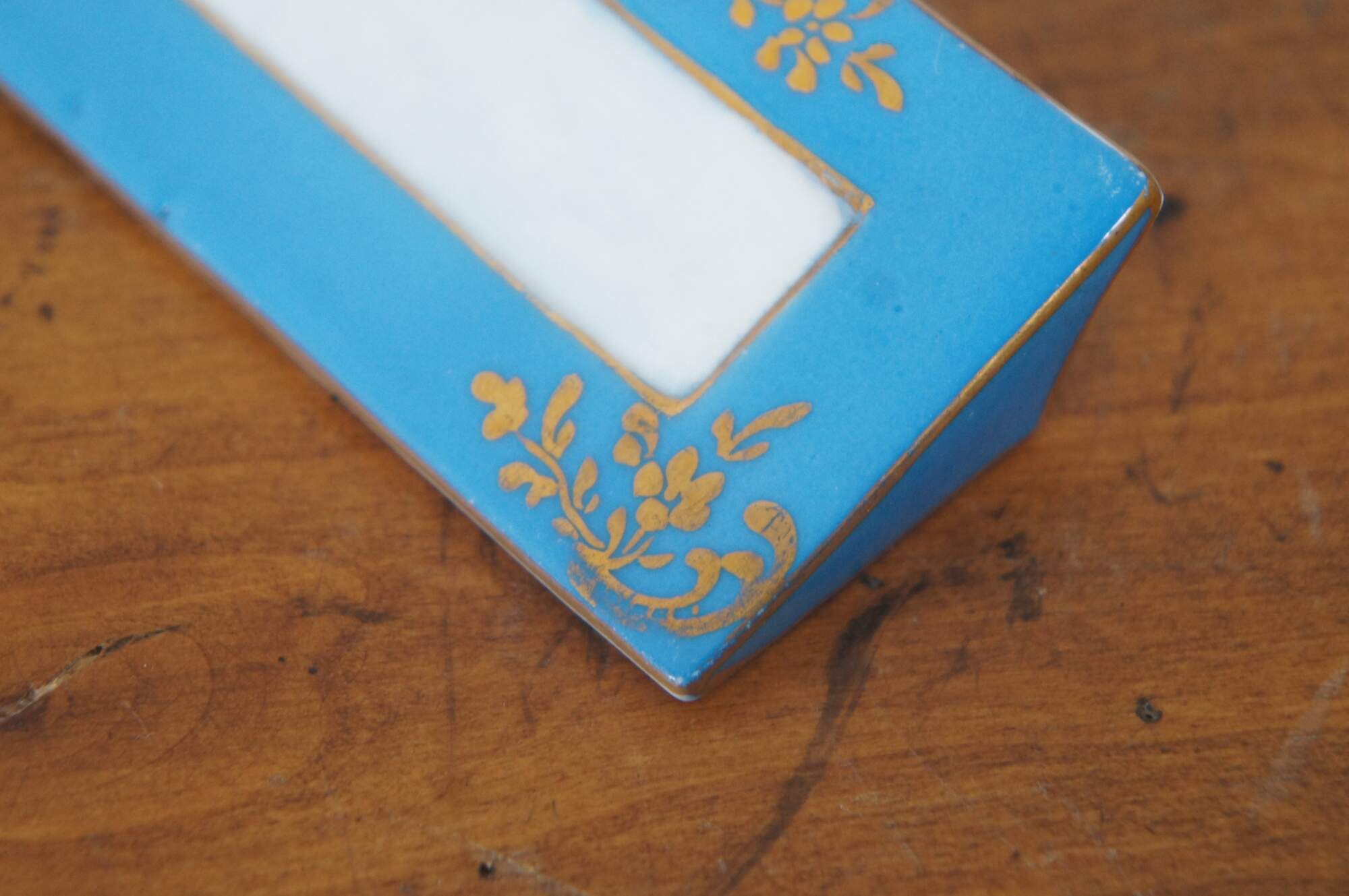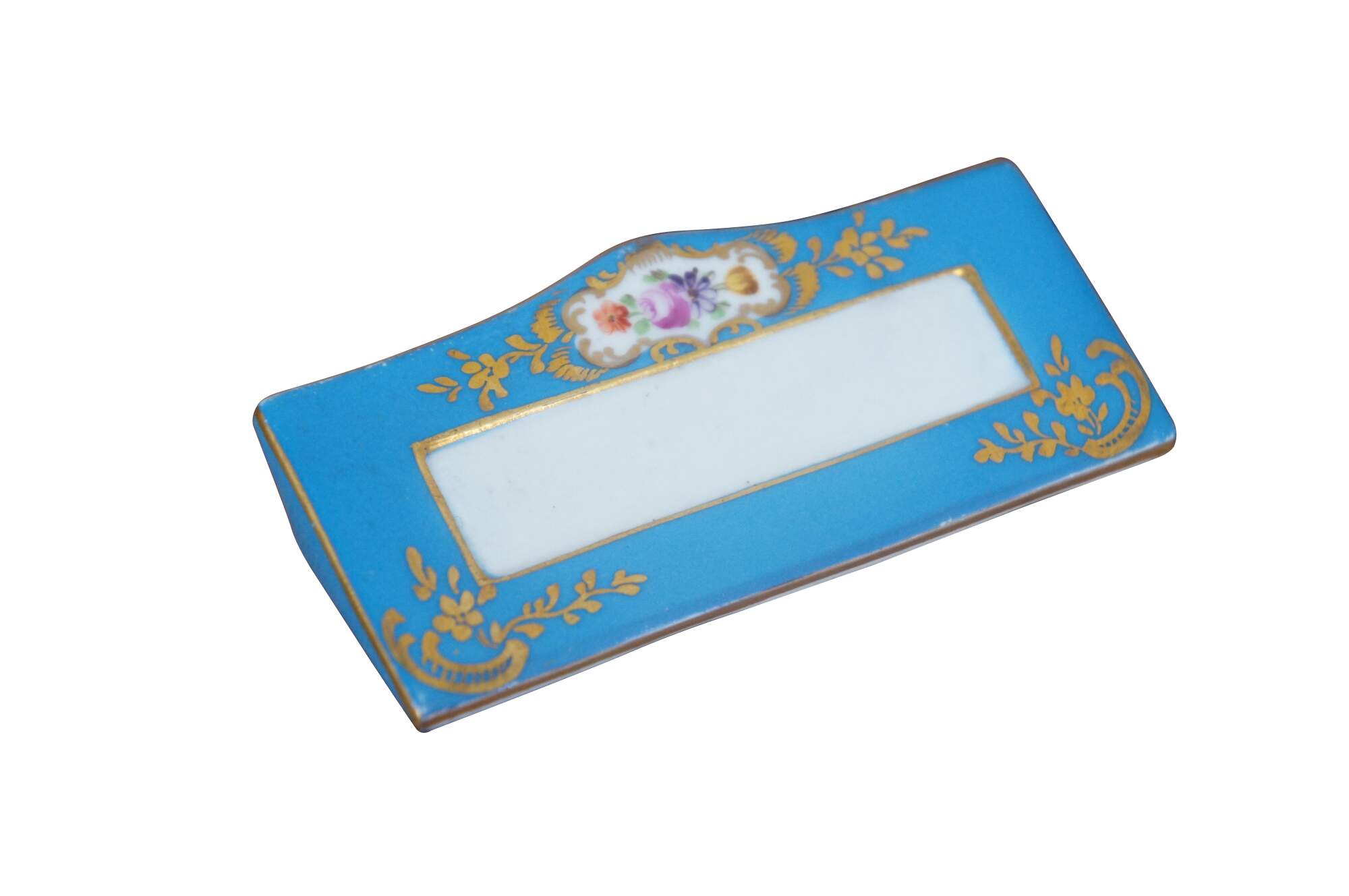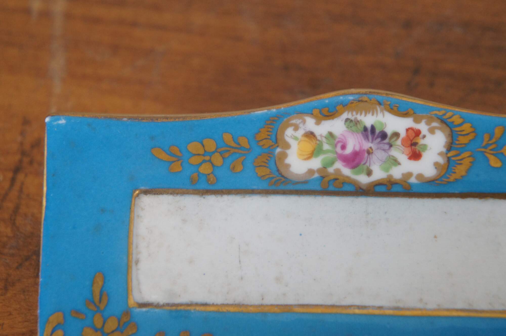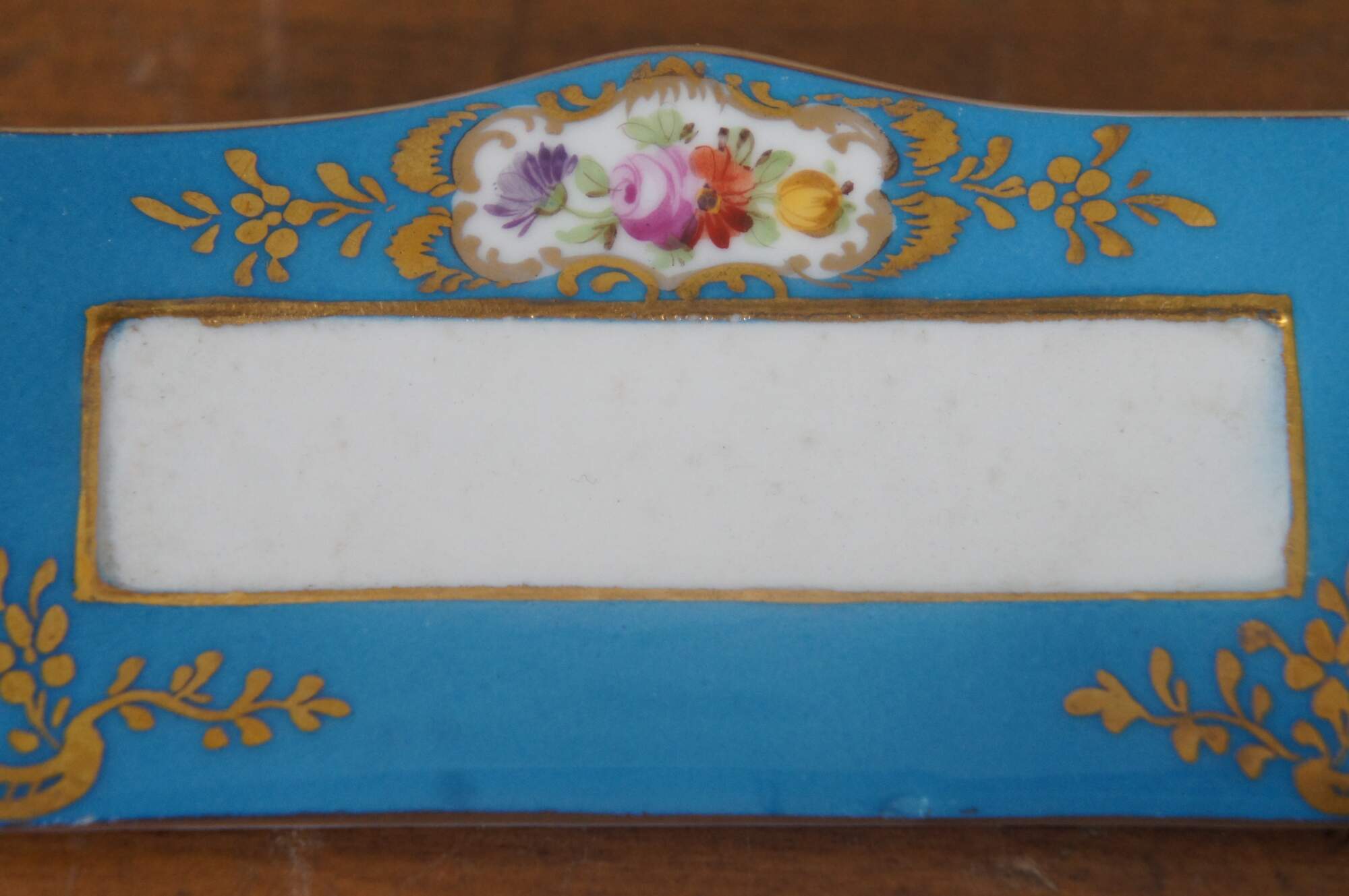 Ten antique German Dresden Saxony porcelain name plates featuring hand painted floral design in turquoise and gold.