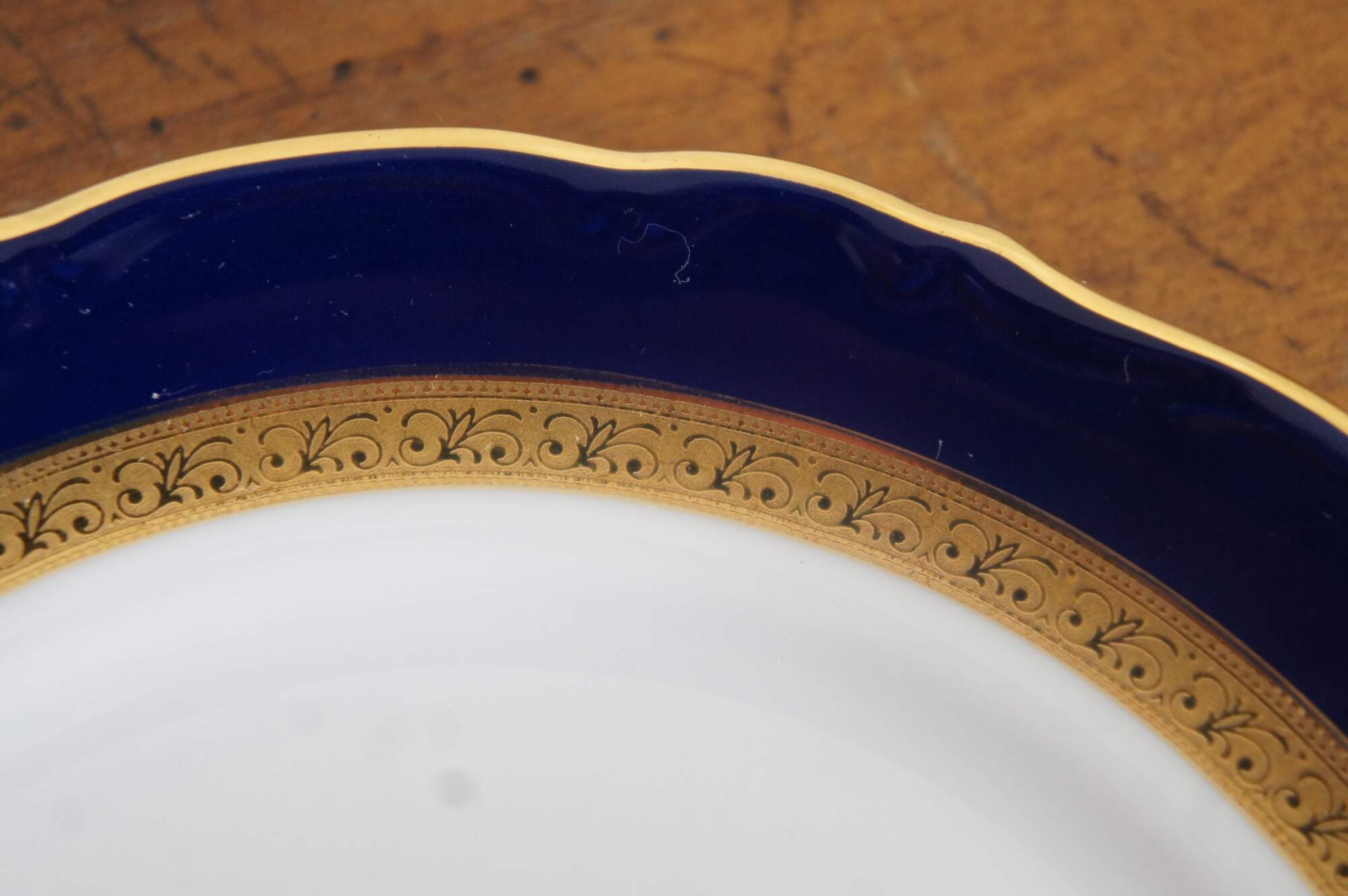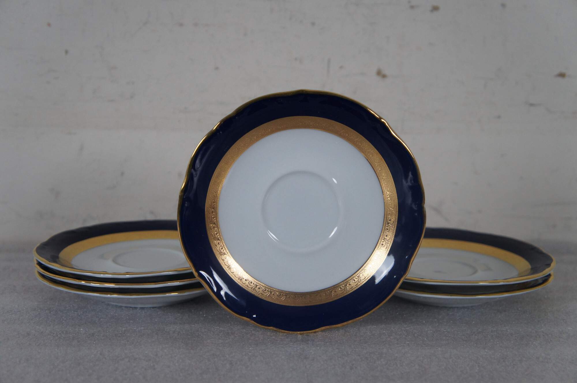 Vintage German Bavarian Wiuterliug Kirchenlomitz Echt Kobalt Scharffeuer china demitasse tea coffee set featuring teapot, creamer, sugar, cups, saucers and desert plates.