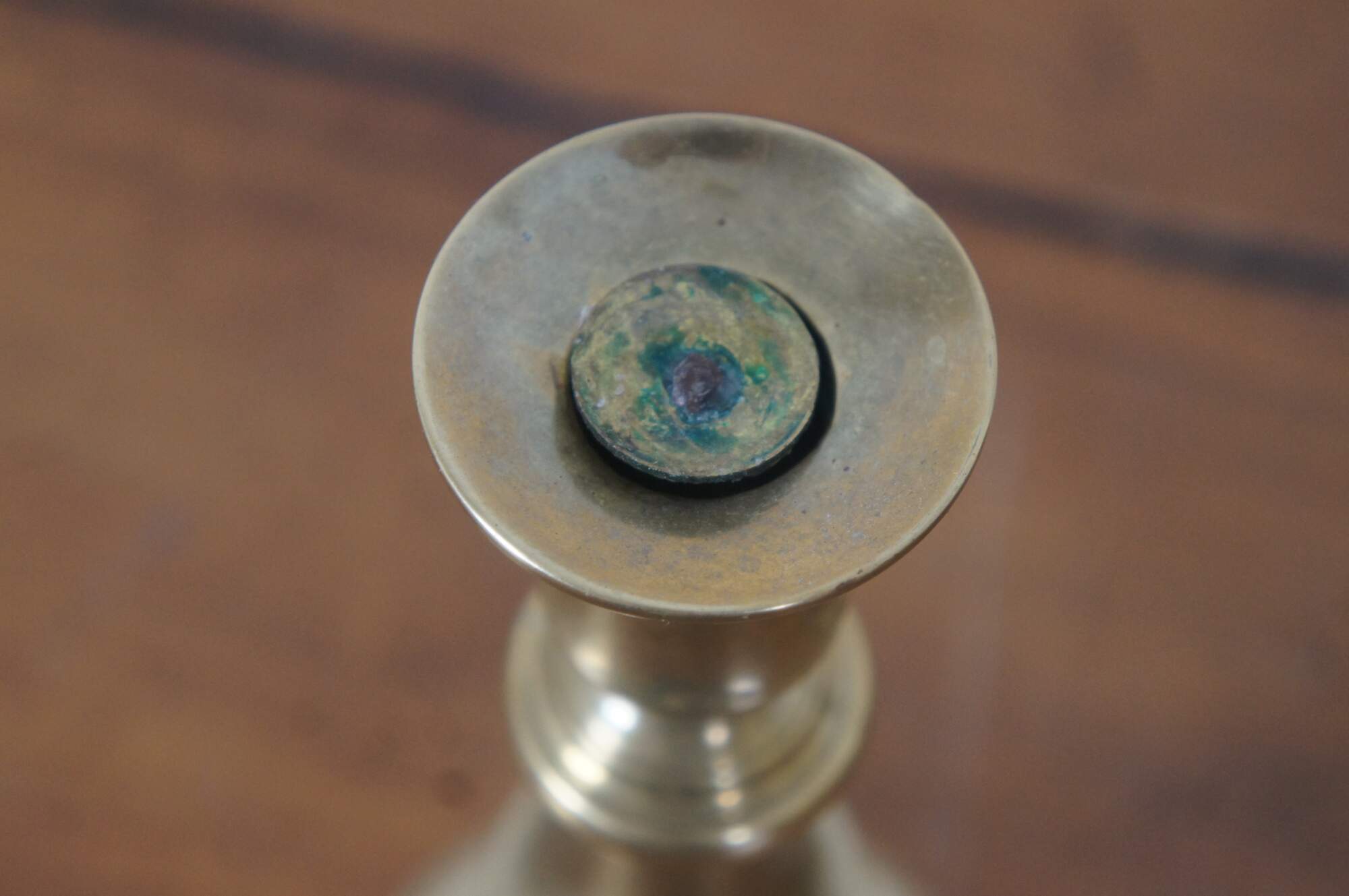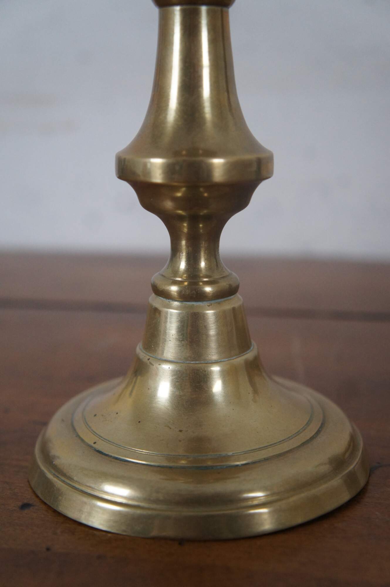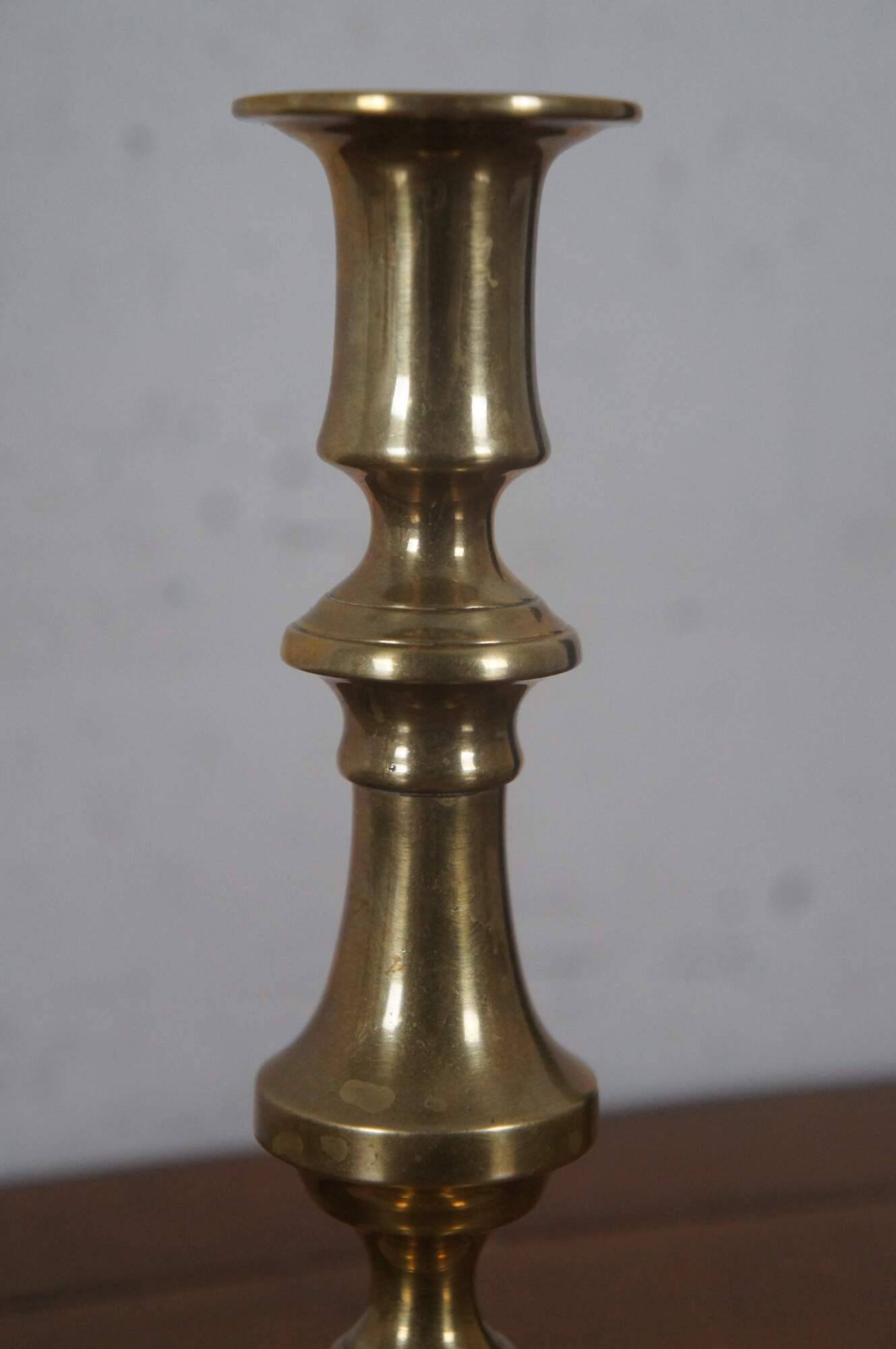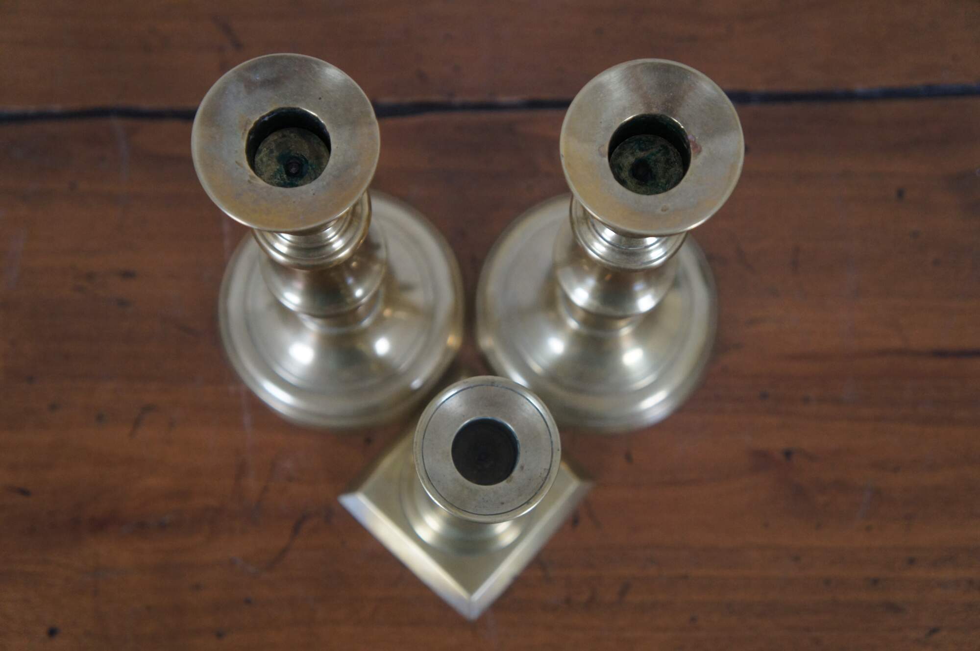 Three antique English brass candlesticks or candle holders featuring Queen Anne styling with push up rods.