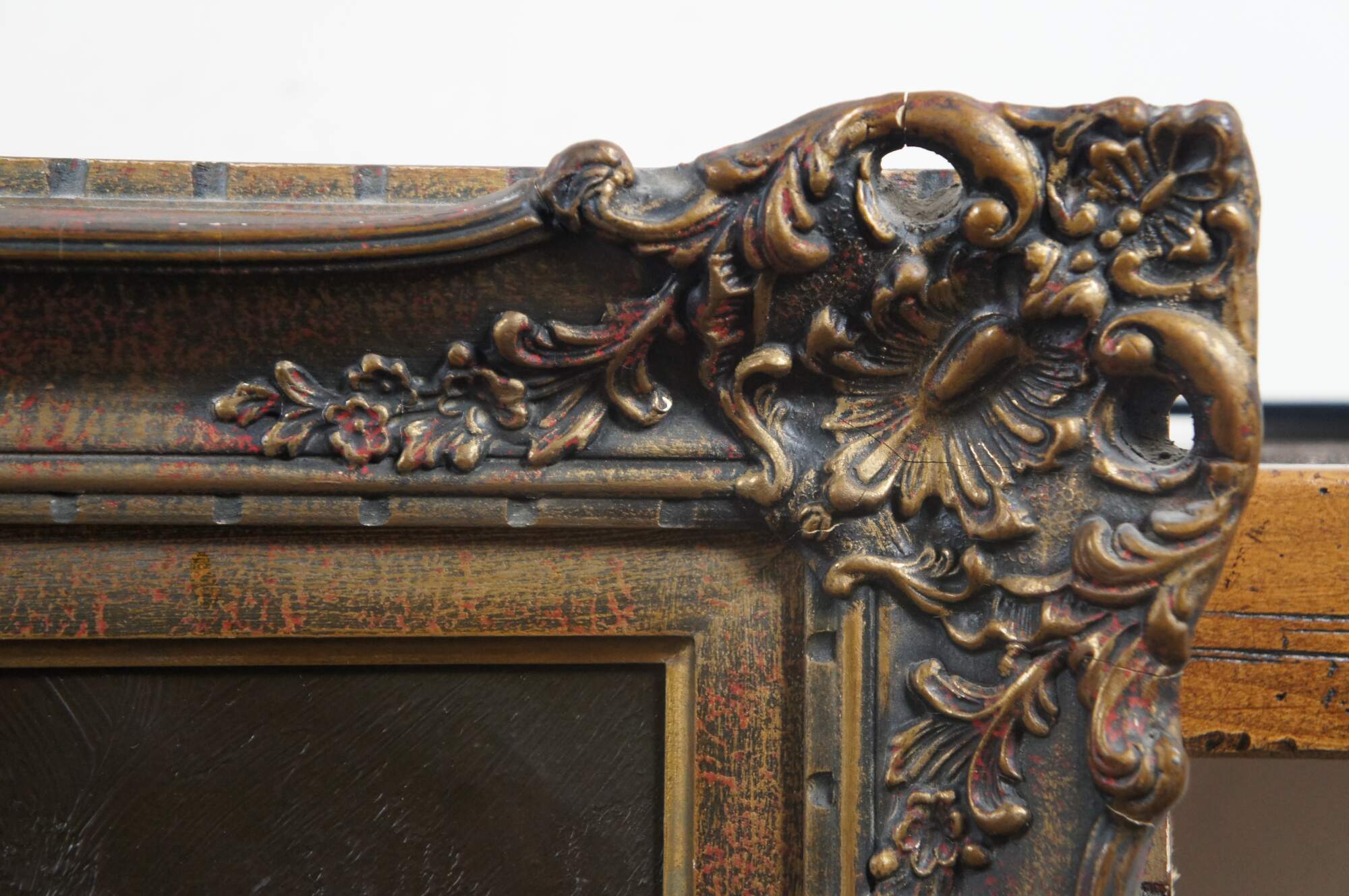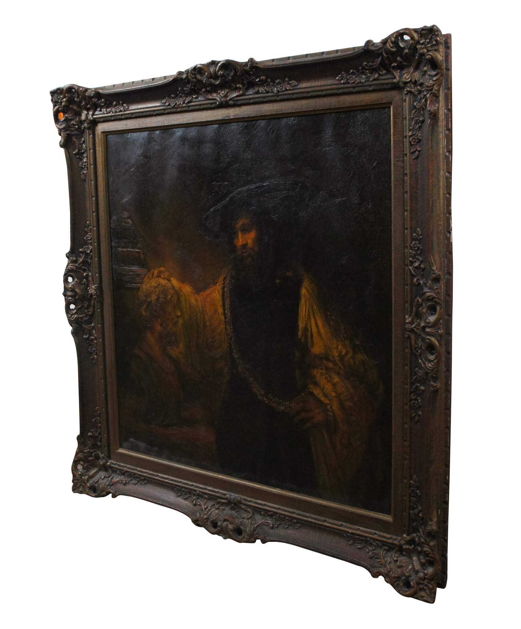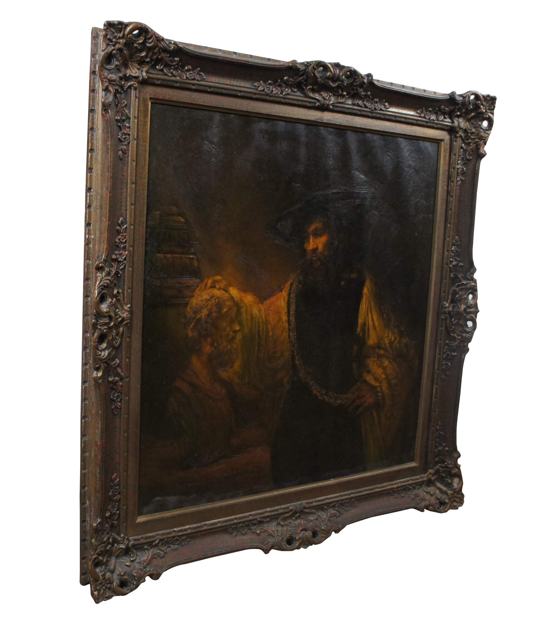 Vintage Aristotle with a bust of Homer Renaissance / philospher varnished print on canvas. Framed in ornate baroque floral frame by Goldcraft Studios of Canada.