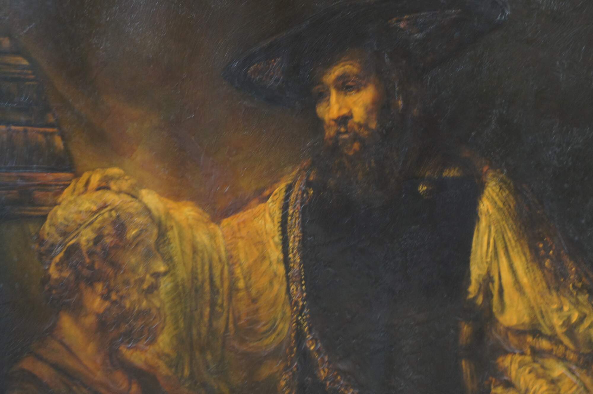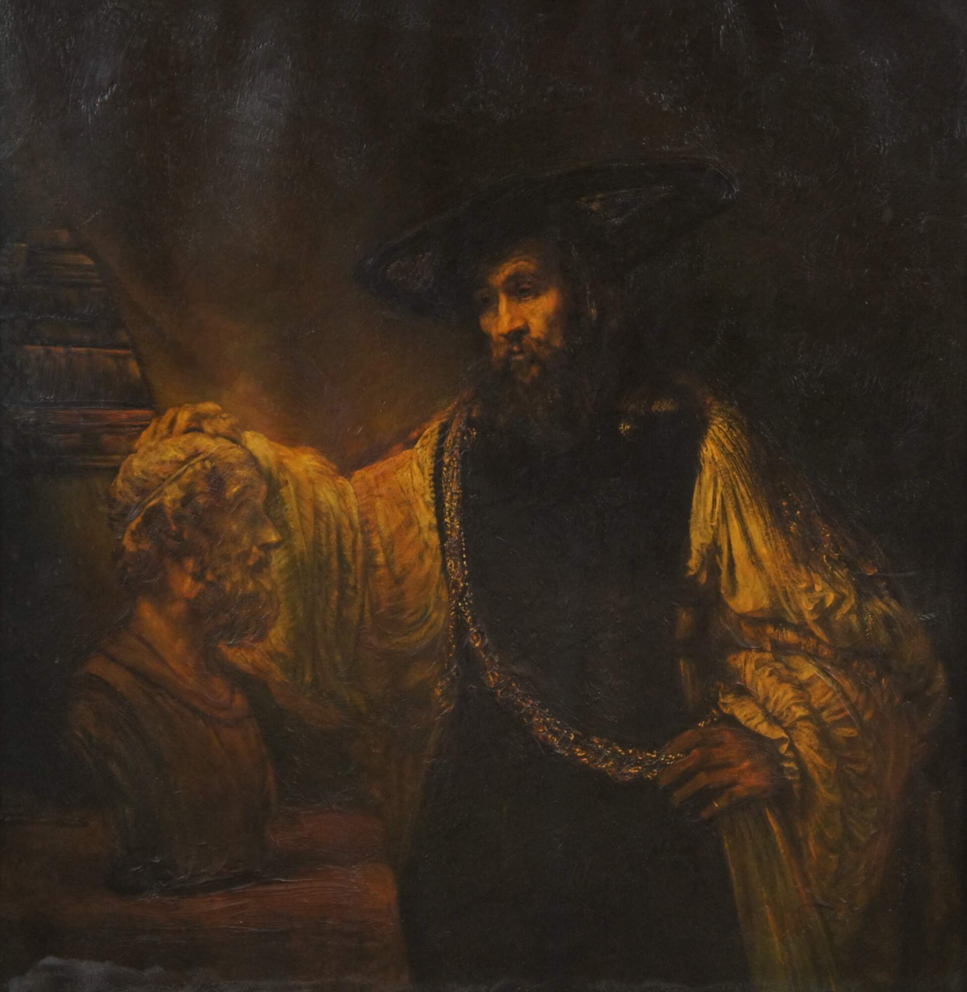 Aristotle with a Bust of Homer (Dutch: Aristoteles bij de buste van Homerus), also known as Aristotle Contemplating a Bust of Homer, is an oil-on-canvas painting by Rembrandt that depicts Aristotle wearing a gold chain and contemplating a sculpted bust of Homer. It was created as a commission for Don Antonio Ruffo's collection. It was bought and sold by several collectors until it was eventually purchased by the Metropolitan Museum of Art. The mysterious tone in the painting has led several scholars to different interpretations of Rembrandt's theme.
