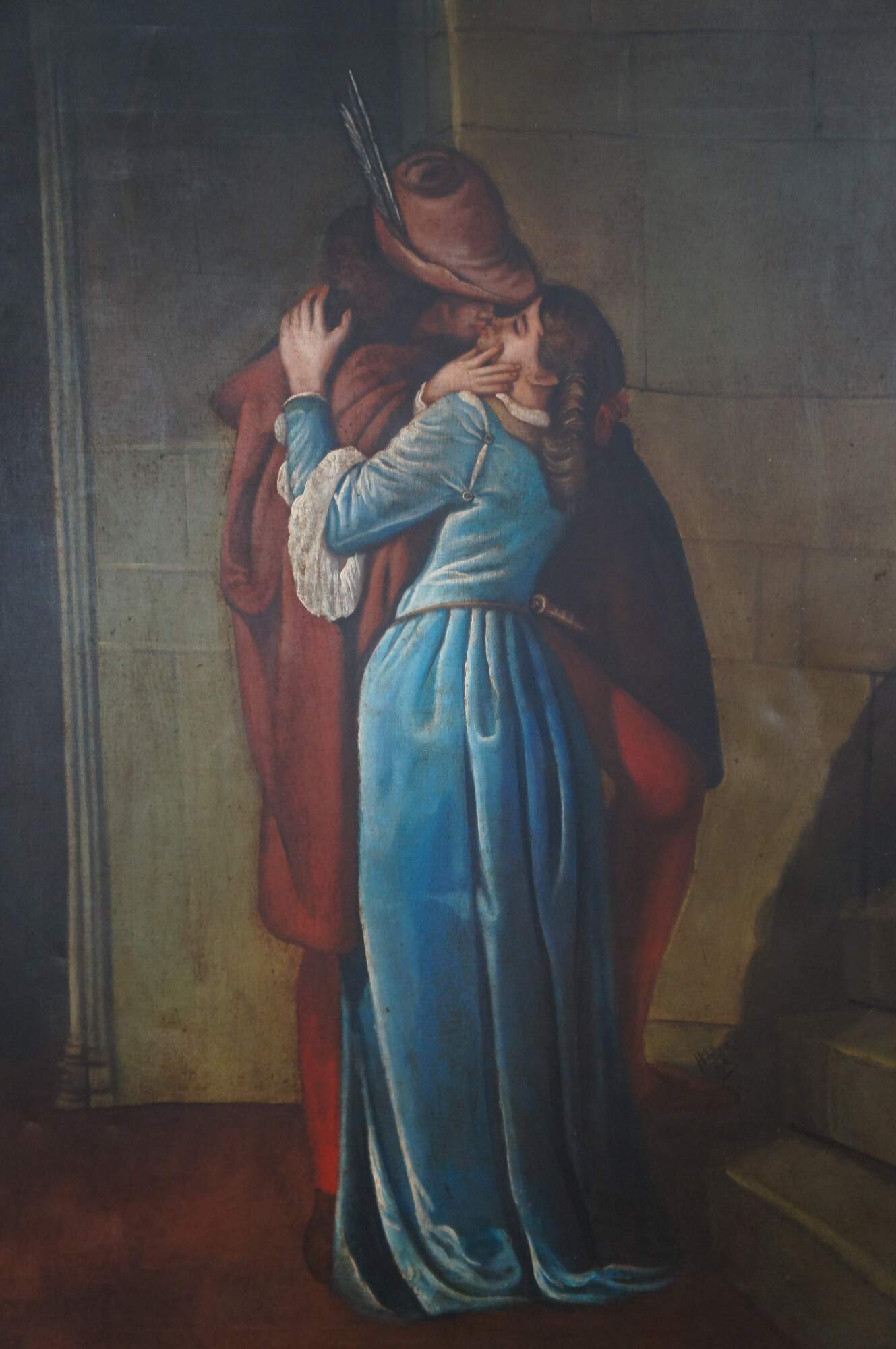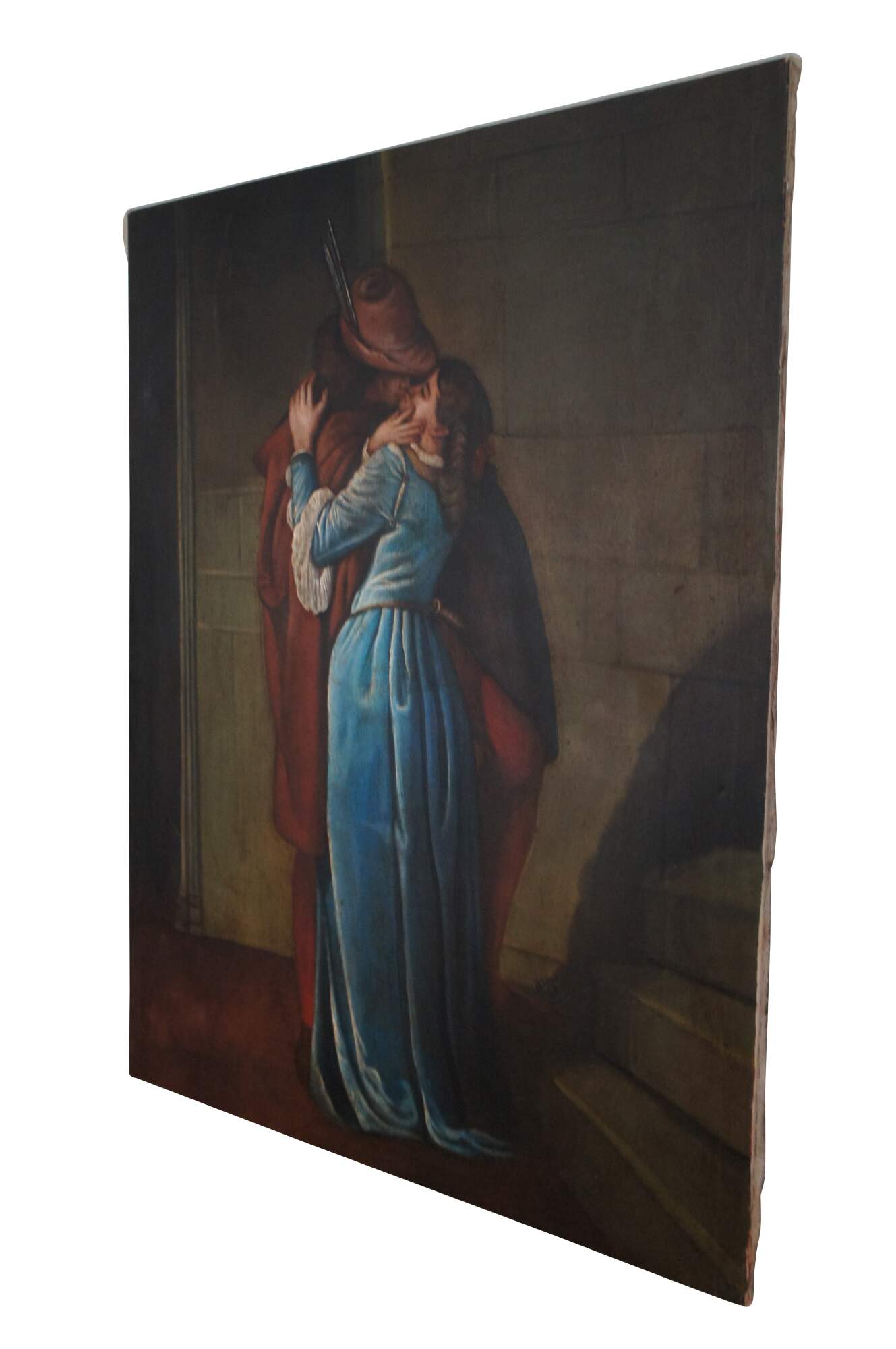 Vintage reproduction painting on linen by Hidalgo featuring The Kiss by Francesco Heyez.