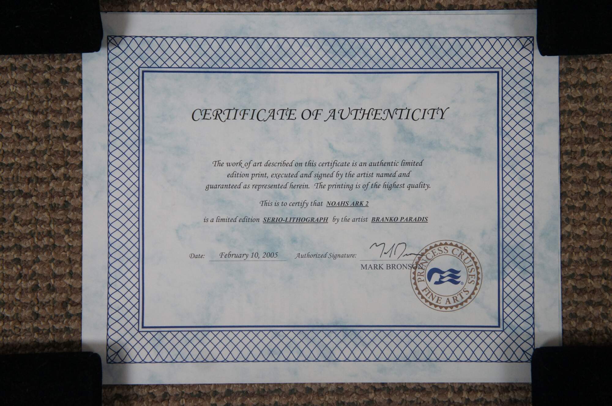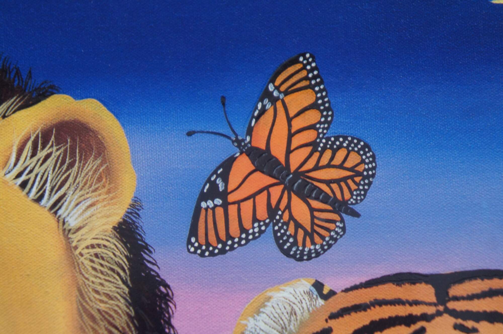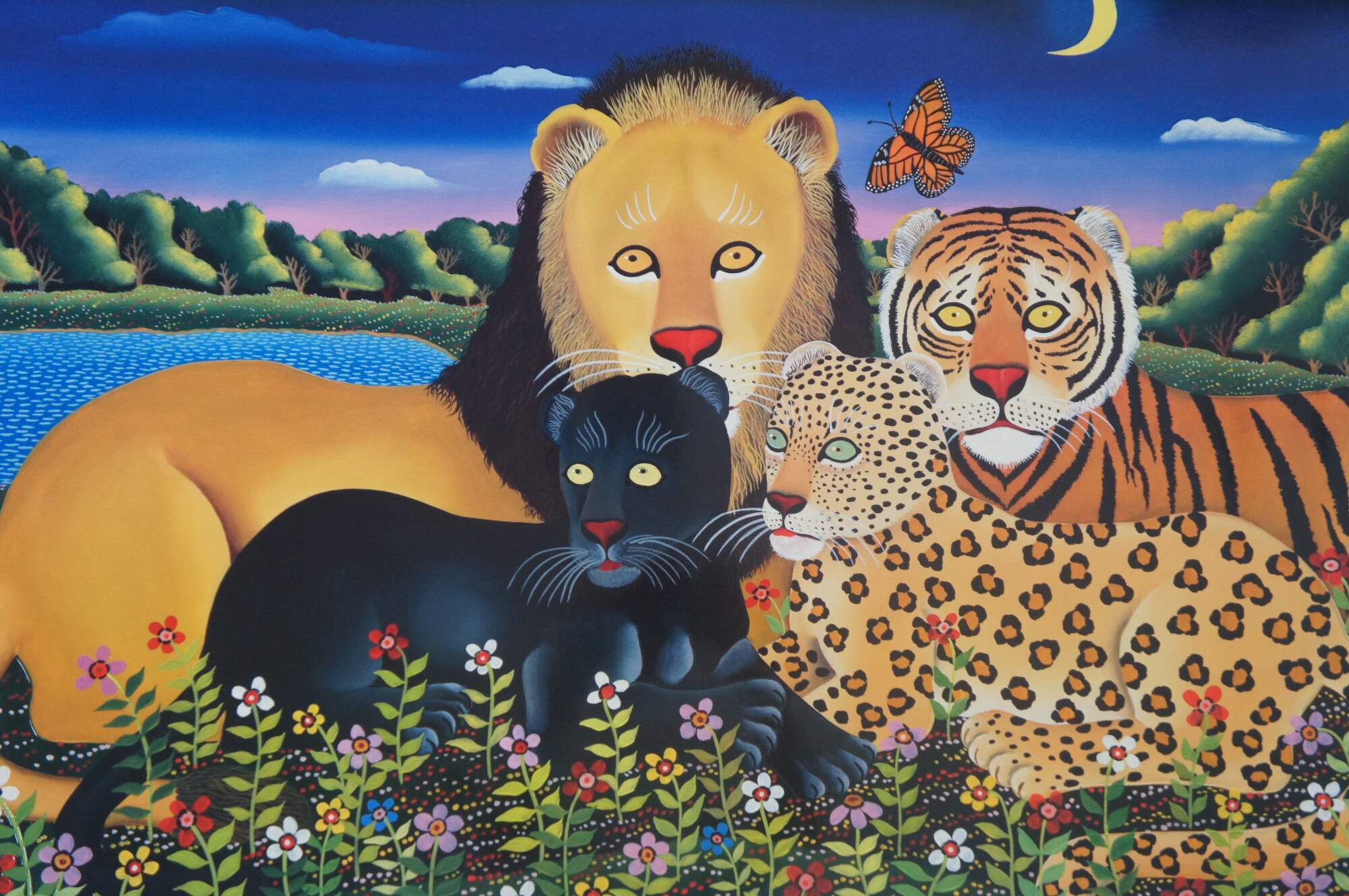 Vintage Branko Paradis Noahs Art II serio lithograph print featuring a grouping of big cats; lion, tiger, panther, cheetah and butterfly against a mountain / lake / floral landscape. Purchased on Princess Cruises Fine Art.