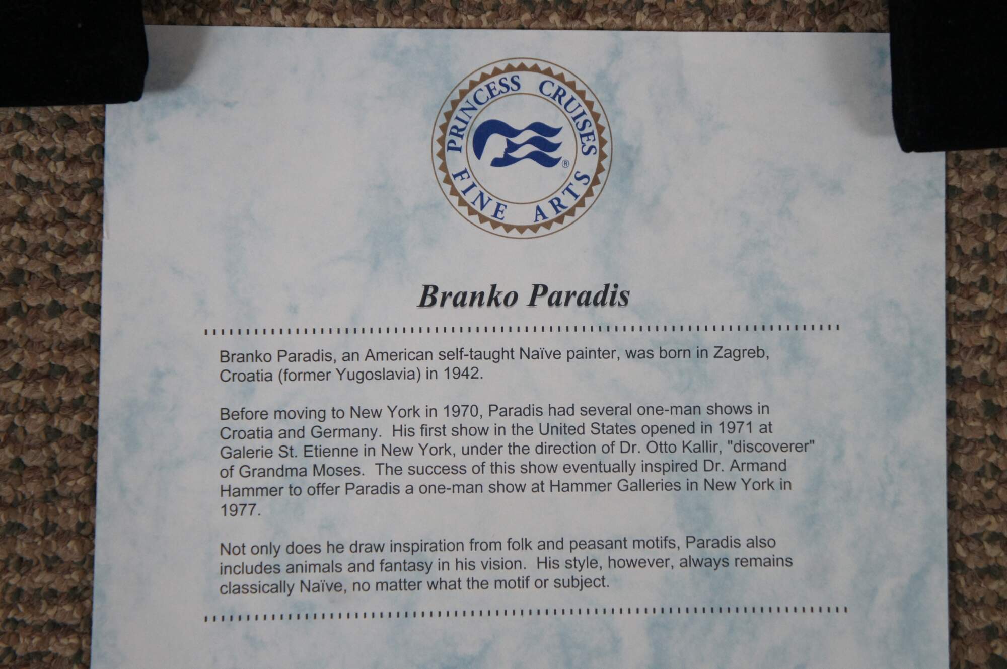 Branko Paradis, b.1942, American self taught Naive painter, born in Zagreb Croatia (Yugoslavia) in 1942. Part of a second generation group of painters known as Yugoslav Primitives, Paradis draws inspiration not only from folk and peasant motifs, but also includes African animals and other visionary impressions of his work. Whatever the motif, he remains true to his seemingly simple "naive" style, which gives us an innocence and honesty that is missed in modern life. His charming and masterful work continues to delight admirers both in the United States and Europe.
