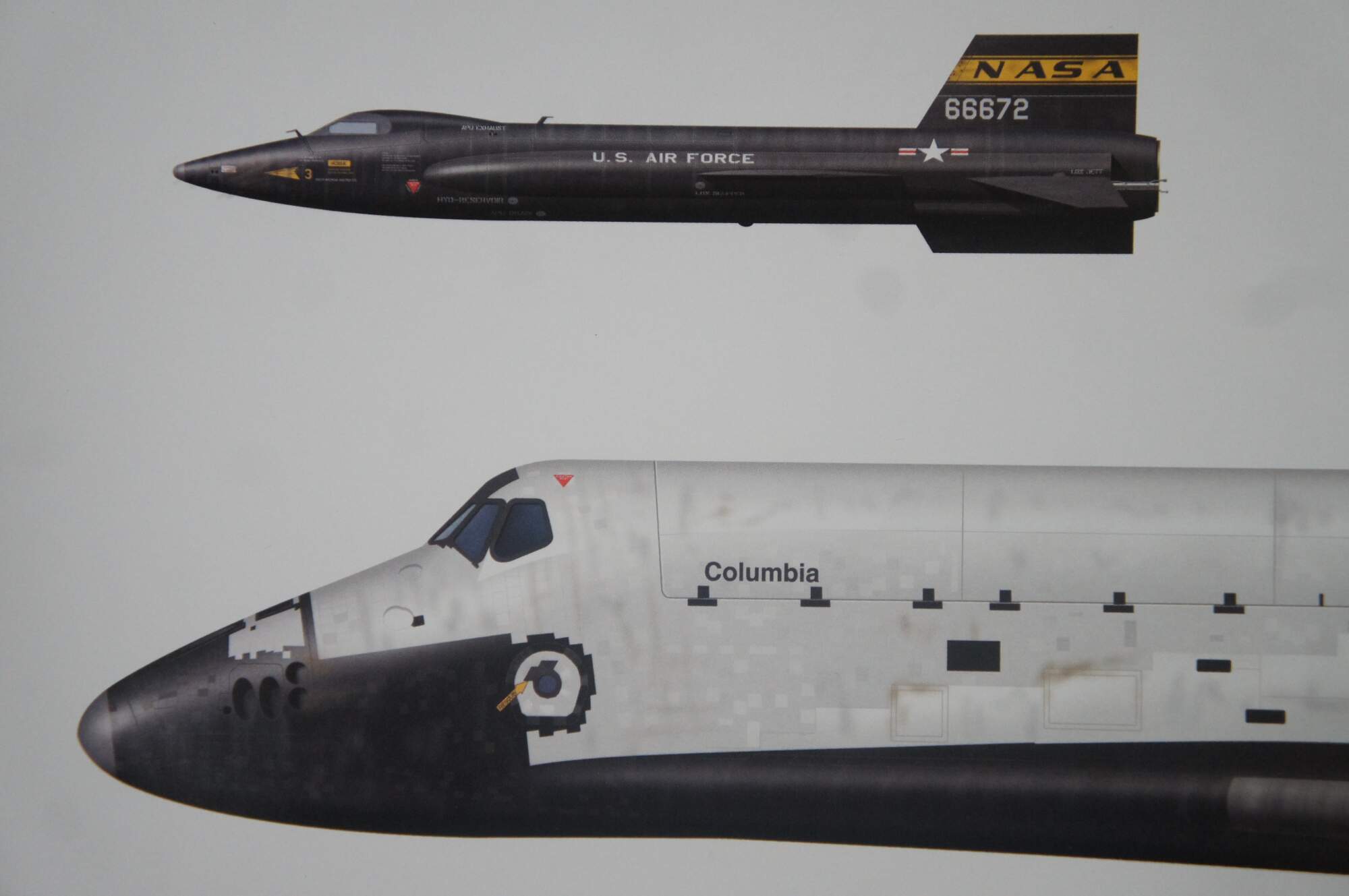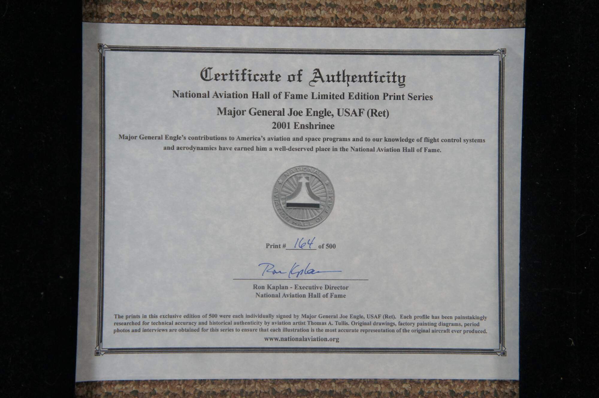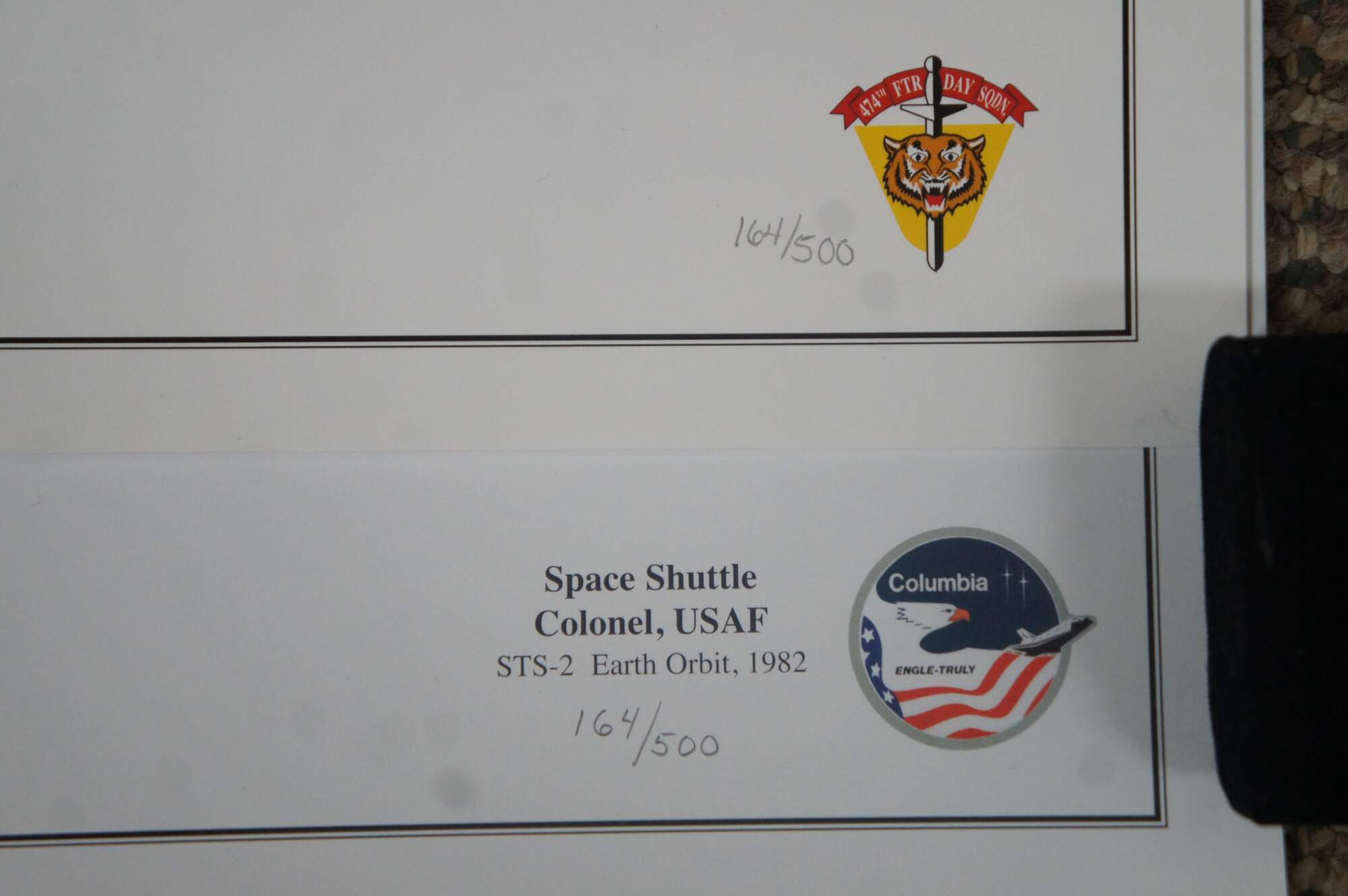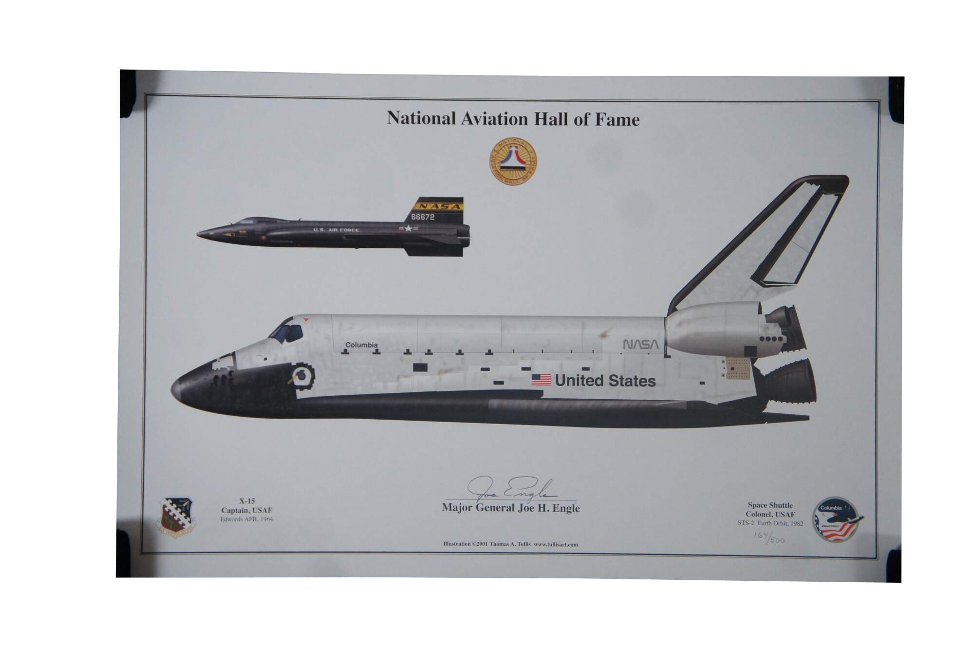 Two National Aviation Hall of Fame signed poster prints by Thomas Tullis. Features a US Air Force FW 731, and United States Columbia NASA Space Shuttle. Both signed by Joe Engle.