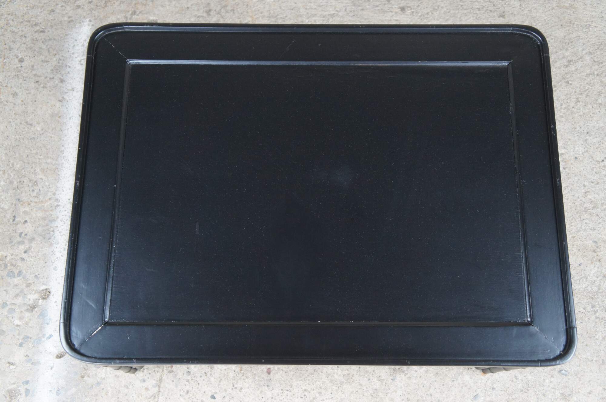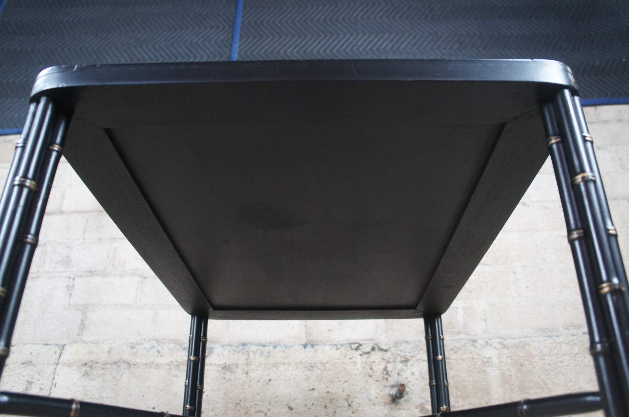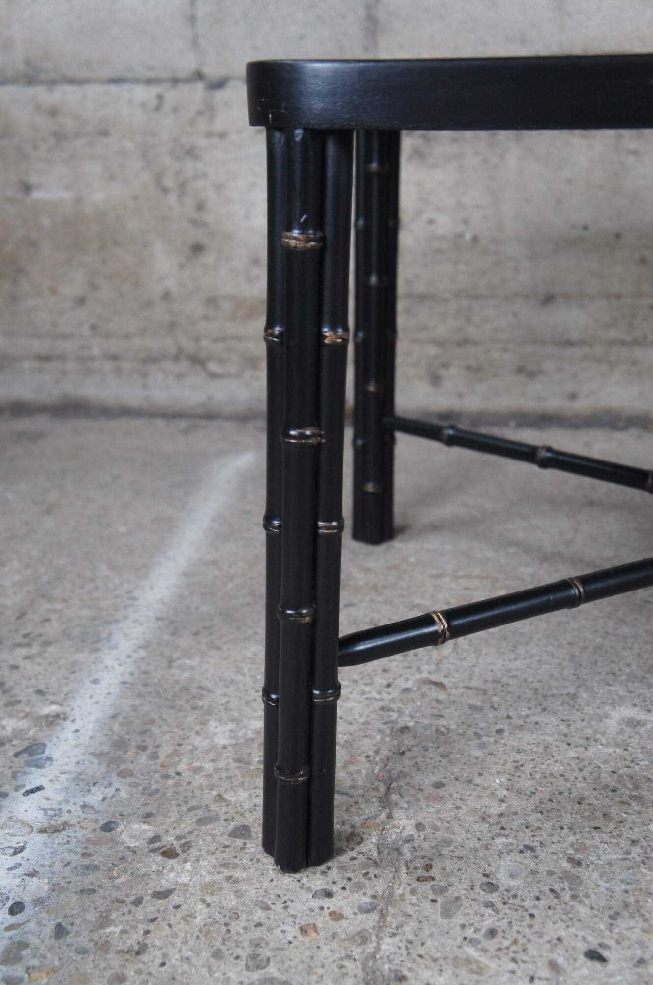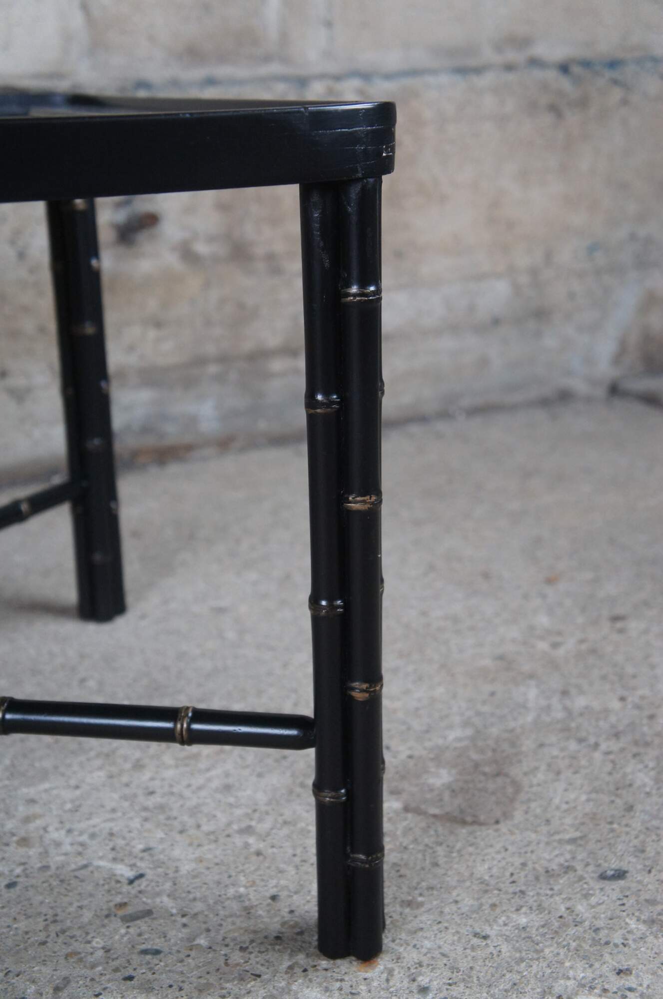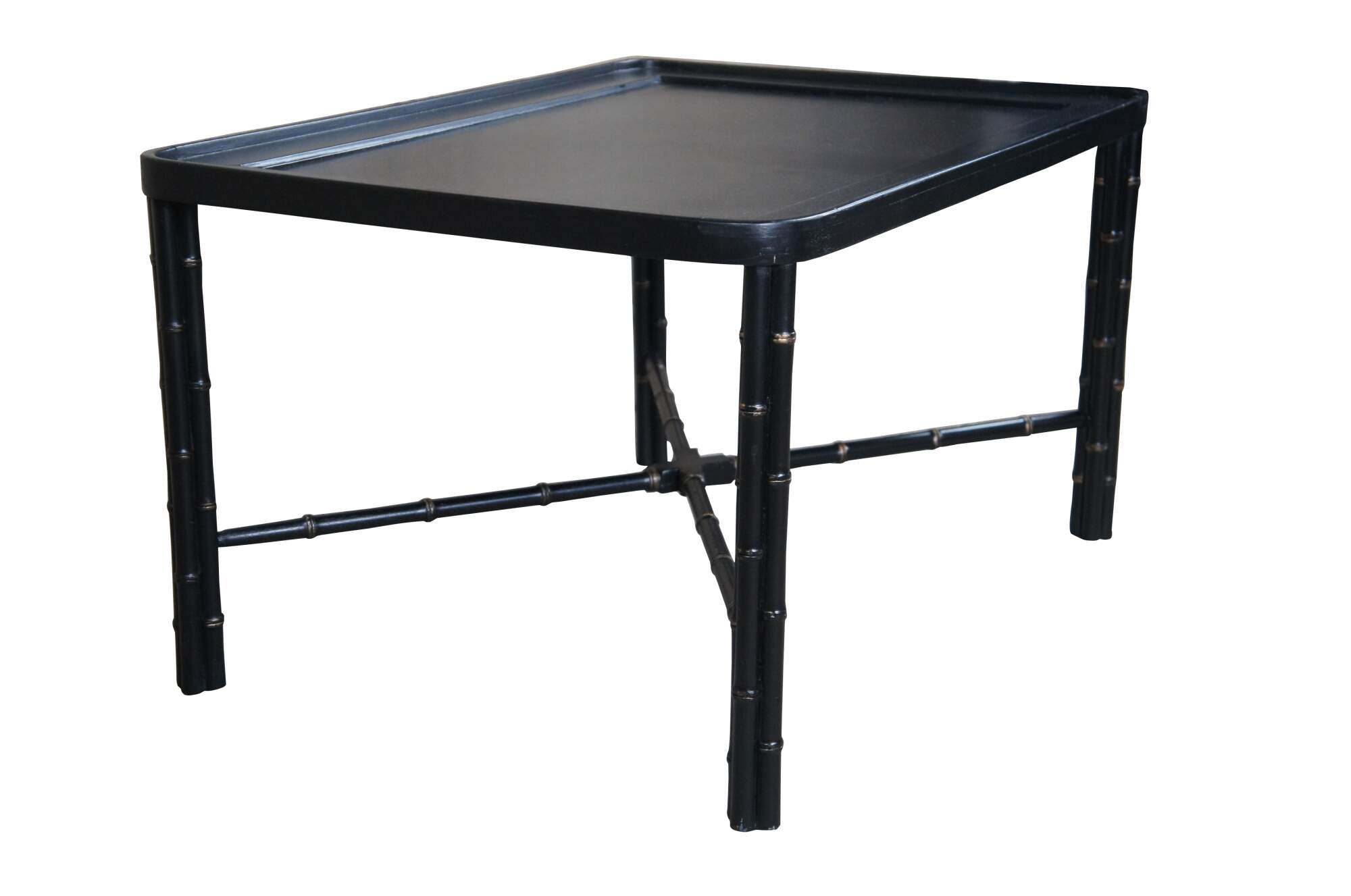 Vintage black lacquered / ebonized Chinese chinoiserie / Regency style coffee or cocktail table featuring rectangular form with faux bamboo legs connected by X stretcher.