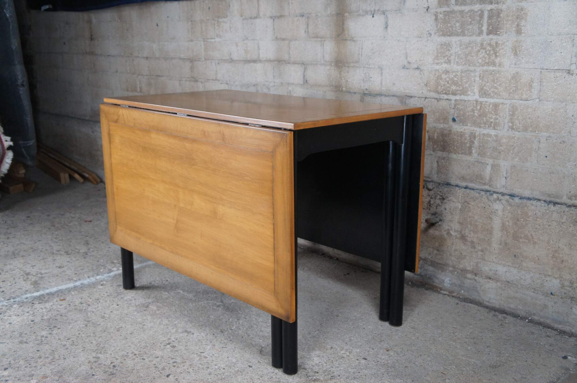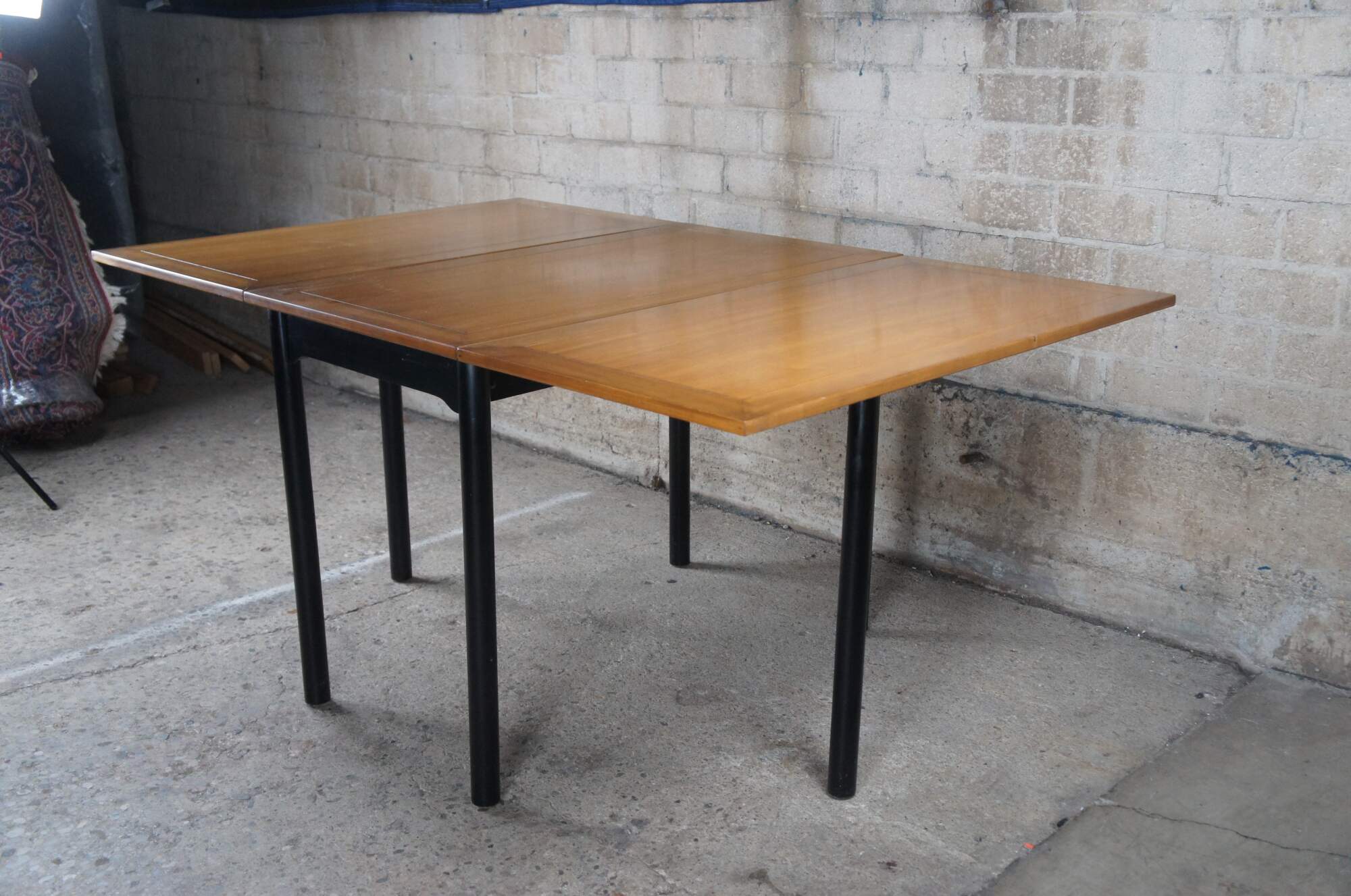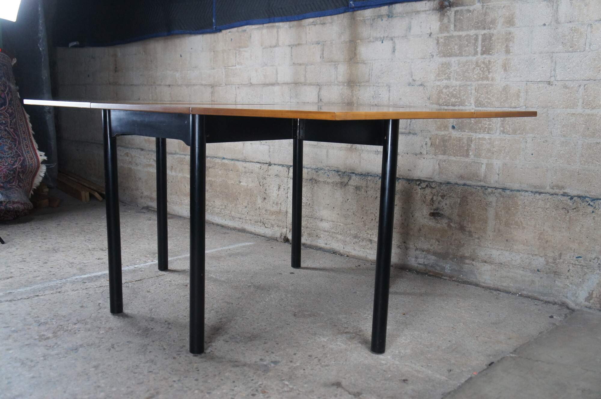 Vintage maple drop leaf rectangular dining table featuring black painted base.