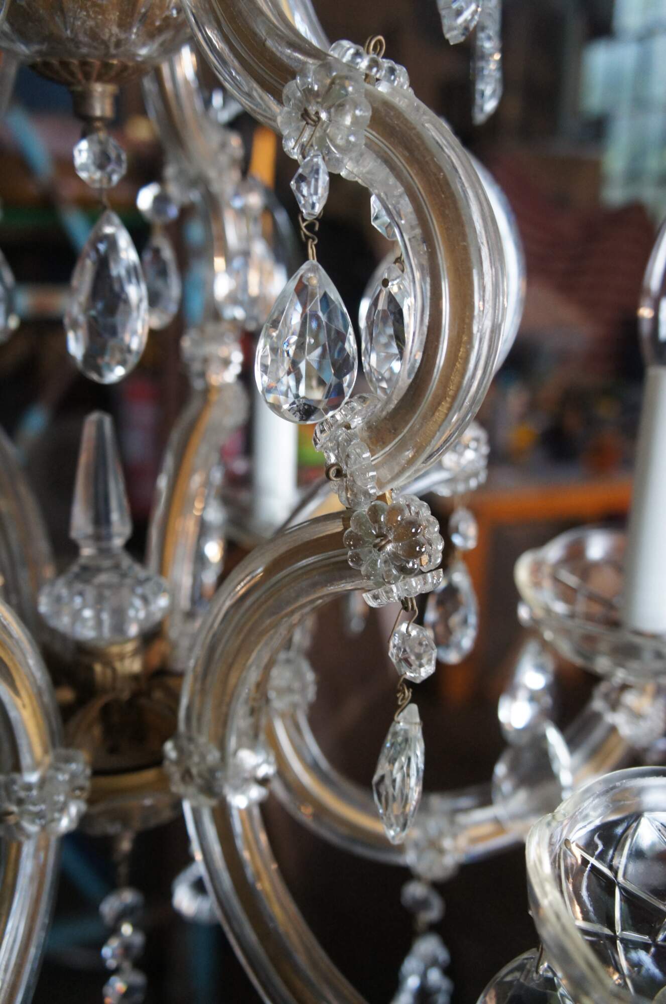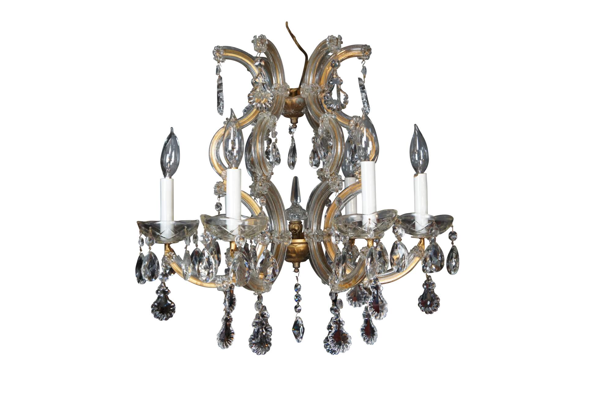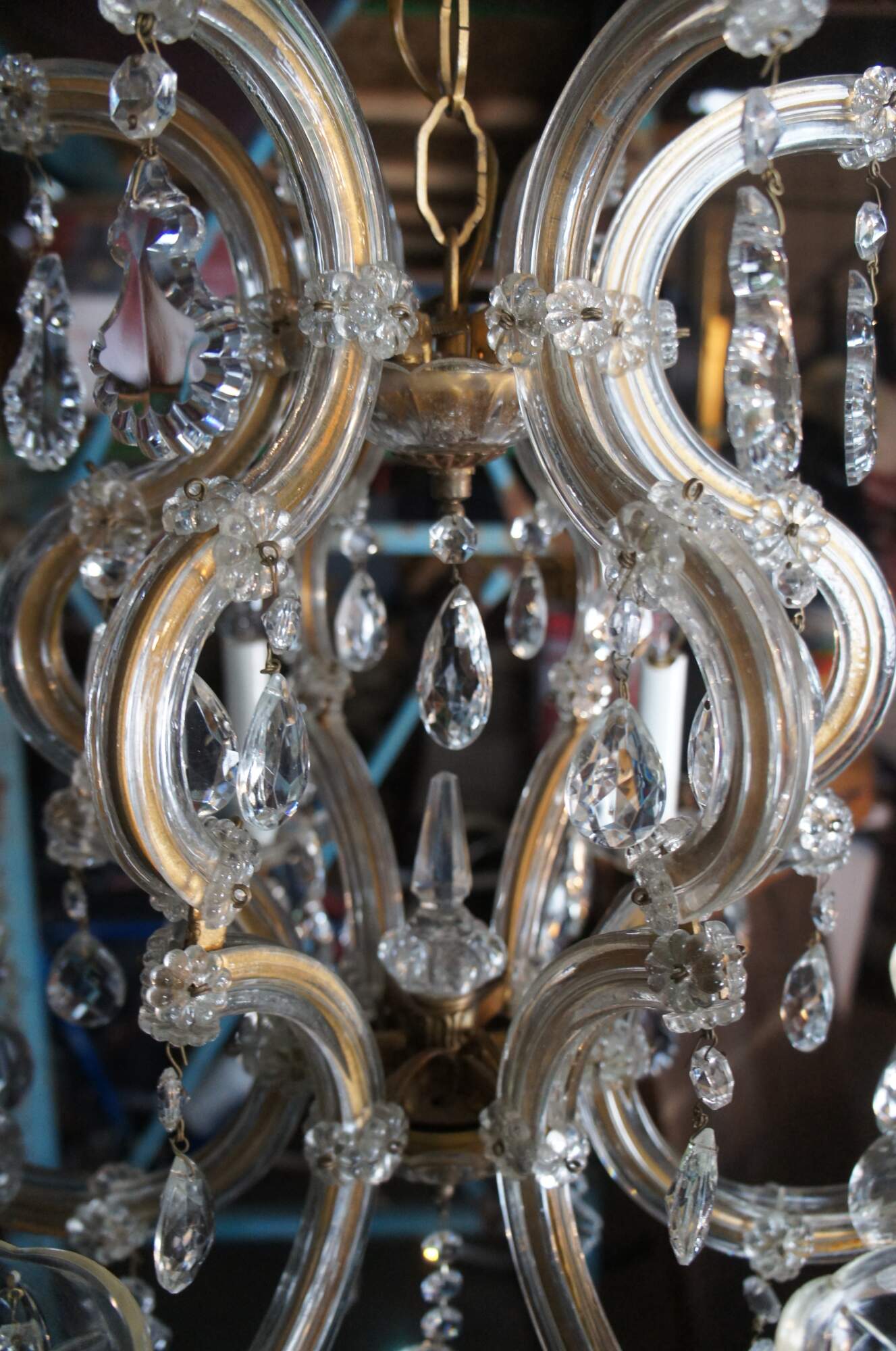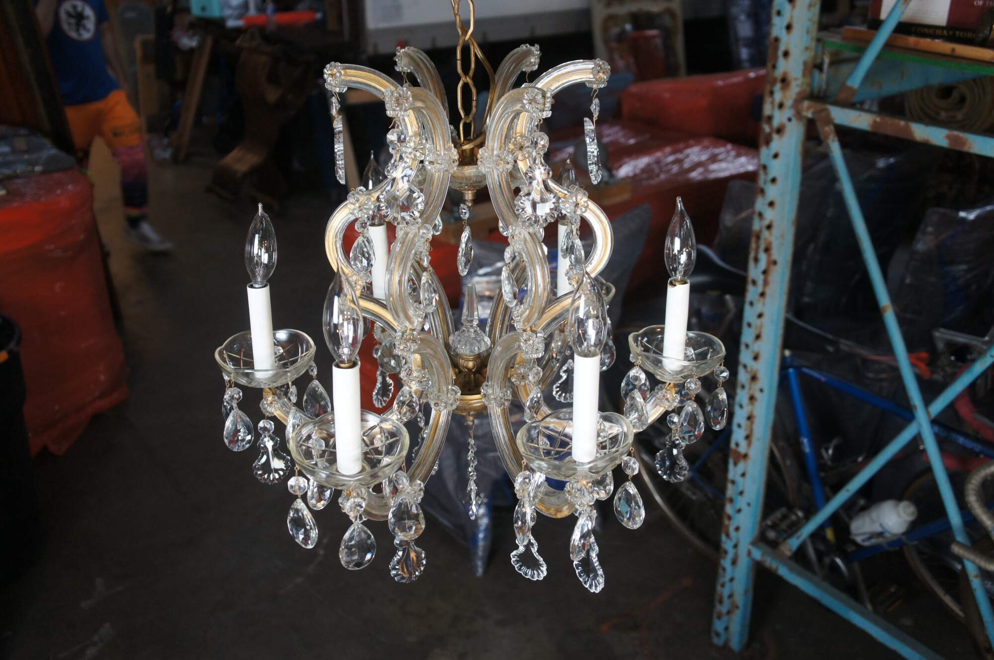Vintage French Marie Therese glass clad brass drop crystal six arm chandelier featuring serpentine form with candlestick lights.